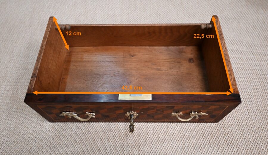 Il comporte sept tiroirs dont chacun est équipé de deux poignées en miroir, d’une entrée bronze et d’une serrure fonctionnelle, le tout d’origine.