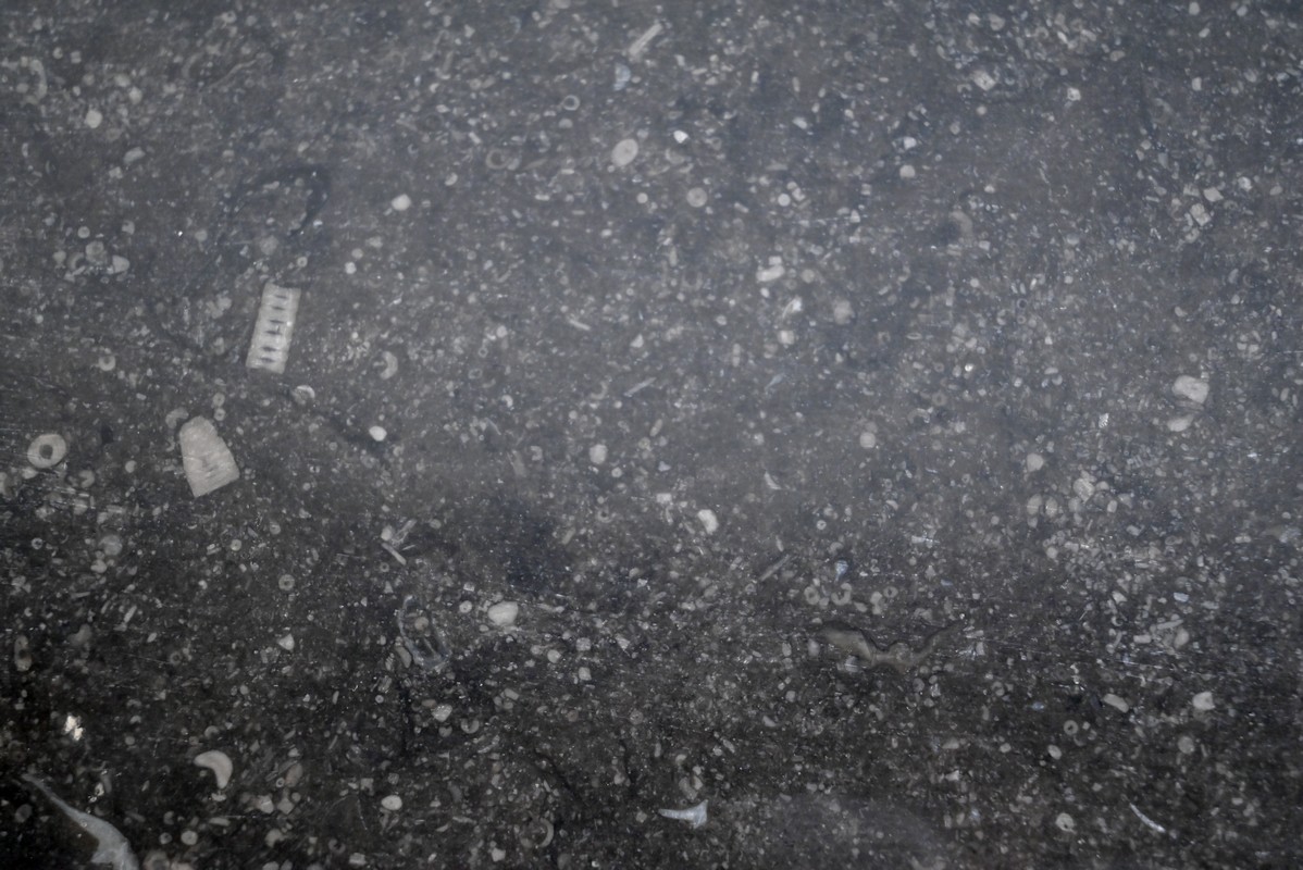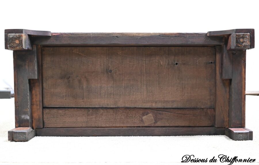 Les montants, droits, viennent épouser une plinthe à débords qui se termine par quatre pieds d’angle.