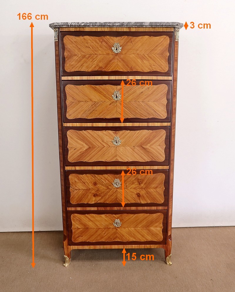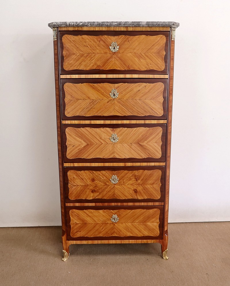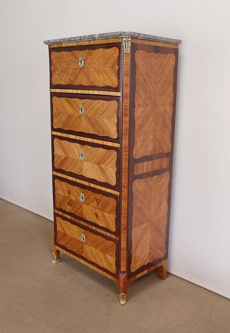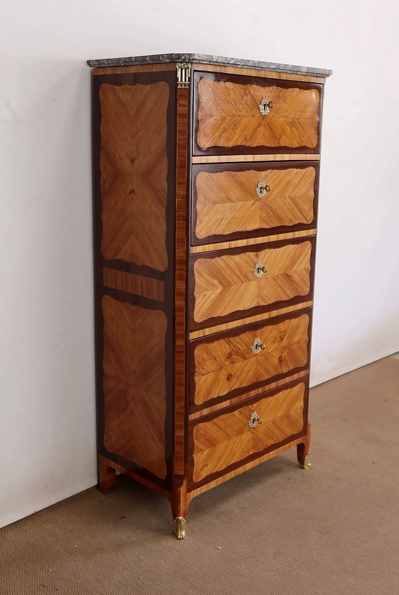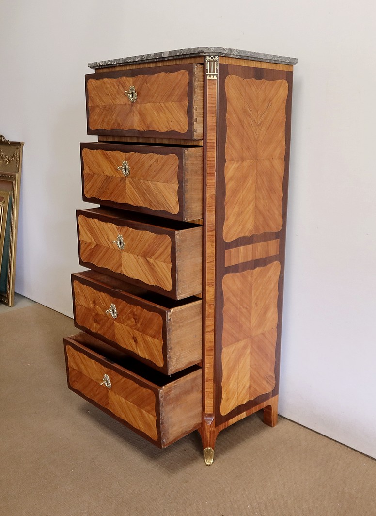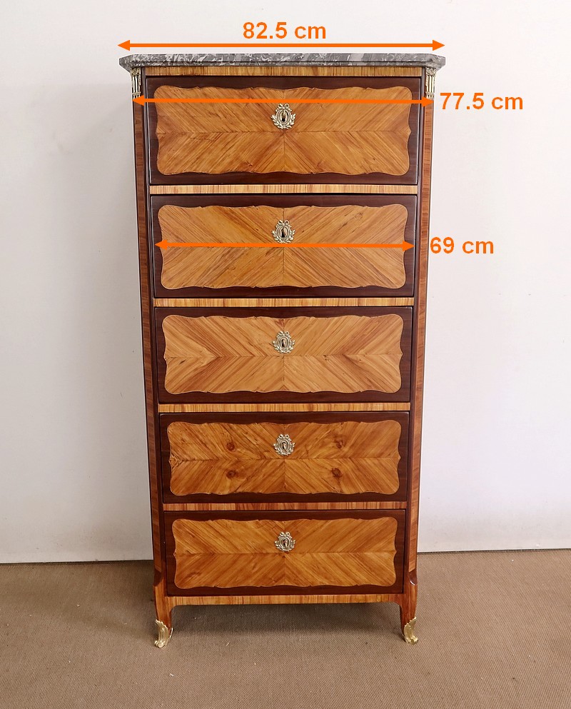 Grand chiffonnier du XVIIIe siècle, en marqueterie de bois de rose, d’amarante et de citronnier, sommé d’un marbre Saint-Anne d’origine.