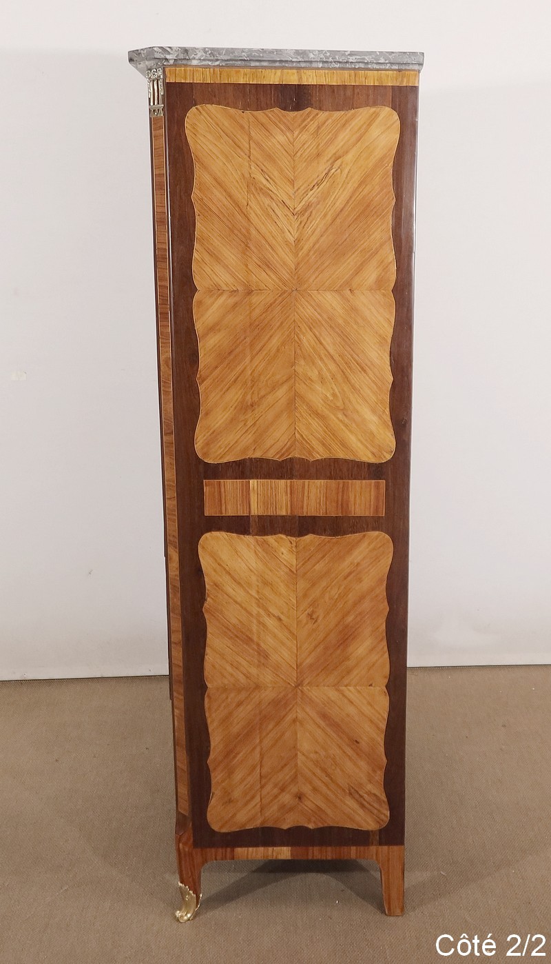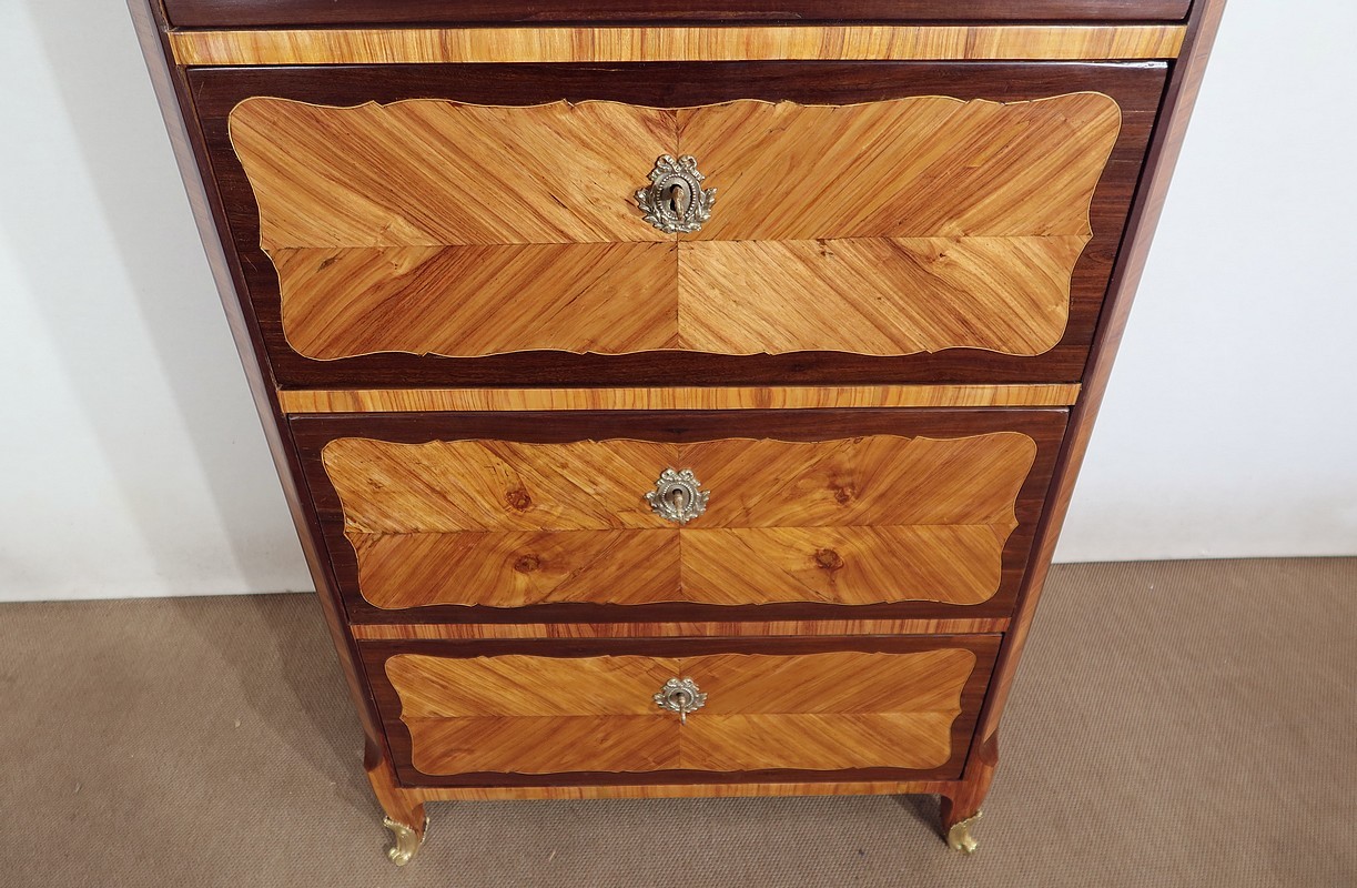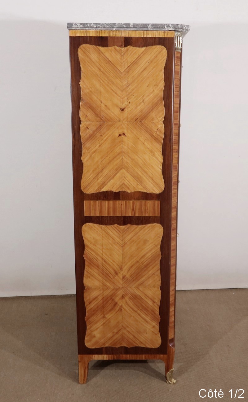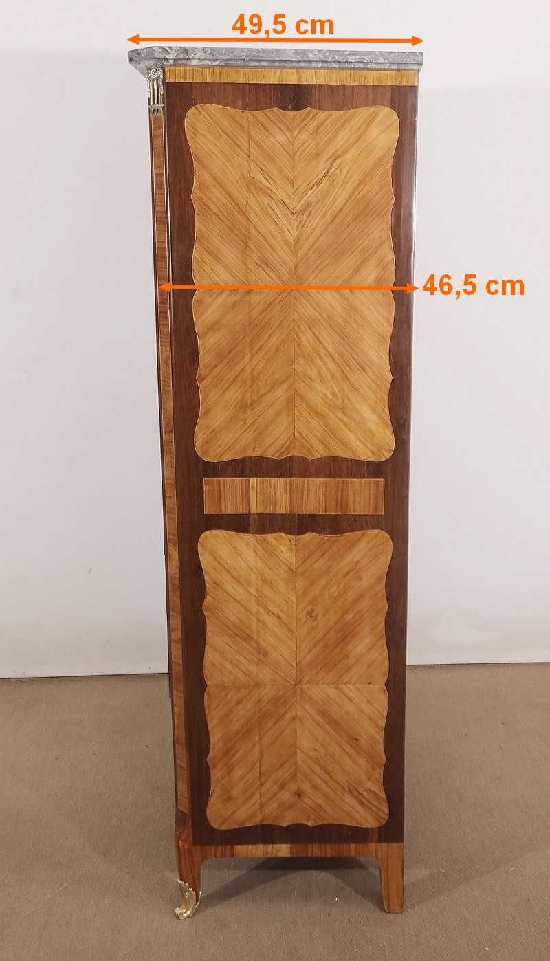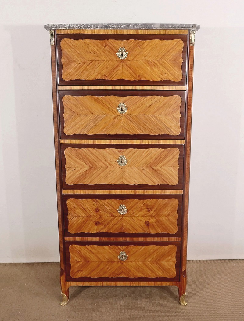 Grand chiffonnier du XVIIIe siècle, en marqueterie de bois de rose, d’amarante et de citronnier, sommé d’un marbre Saint-Anne d’origine.