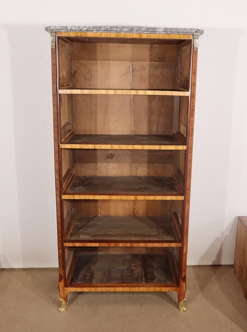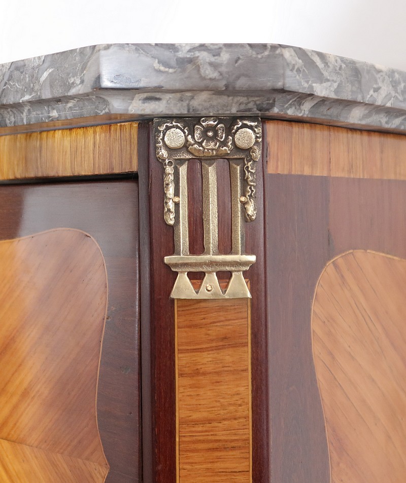 Les montants à pans coupés avec au centre une marqueterie de bois de rose horizontale entourée d’un filet de citronnier, se terminent par des pieds bosse légèrement galbés et décorés par un sabot en bronze d’origine.