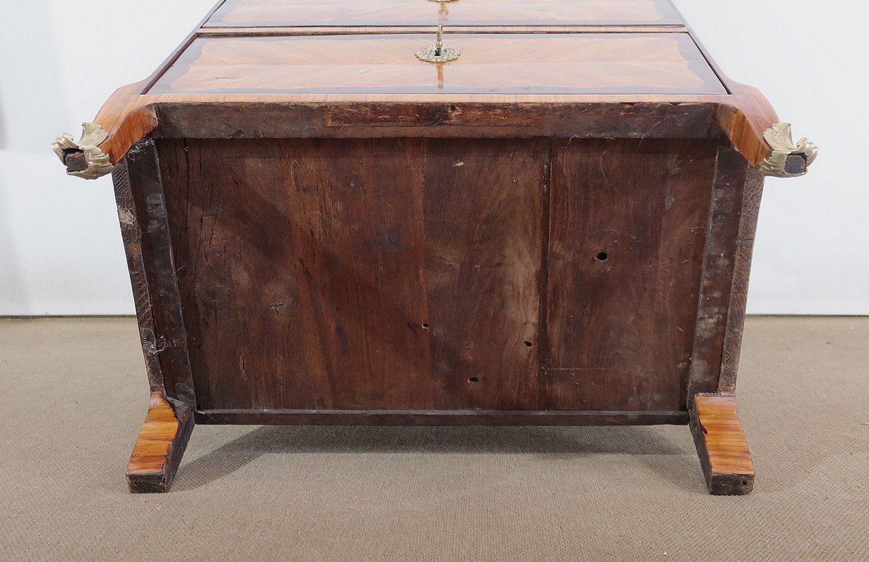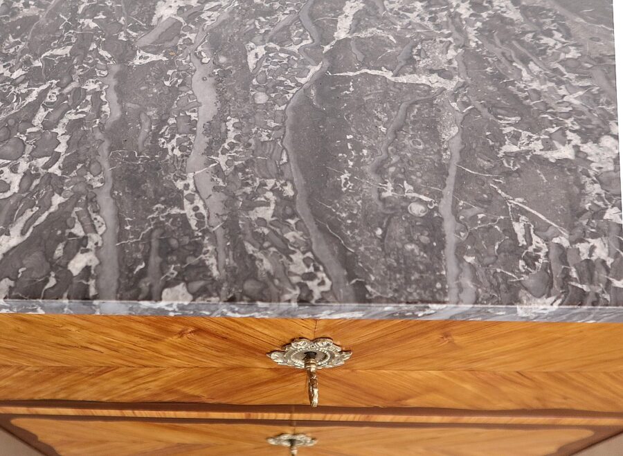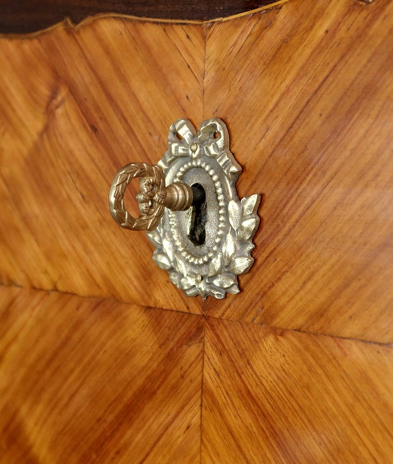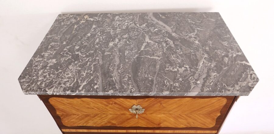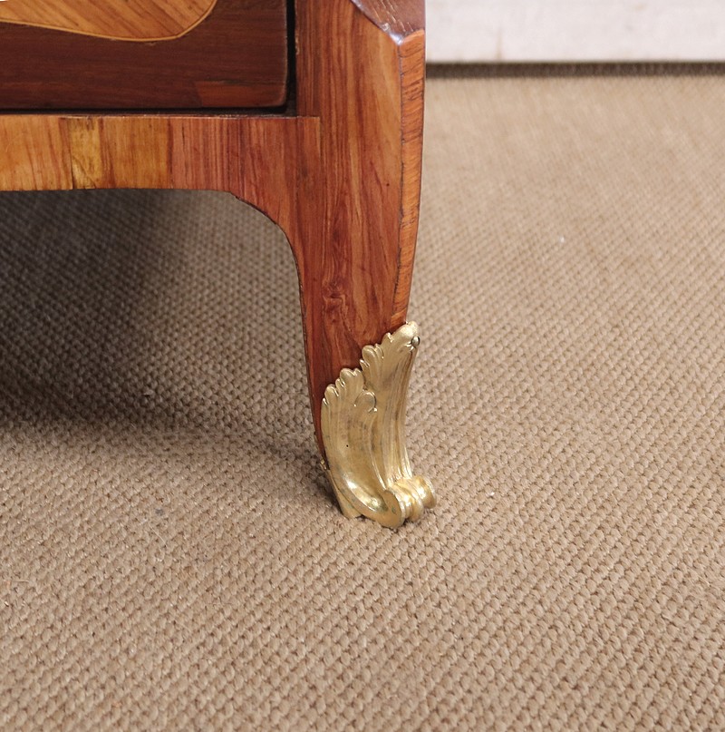 Ce meuble raffiné est pourvu de cinq grands tiroirs, dont la façade est plaquée de bois de rose en ailes de papillons et entourée d’un pourtour mouvementé en amarante. Celui-ci est agrémenté d’un filet de citronnier.