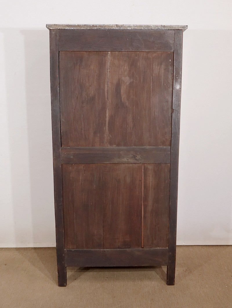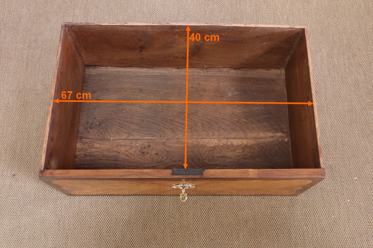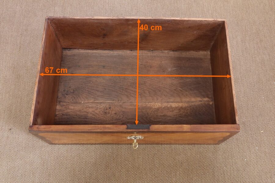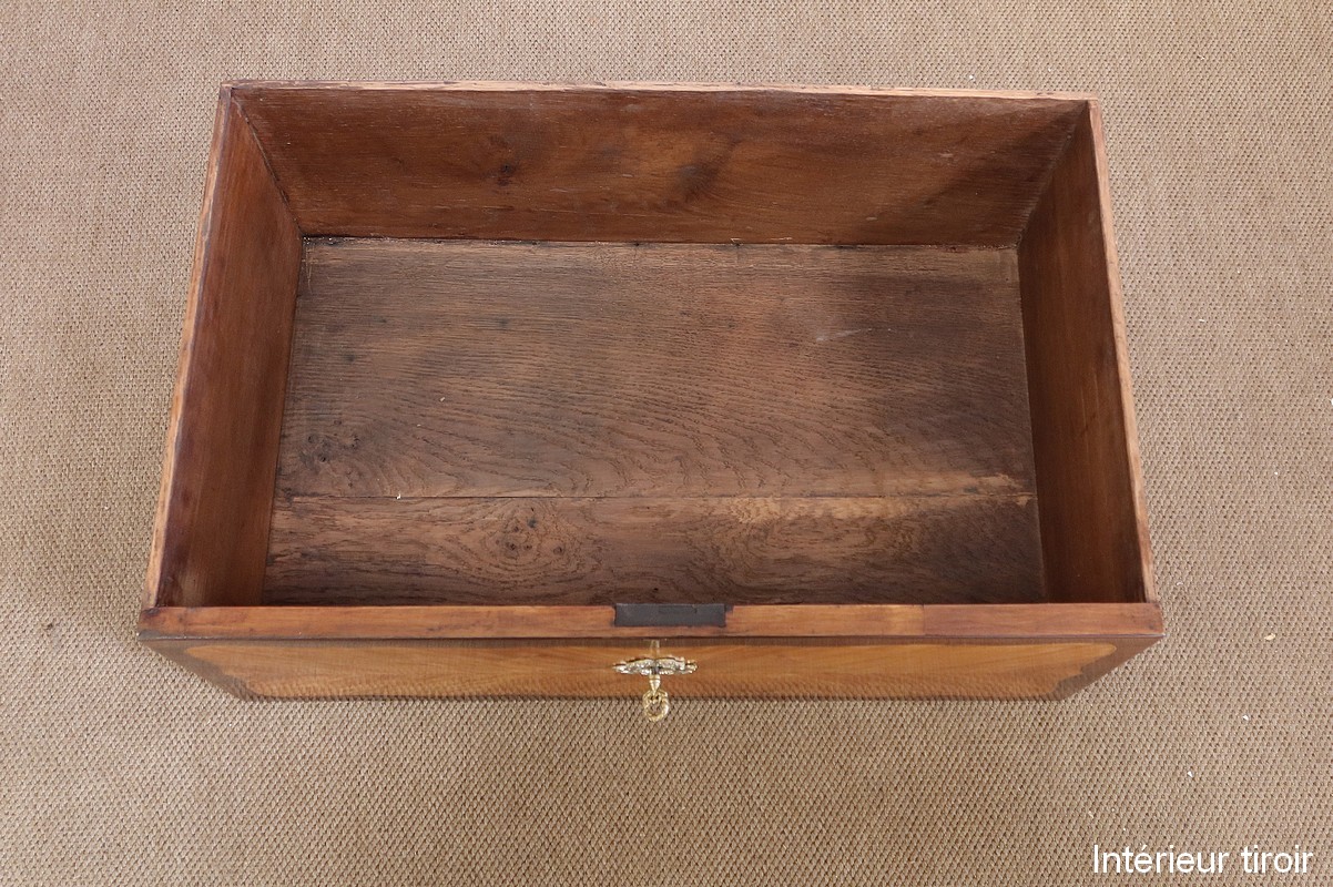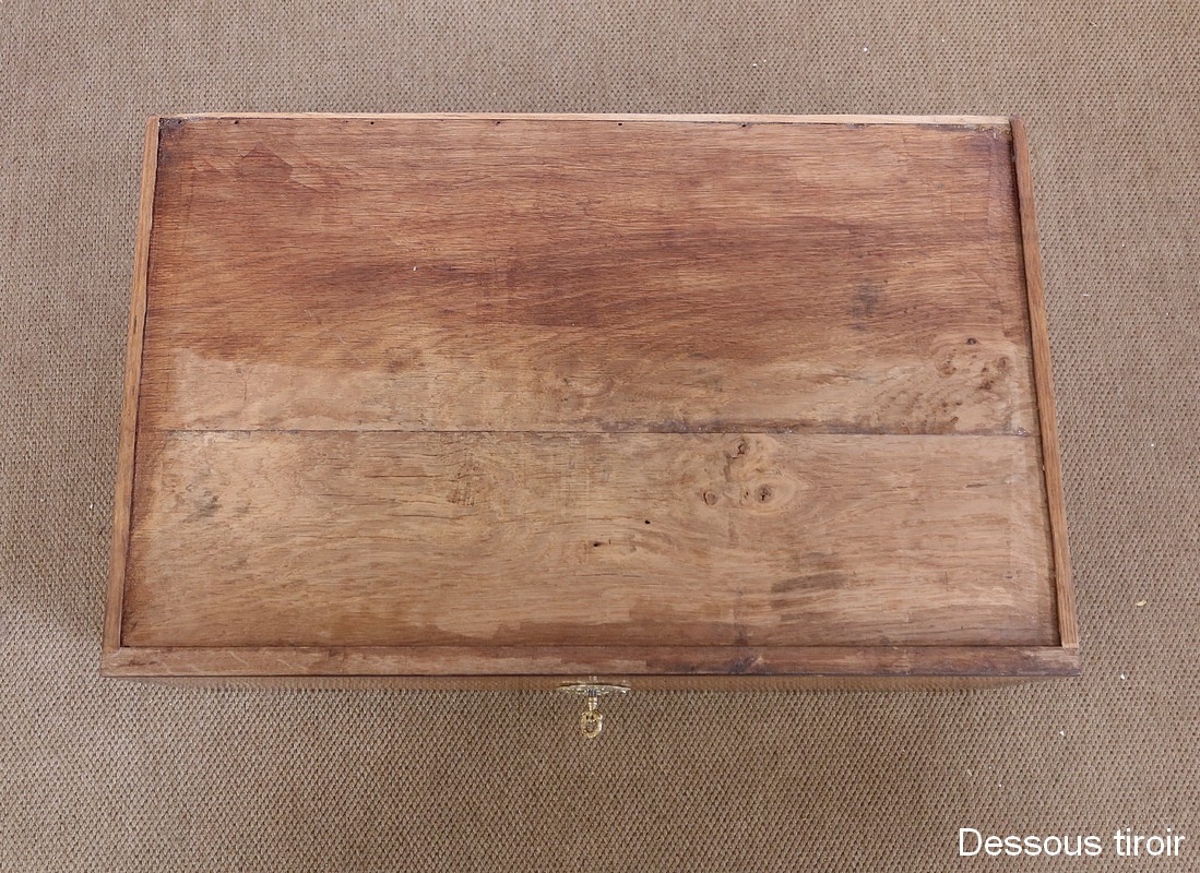 Ces tiroirs sont équipés de serrures d’origines, complétées d’entrées en bronze et de clés ajustées, postérieures à l’époque. Entre chaque tiroir, nous retrouvons des cache-poussières. Les côtés et les fonds de tiroirs sont en chêne.