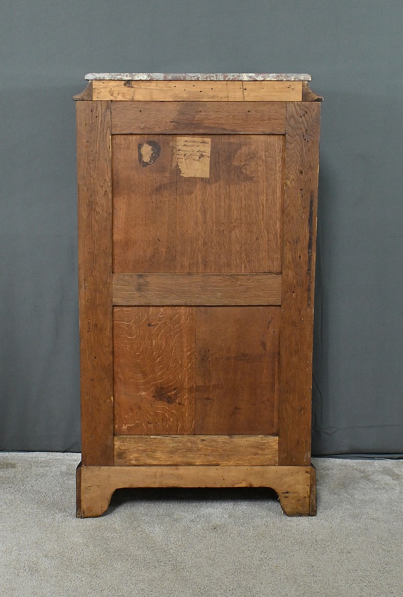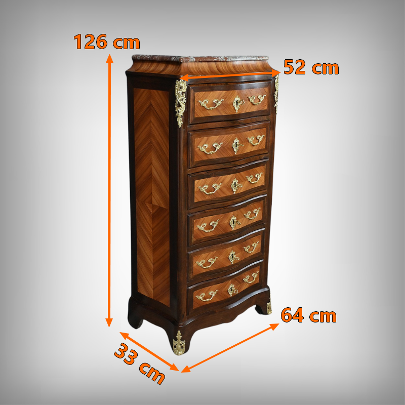 Somptueux chiffonnier de style Louis XV, présentant une façade marquetée en bois de rose disposé en aile de papillon, sublimée par un entourage en palissandre. Ses six tiroirs, dotés de poignées de tirage en bronze ciselé, offrent une capacité de rangement généreuse tout en conservant une finesse incomparable. Chaque détail respire l’excellence artisanale, de la serrure fonctionnelle avec clé sculptée à l’entrée raffinée typique du style Louis XV. Ce meuble élégamment conçu est couronné d’un superbe marbre rouge des Pyrénées, ajoutant une touche distinctive. Enfin, les montants enrichis de chutes en bronze ainsi que les garnitures de bronze sur les pieds parachèvent son allure noble et intemporelle. Les côtés sont constitués d’un placage de bois de rose disposé en ailes de papillon avec entourage en palissandre. Un magnifique meuble qui ravira par sa petite dimension et sa qualité.