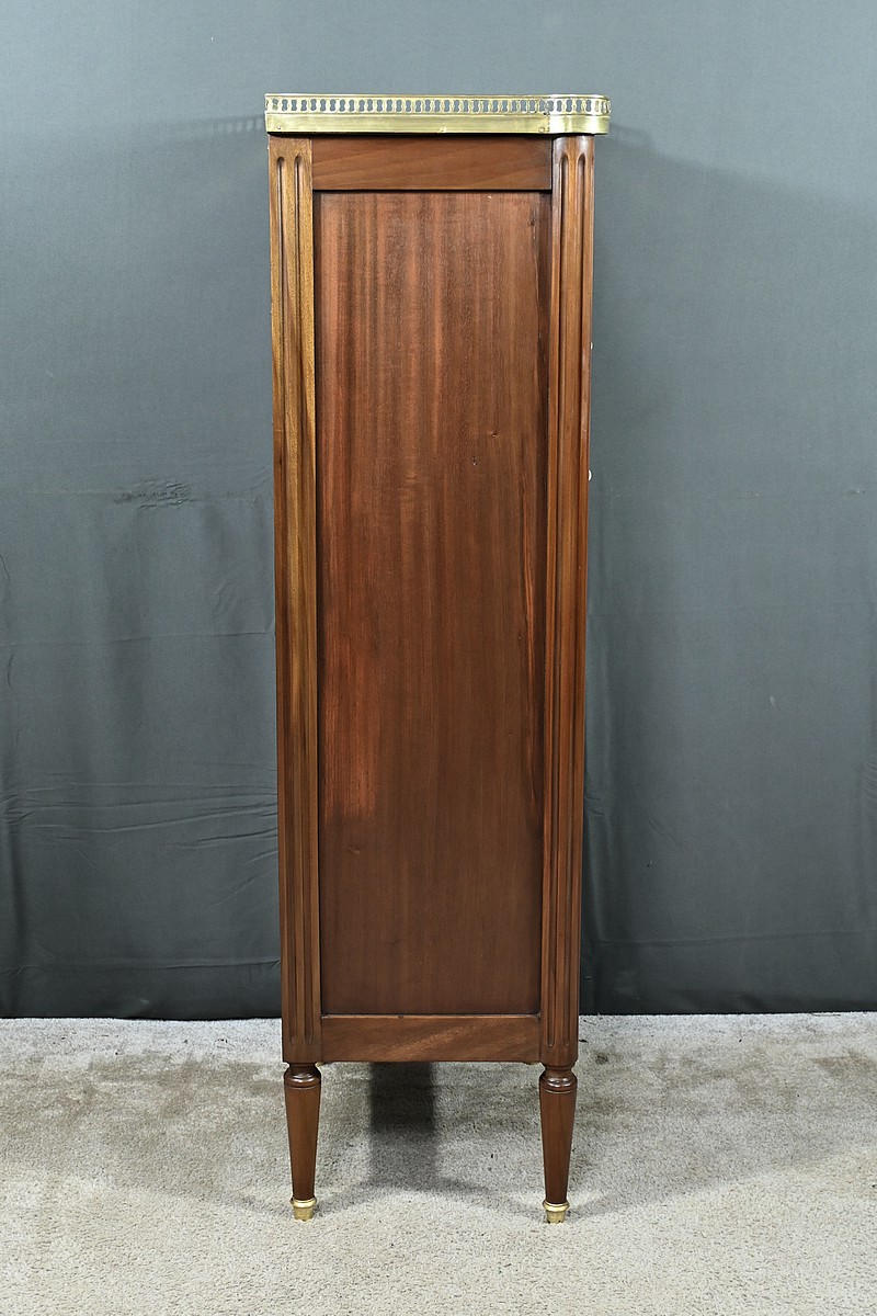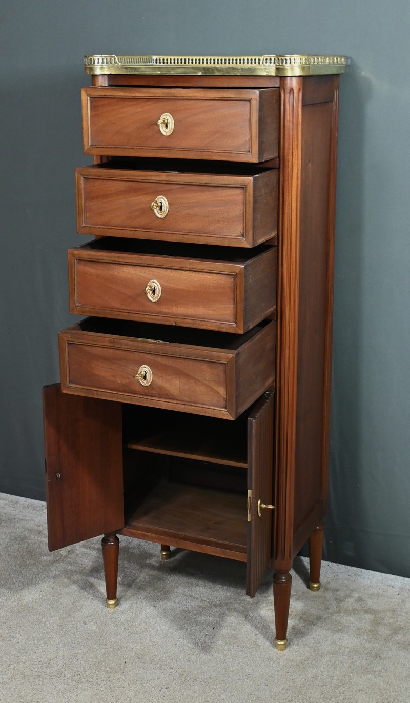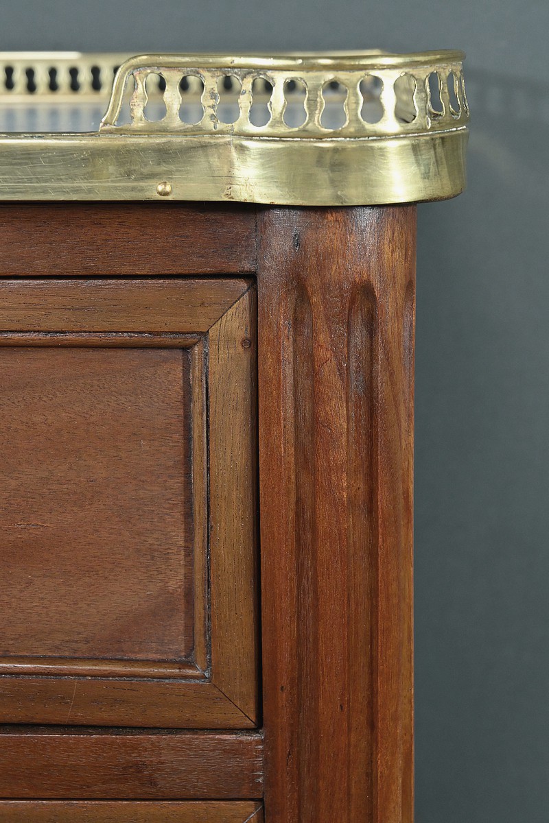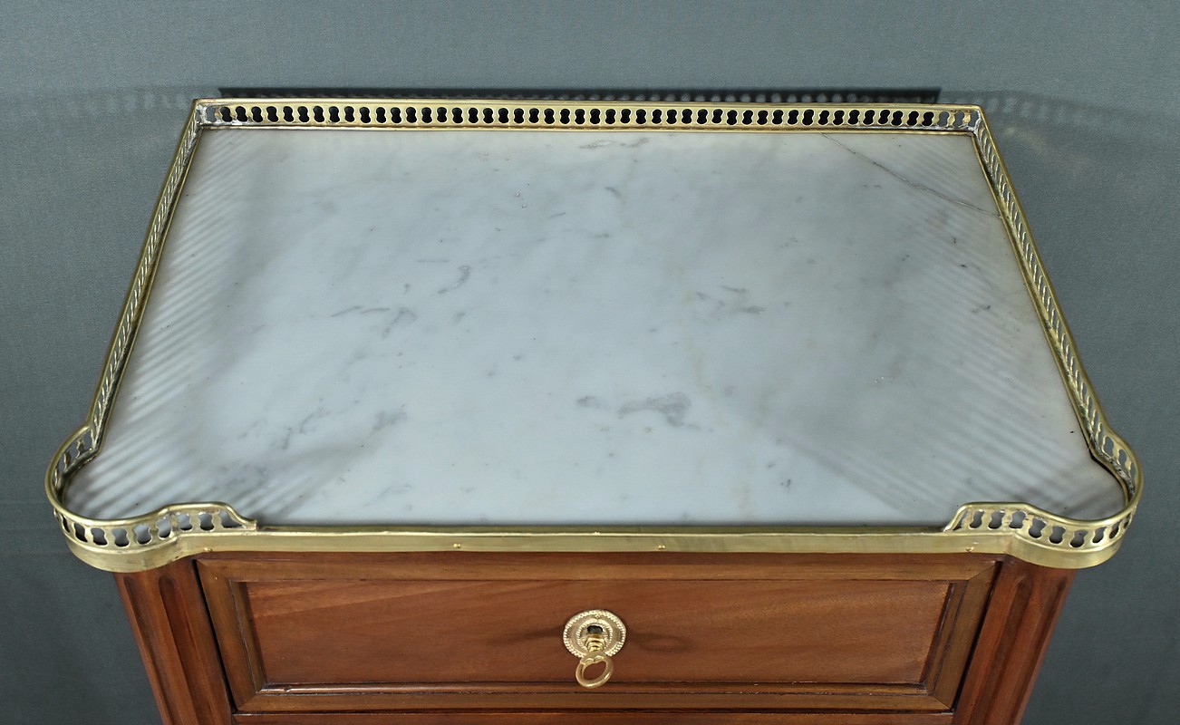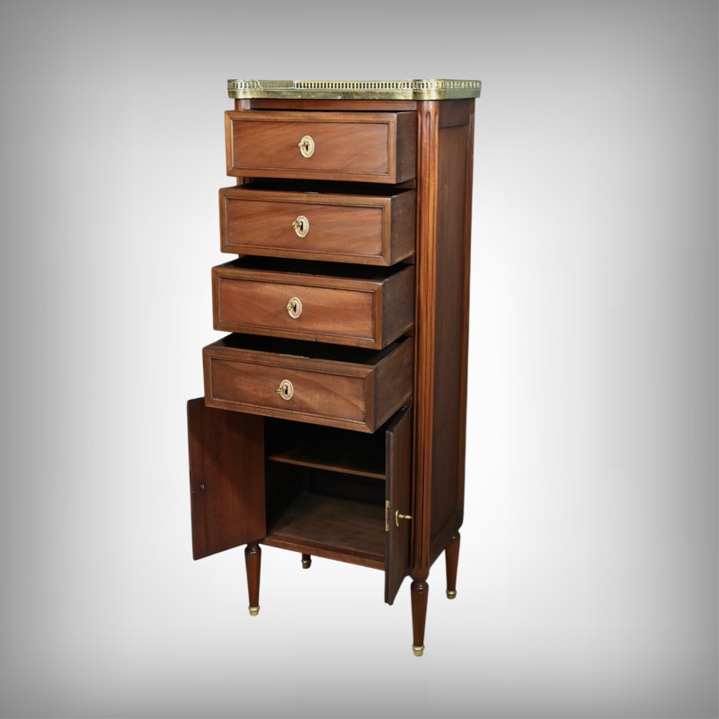 Ravissant Petit Chiffonnier de style Louis XVI, composé d’Acajou massif et de Placage d’Acajou. Son dessus consiste en un marbre blanc de Carrare, entouré d’une galerie laiton à débord ajouré.