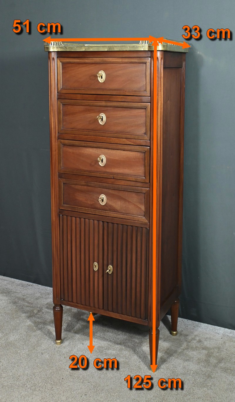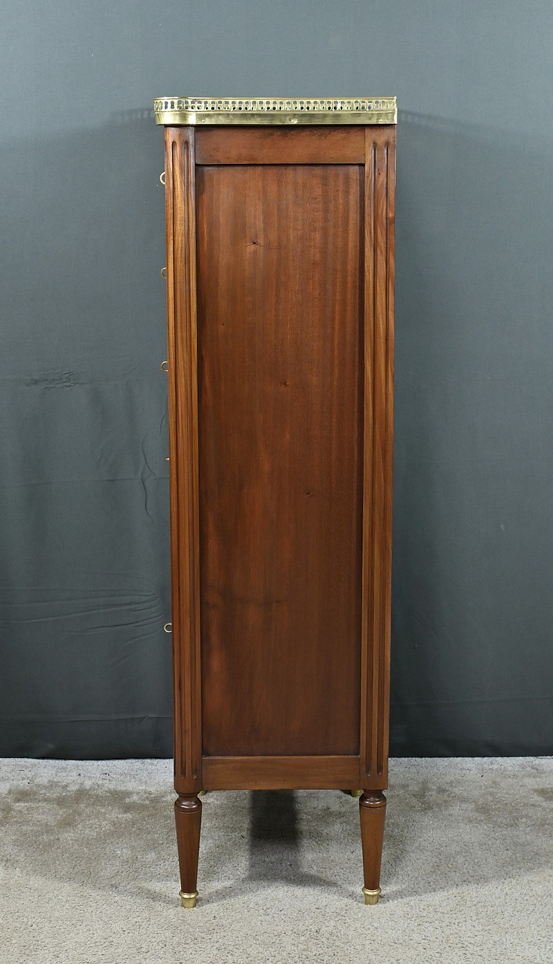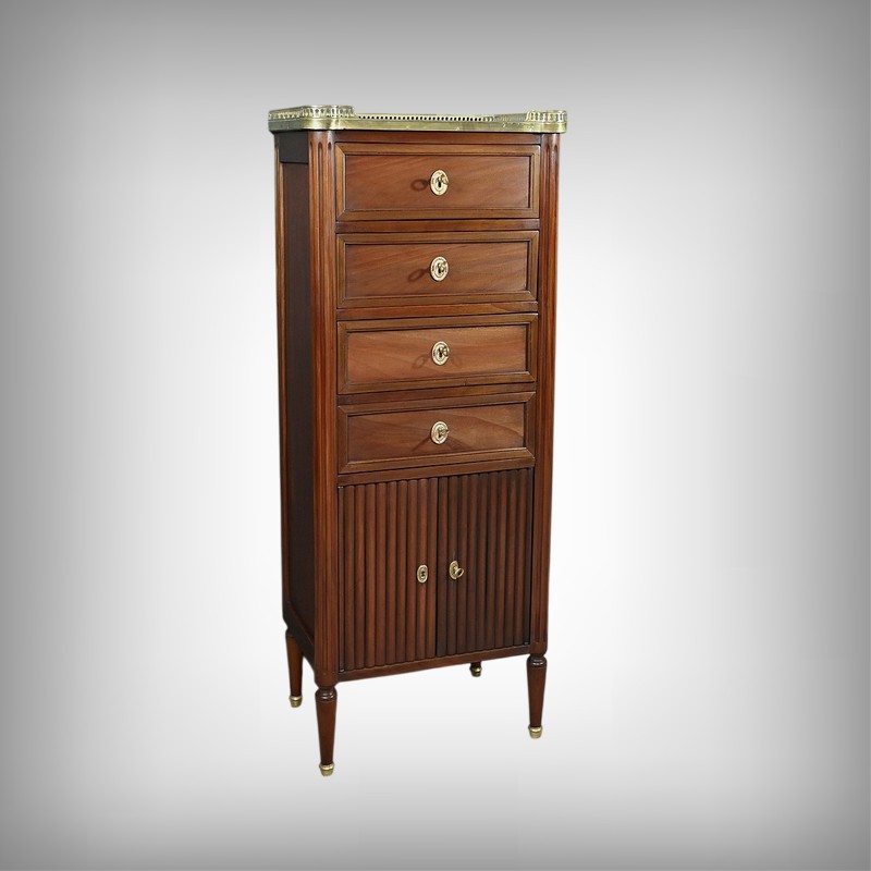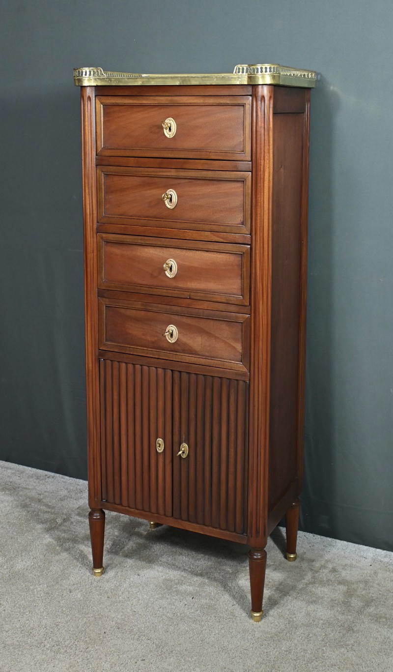 Ravissant Petit Chiffonnier de style Louis XVI, composé d’Acajou massif et de Placage d’Acajou. Son dessus consiste en un marbre blanc de Carrare, entouré d’une galerie laiton à débord ajouré.