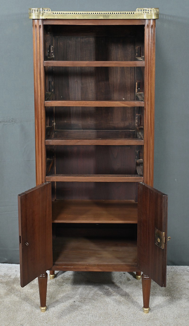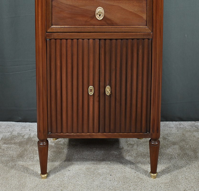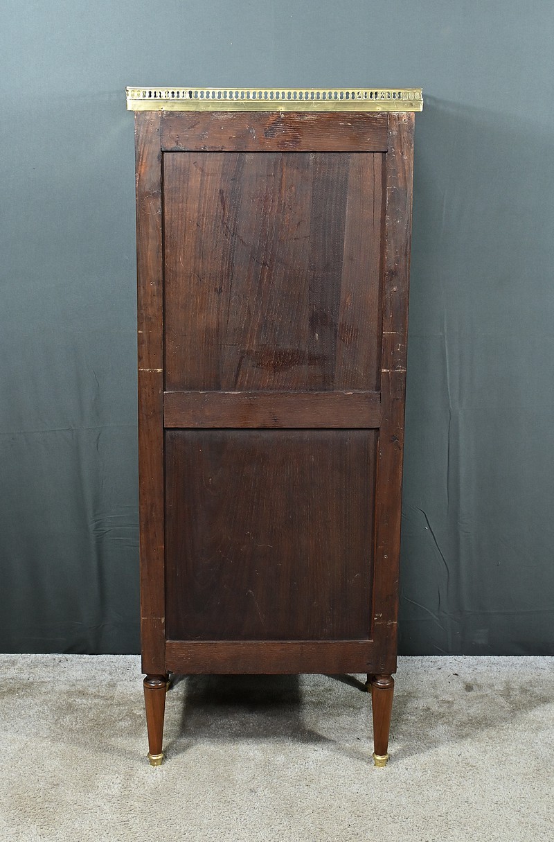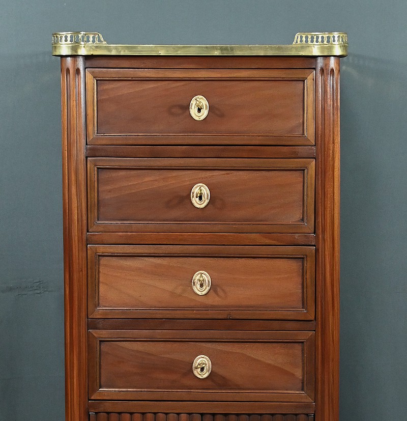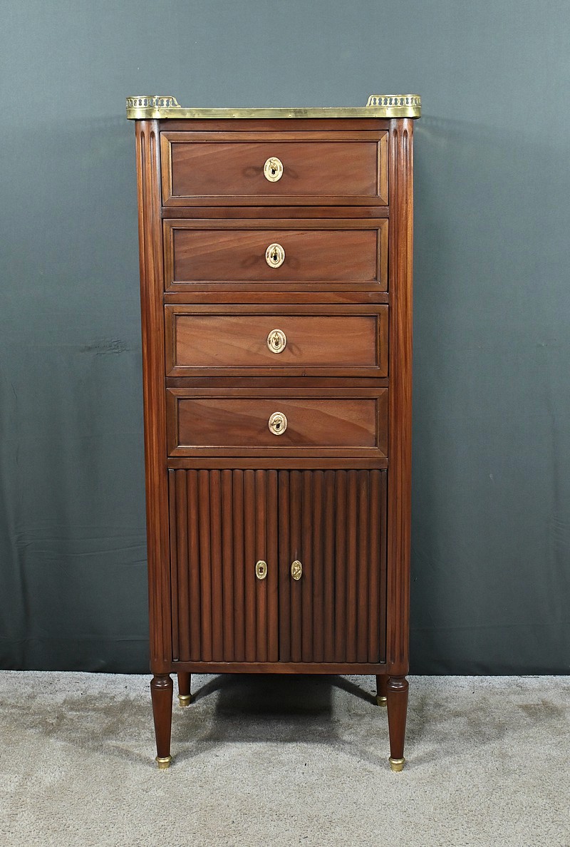 Ravissant Petit Chiffonnier de style Louis XVI, composé d’Acajou massif et de Placage d’Acajou. Son dessus consiste en un marbre blanc de Carrare, entouré d’une galerie laiton à débord ajouré.