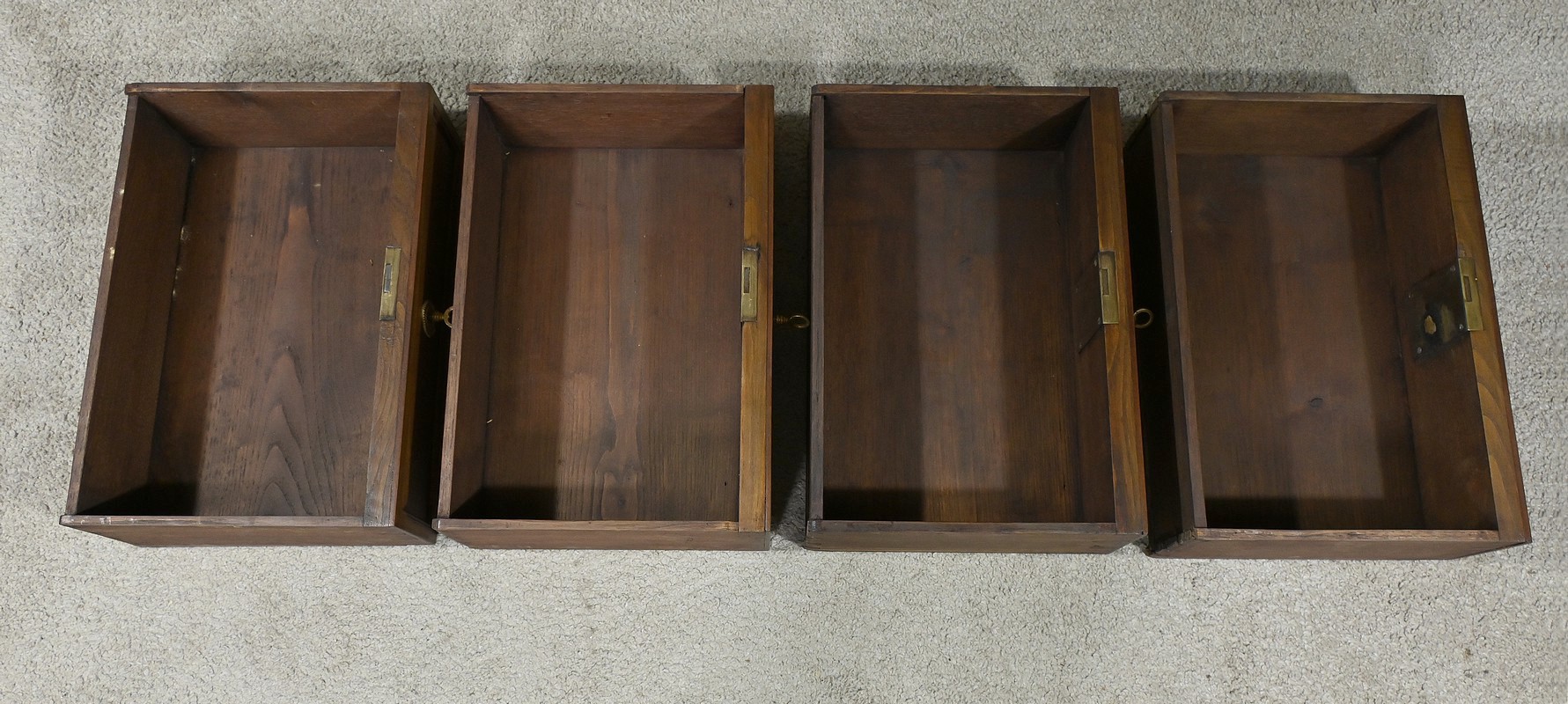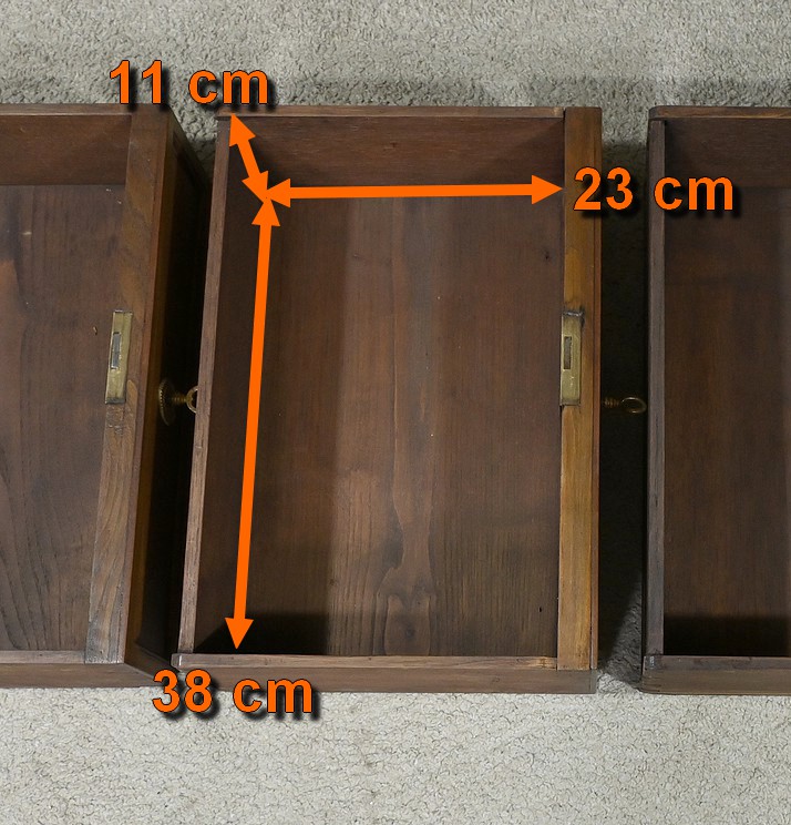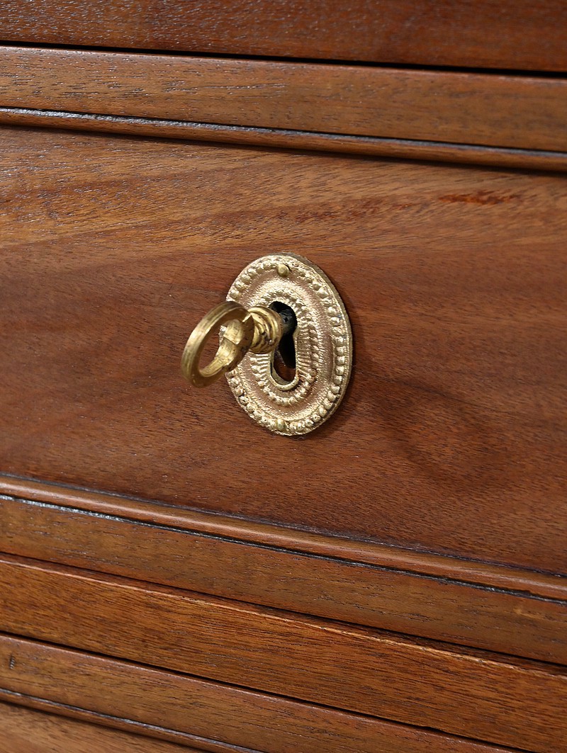 En partie haute, ce meuble ouvre en façade par quatre tiroirs identiques, dit à défoncement, avec un encadrement légèrement mouluré. Chacun d’eux est équipé d’une entrée en bronze Louis XVI, avec serrure d’origine en état de fonctionnement.