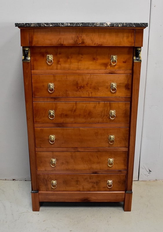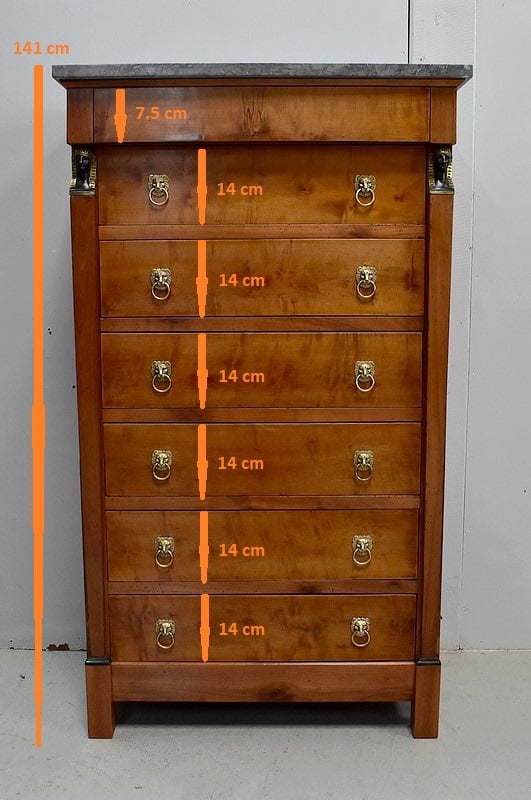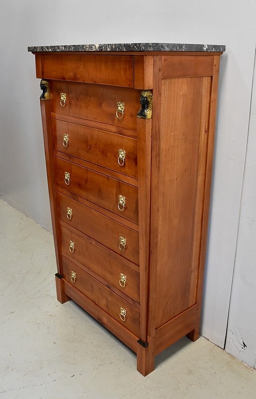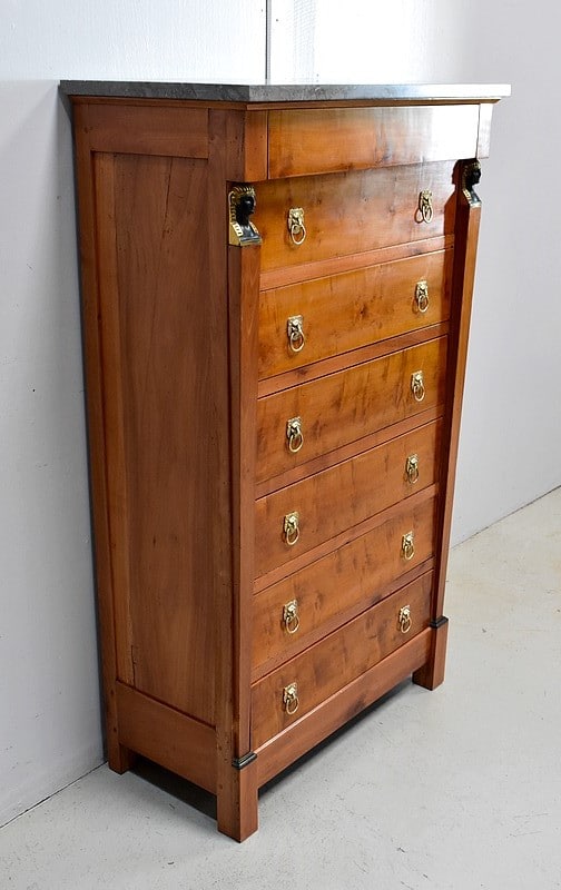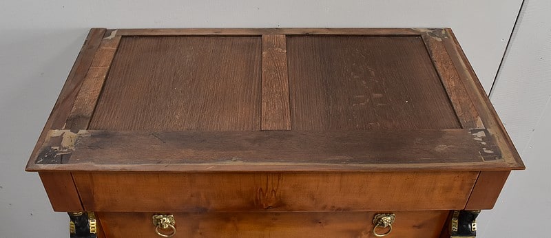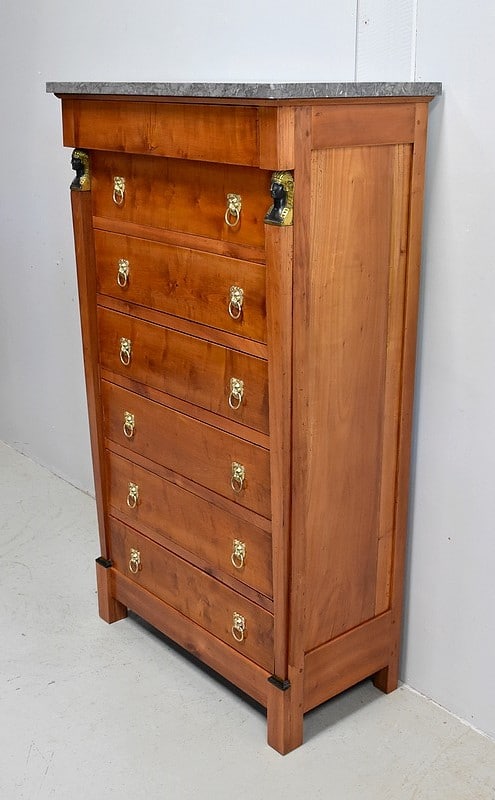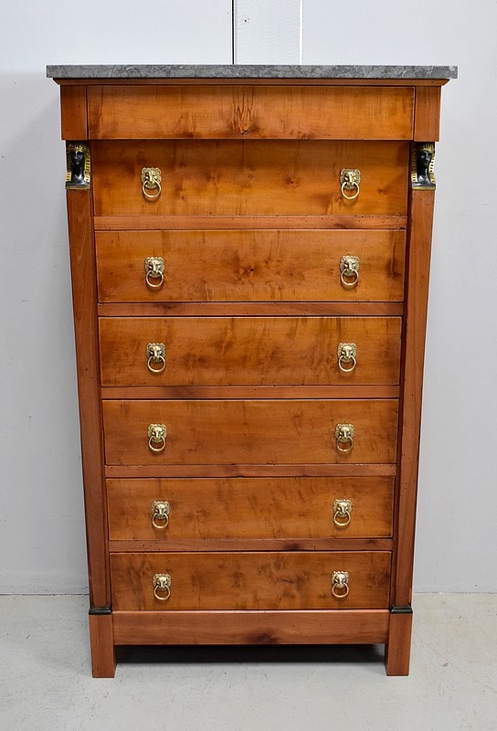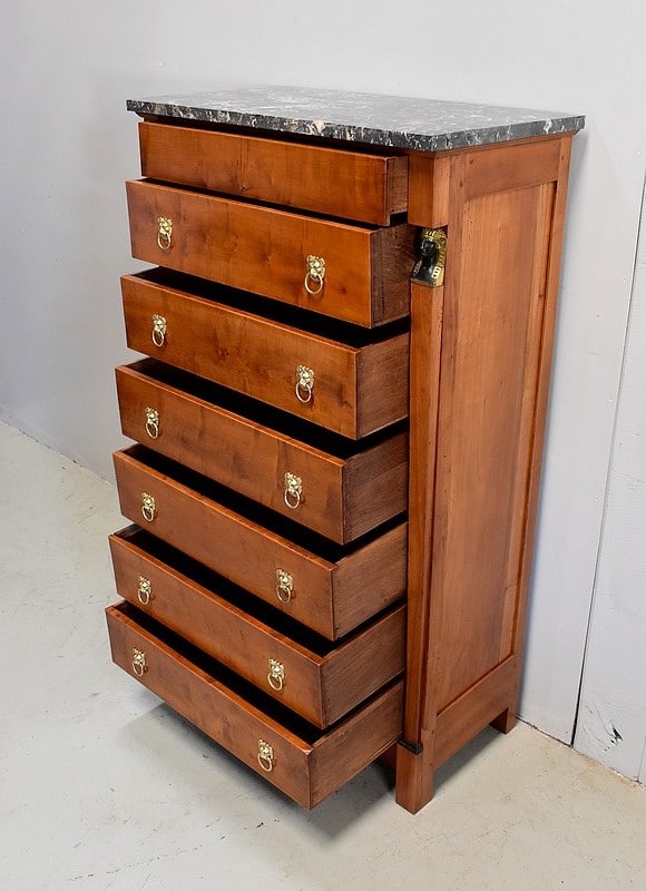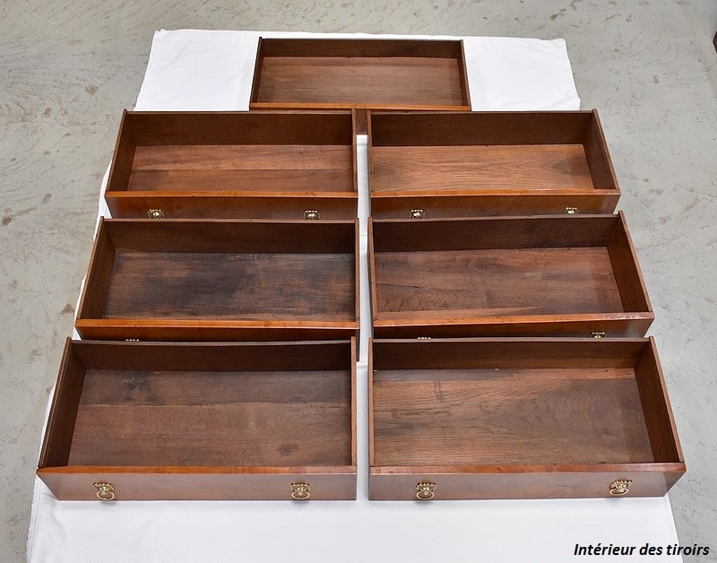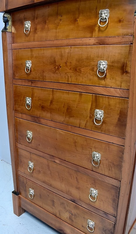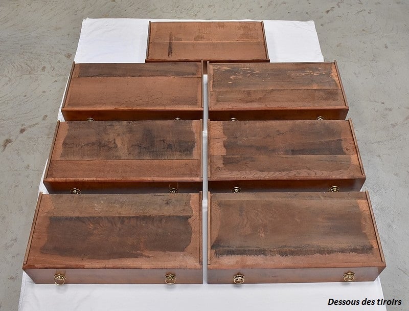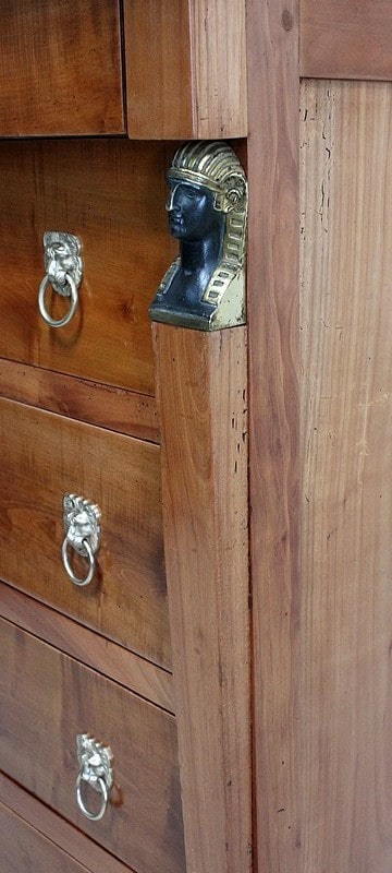 Petit Semainier Retour d’Égypte, en Merisier majoritairement, ouvrant par définition par sept tiroirs alignés verticalement. Leurs façades sont en Poirier et l’assemblage en Queues d’Arondes. Le premier, moins profond, que l’on pourrait par conséquent attribué au Dimanche, surplombe les six autres. Ces derniers sont pourvus pour chacun d’eux d’une paire de poignées de tirage actuelles, rondes, tenues dans la gueule de Lions.
