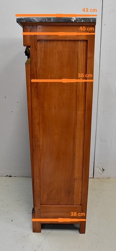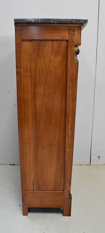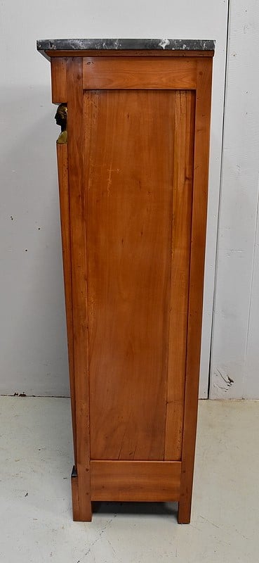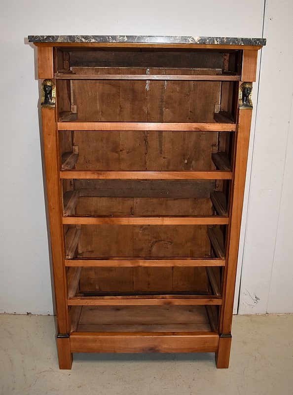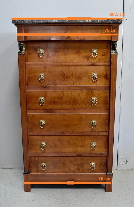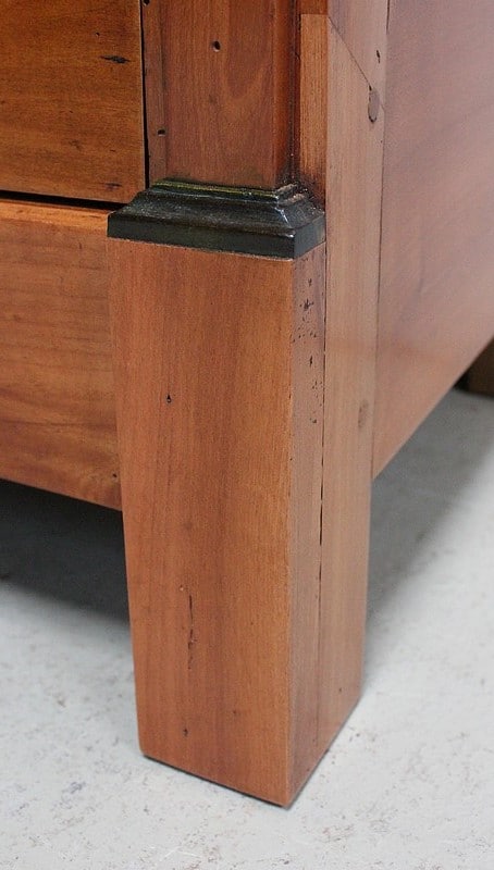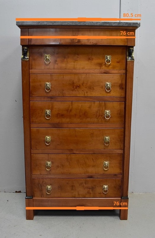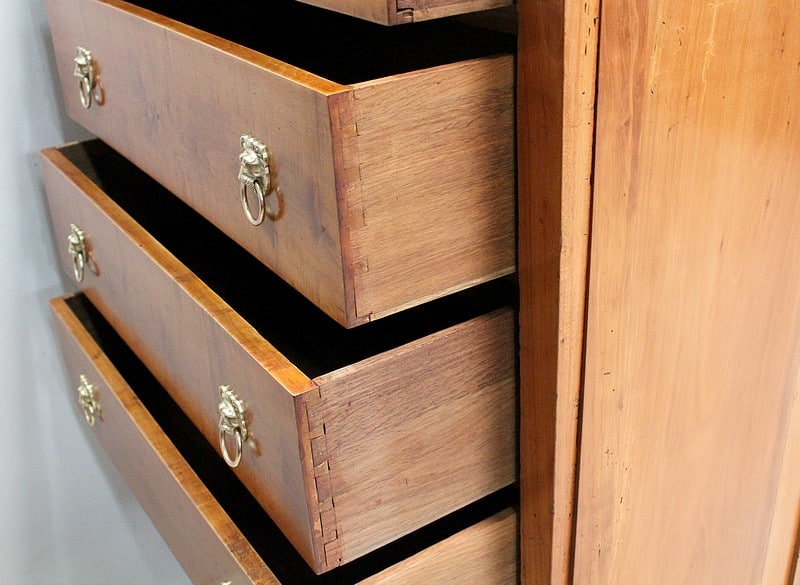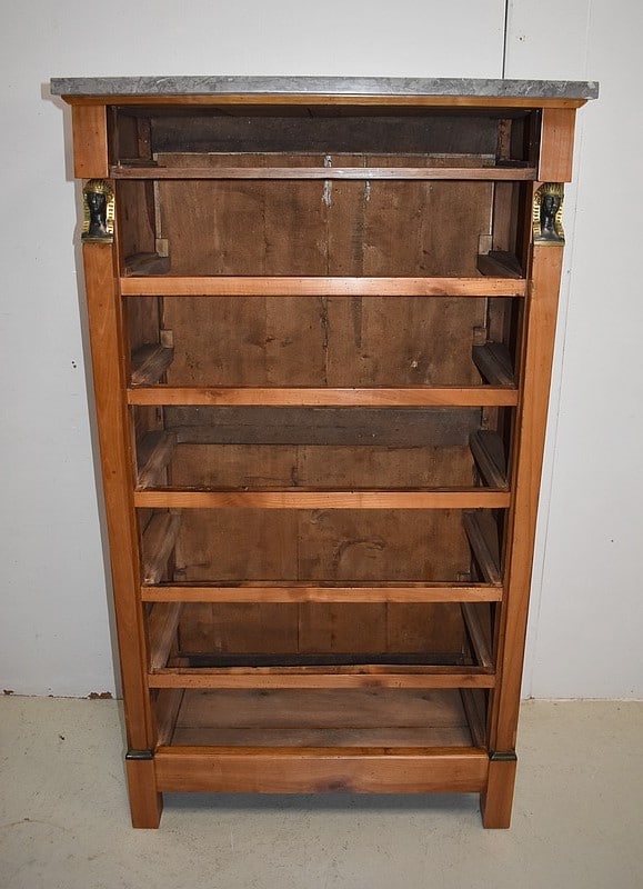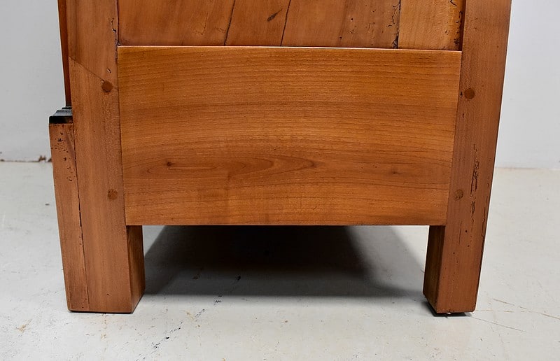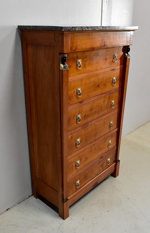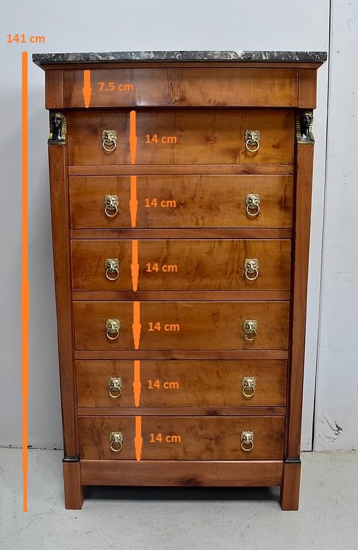 Petit Semainier Retour d’Égypte, en Merisier majoritairement, ouvrant par définition par sept tiroirs alignés verticalement. Leurs façades sont en Poirier et l’assemblage en Queues d’Arondes. Le premier, moins profond, que l’on pourrait par conséquent attribué au Dimanche, surplombe les six autres. Ces derniers sont pourvus pour chacun d’eux d’une paire de poignées de tirage actuelles, rondes, tenues dans la gueule de Lions.