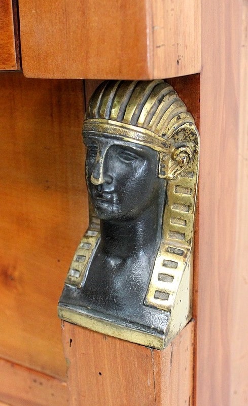 Les montants avants de ce meuble sont des Pilastres gainés dans les deux sens, à savoir de profil et de face. Il sont surmontés de Bronzes Patinés d’époque, représentations de bustes Égyptiens à Coiffes Némès. En partie basse, des moulures à teinte Vert foncé rappelle ces ornements.