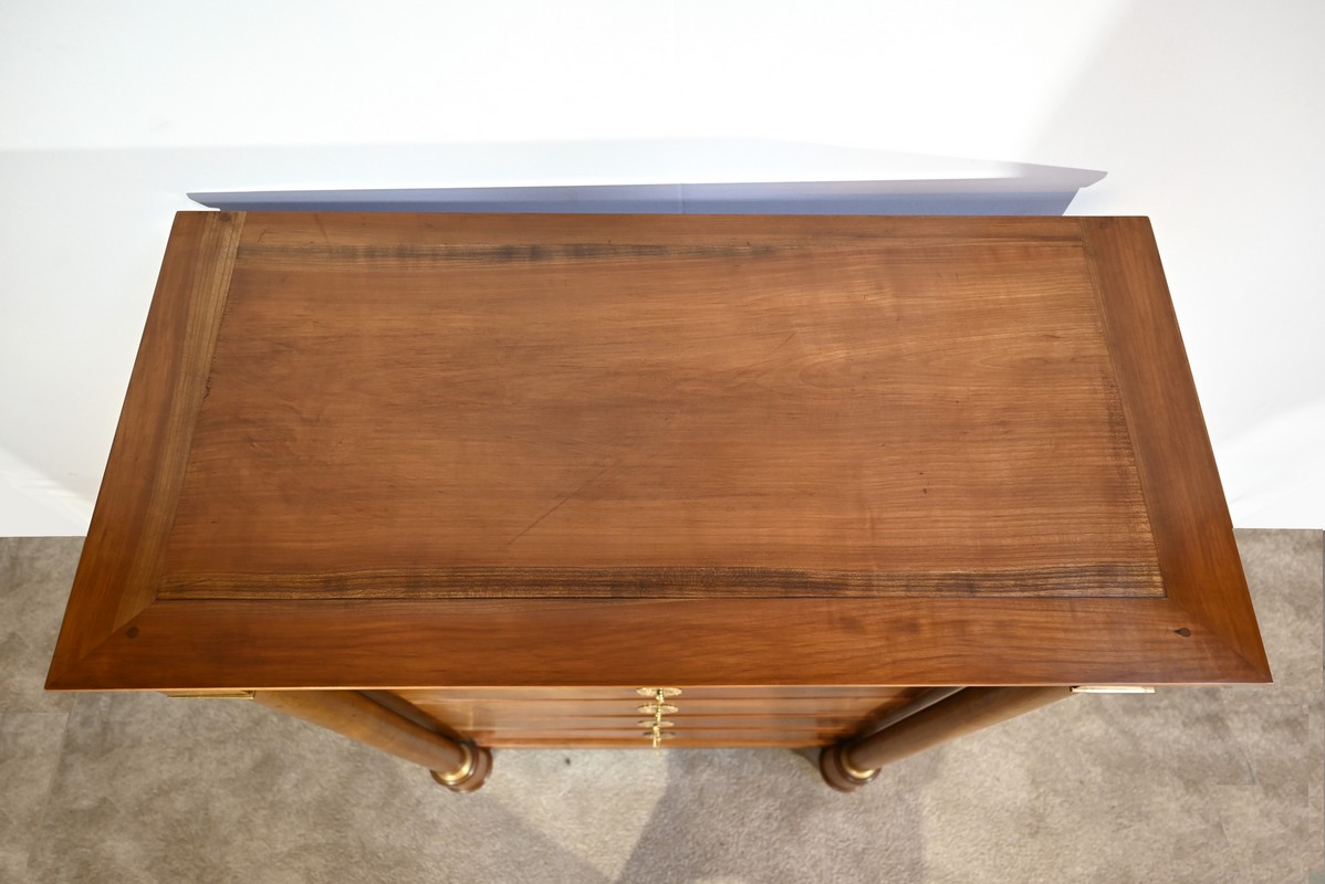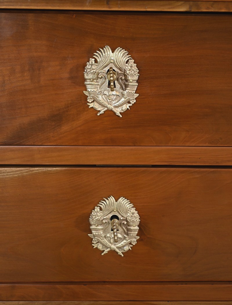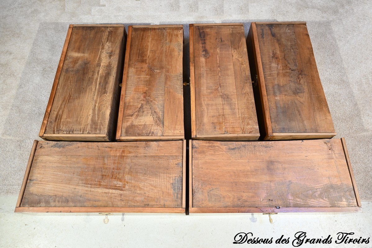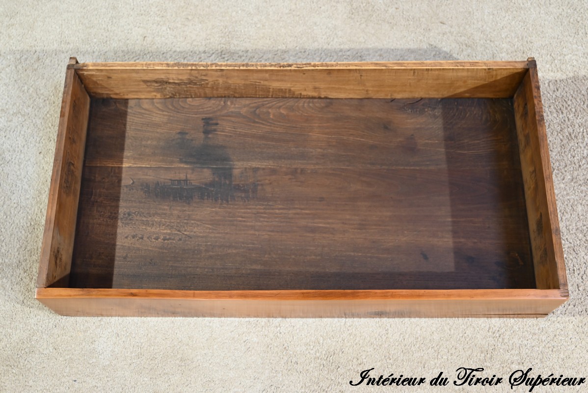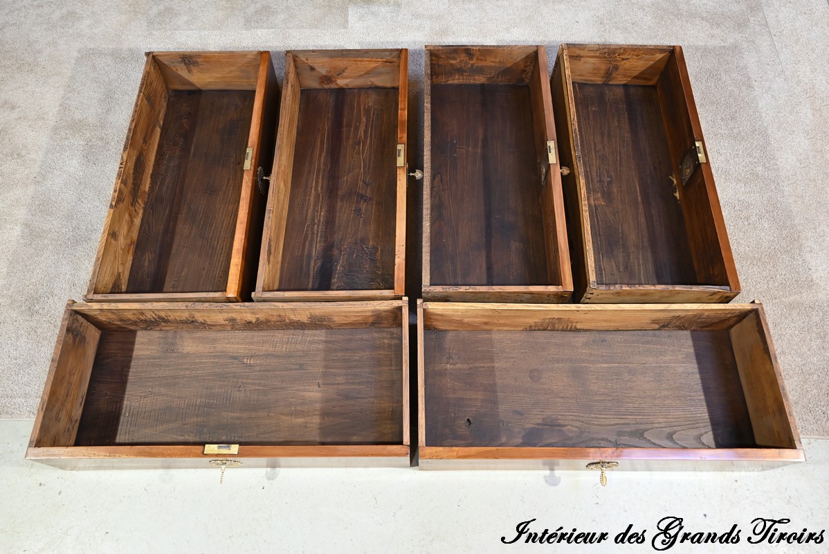 Ce meuble en merisier massif ouvre par un tiroir en ceinture et en dessous six tiroirs identiques, en retrait, de plus grandes dimensions.