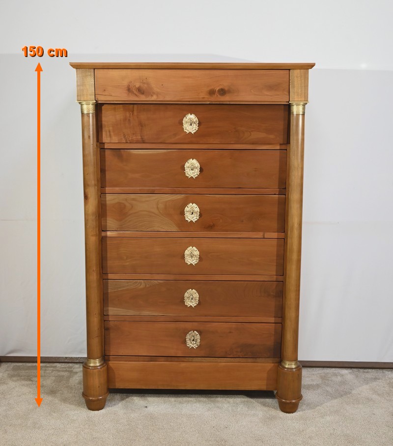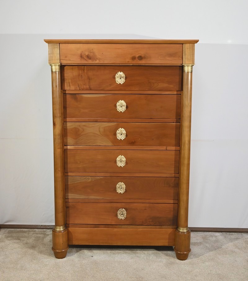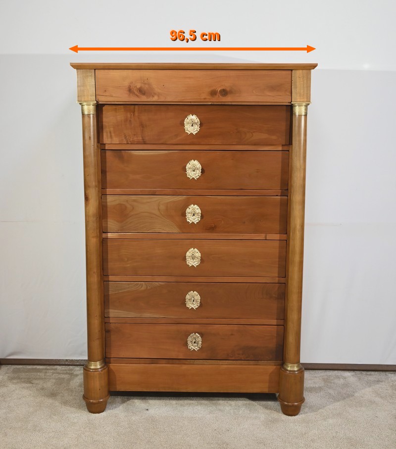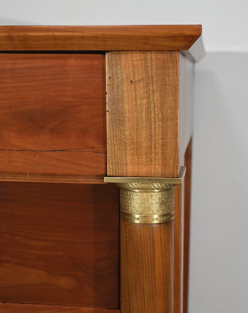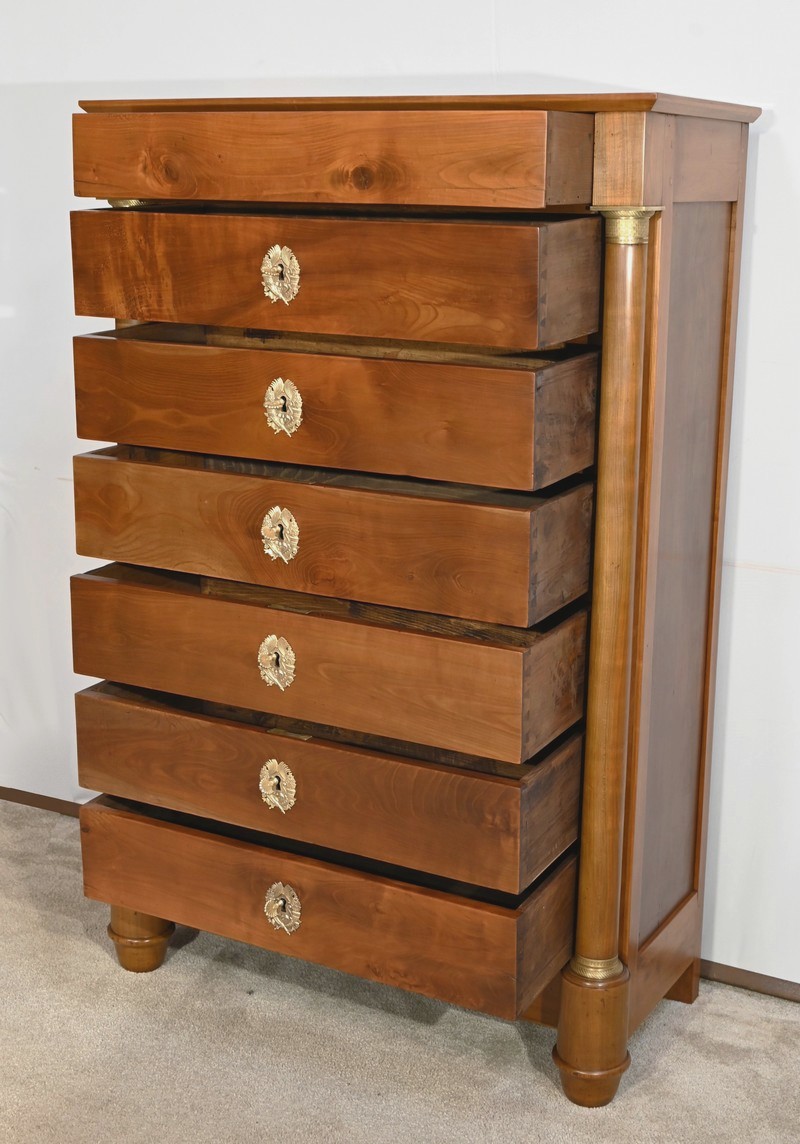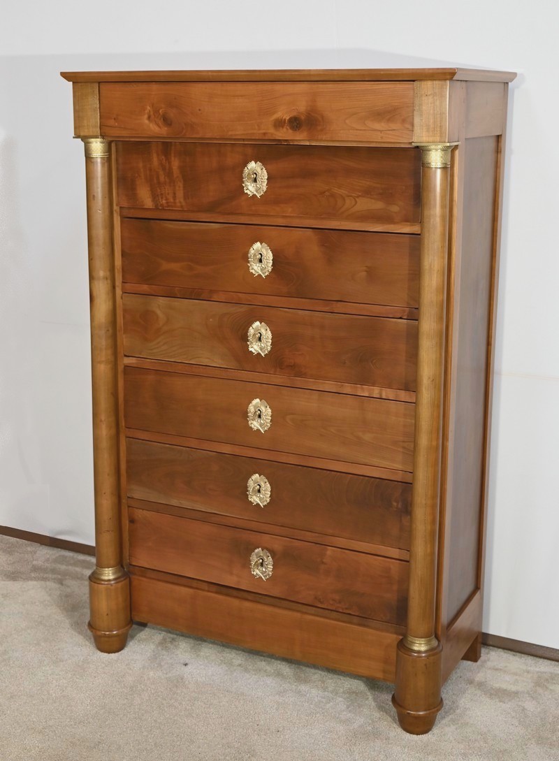 Ce meuble en merisier massif ouvre par un tiroir en ceinture et en dessous six tiroirs identiques, en retrait, de plus grandes dimensions.