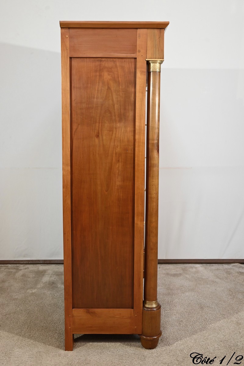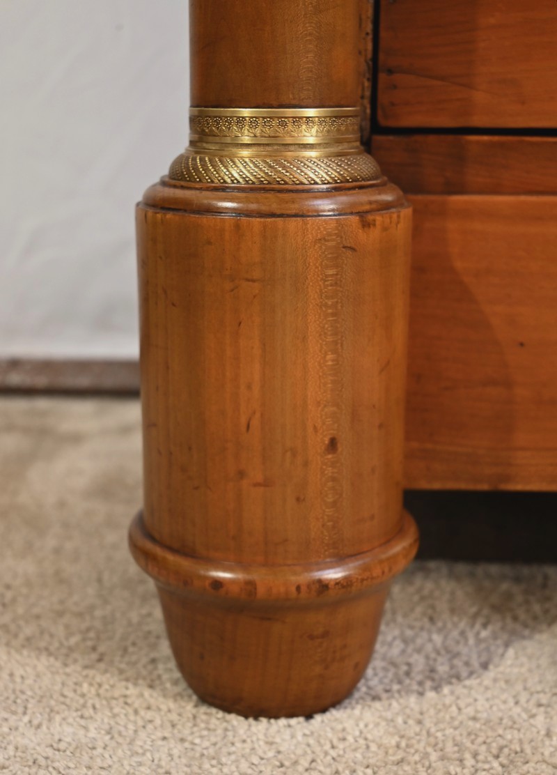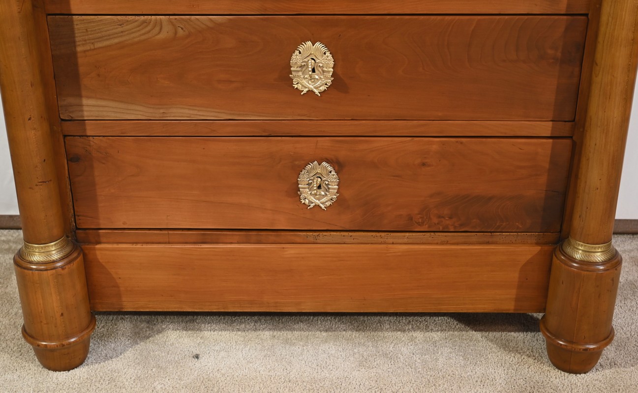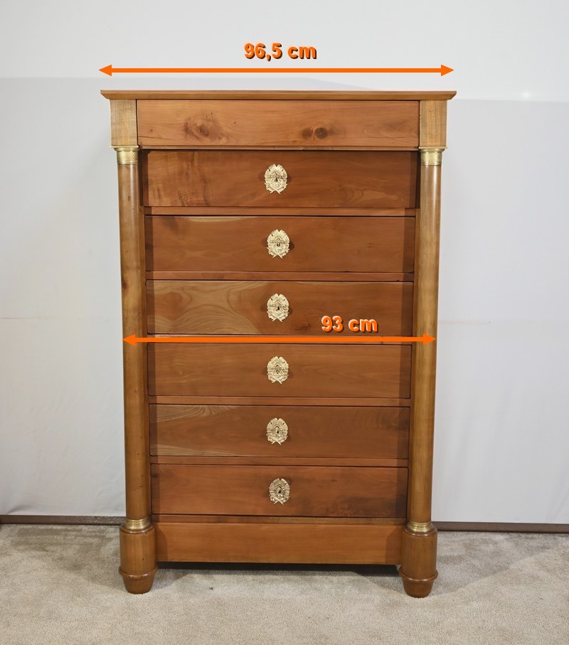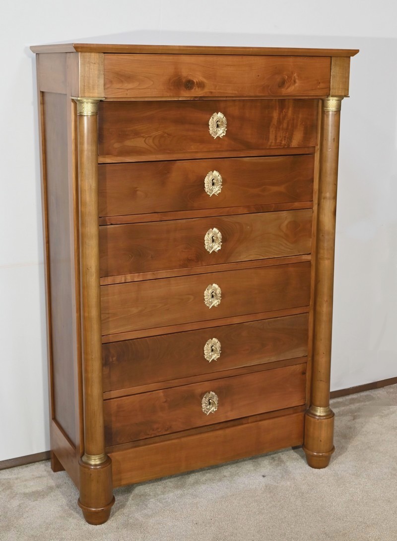 Ce meuble en merisier massif ouvre par un tiroir en ceinture et en dessous six tiroirs identiques, en retrait, de plus grandes dimensions.