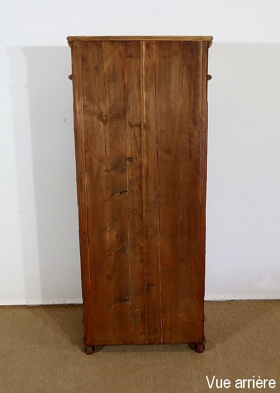 Ce meuble de rangement est doté de 7 tiroirs dont 6 de même hauteur et un plus petit en partie haute. Ceux-ci sont entourés de demi-ronds sculptés à coupe d’onglet dans les angles. Au centre, un bouton en pitchpin permet le tirage de chaque tiroir, monté à queue d’aronde, dont les fonds et les côtés sont réalisés dans la même essence de bois que le reste du meuble.