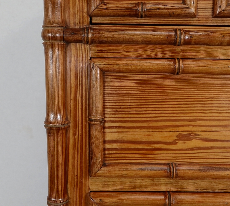 Aux angles, les montants du meuble sont constitués de pitchpin sculpté représentant une grande tige de bambou très réaliste. Chacun se termine par un petit pied tourné en façade.
