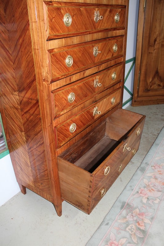 Très beau semainier Louis XVI en placage de bois de rose ouvrant par 5 tiroirs + 1 tiroir double en partie basse, garnis d’entrées de serrure et de poignées Louis XVI en bronze. Il repose sur 4 pieds gainés, Son dessus est en marbre. Époque : XVIIIe siècle.