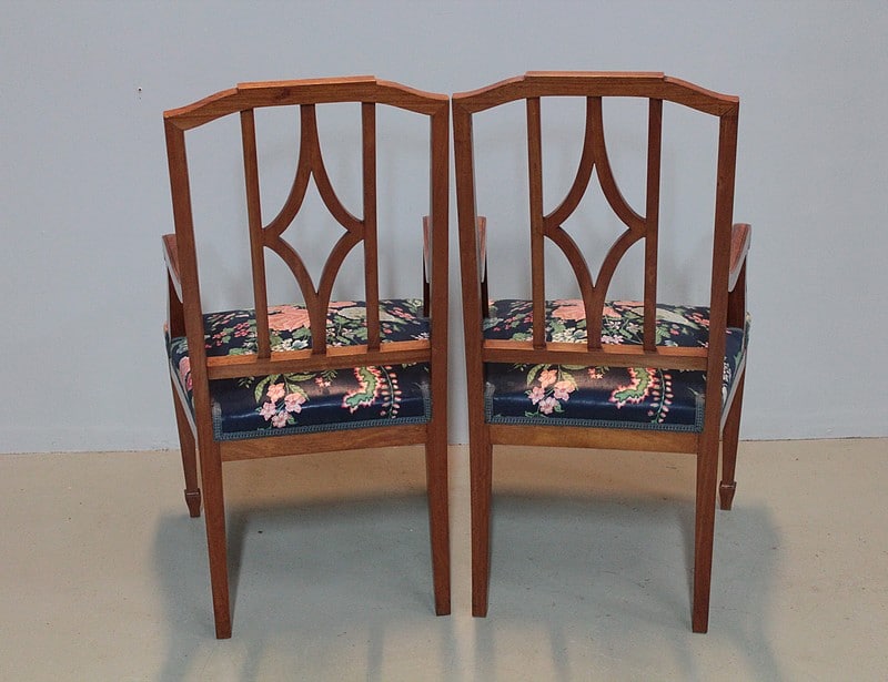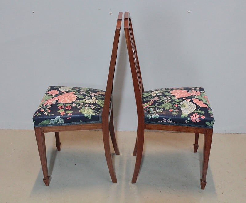 Suite de 4 sièges – 2 fauteuils et 2 chaises – en acajou clair avec incrustation de filets d’acajou plus foncé.