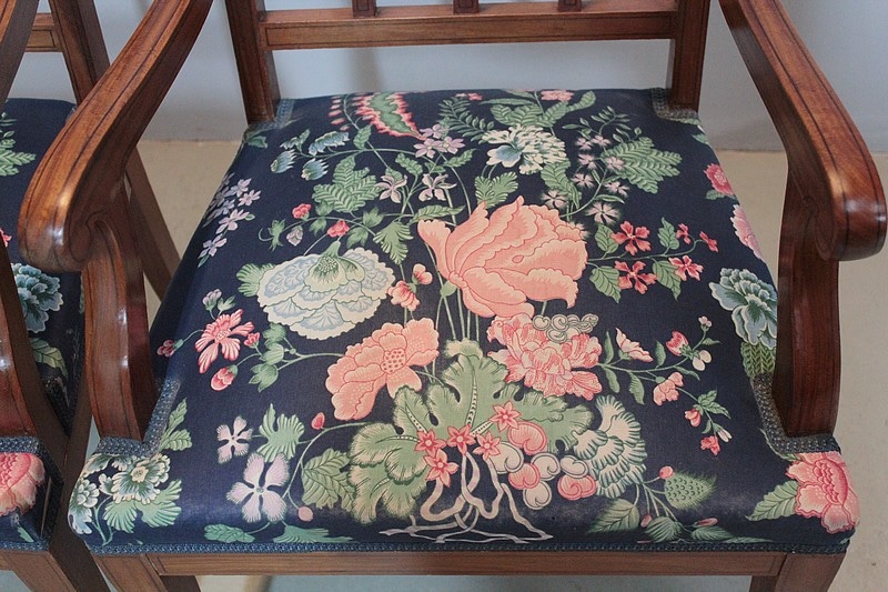 Les assises sont recouvertes d’un tissu à décor floral japonisant sur fond bleu marine.