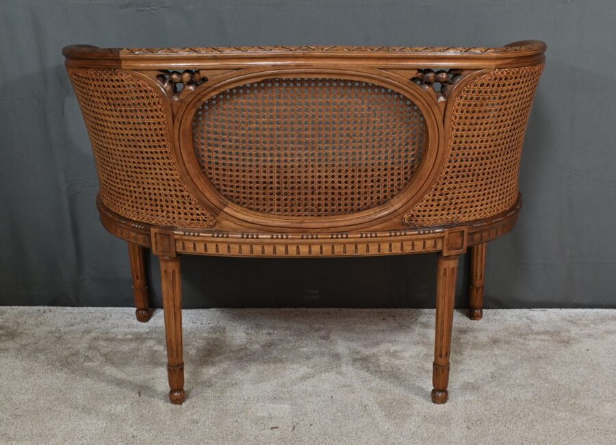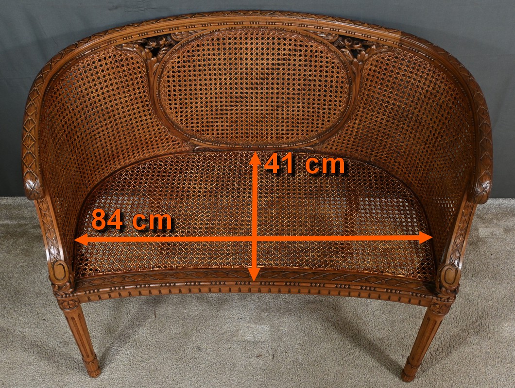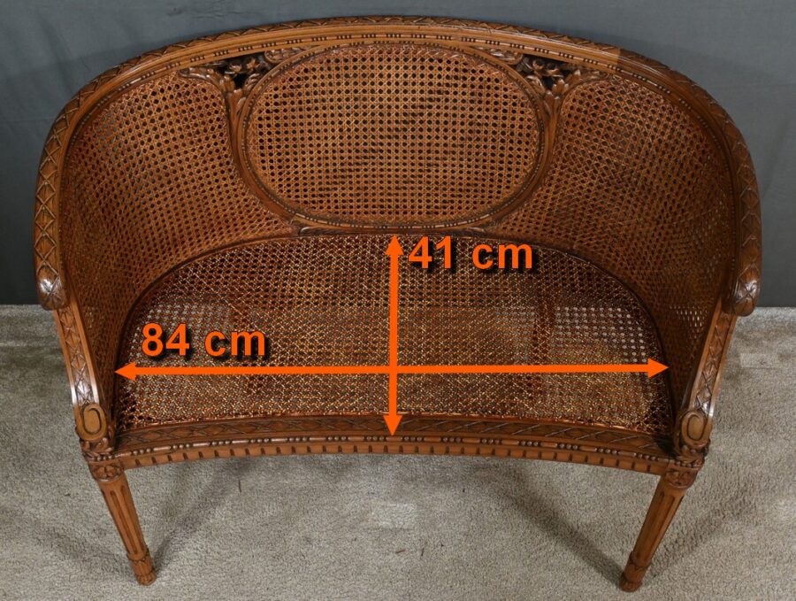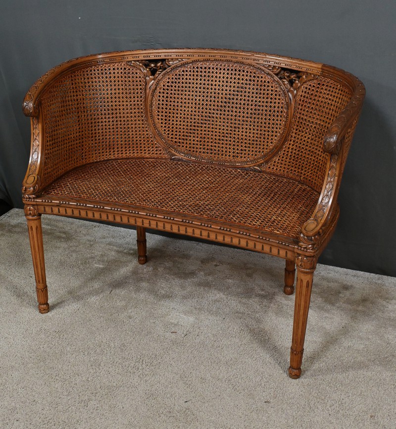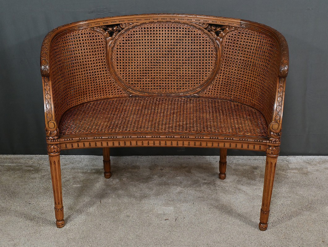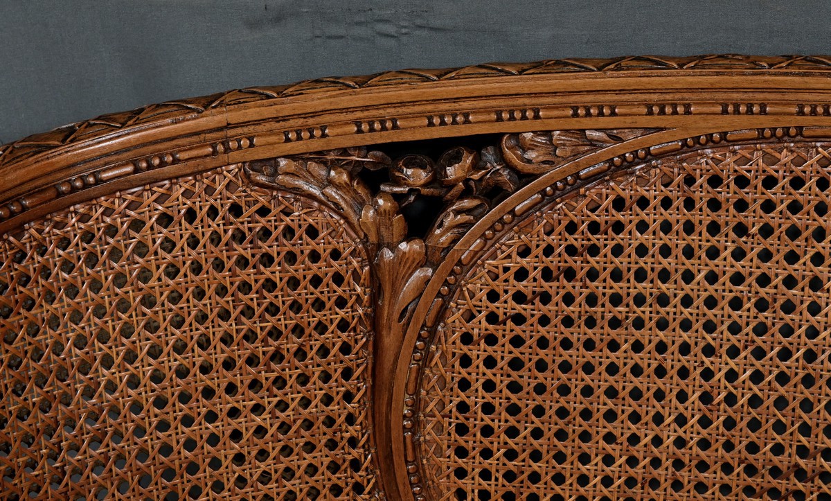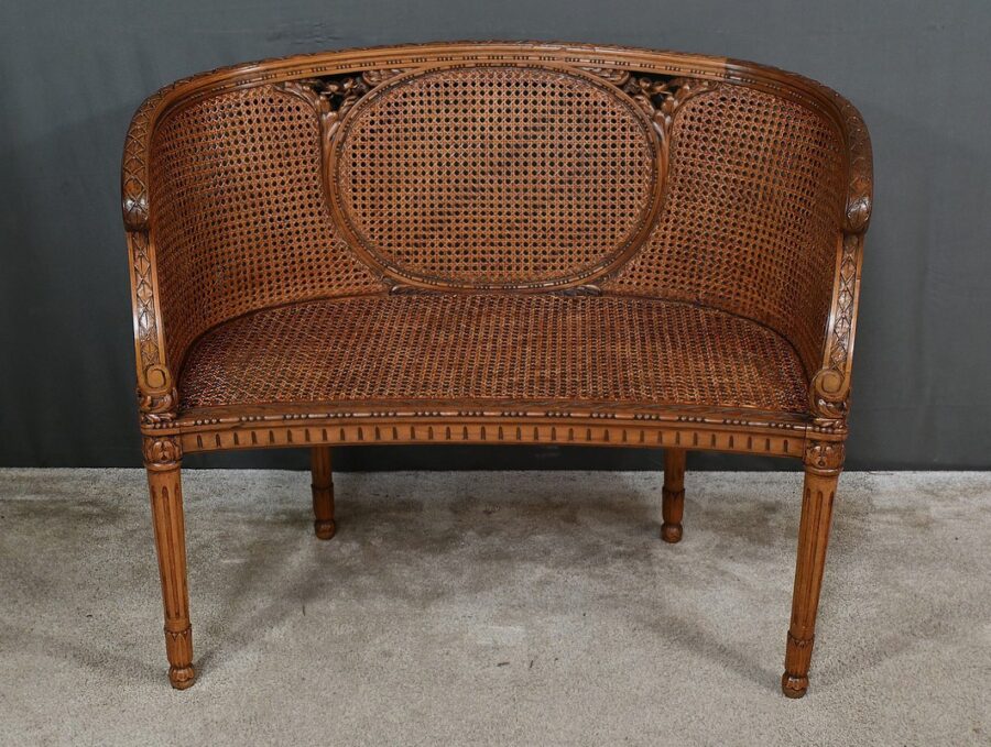 Charmante banquette corbeille en noyer de style Louis XVI datant du XIXe siècle. Ce mobilier est richement sculpté de frises de perles, de losanges, de fleurs et de feuillage. L’assise et le dossier sont cannés. Ce dernier est muni d’un médaillon horizontal accompagné de sculptures ajourées de fleurs. Cette banquette repose sur des pieds fuselés et cannelés.