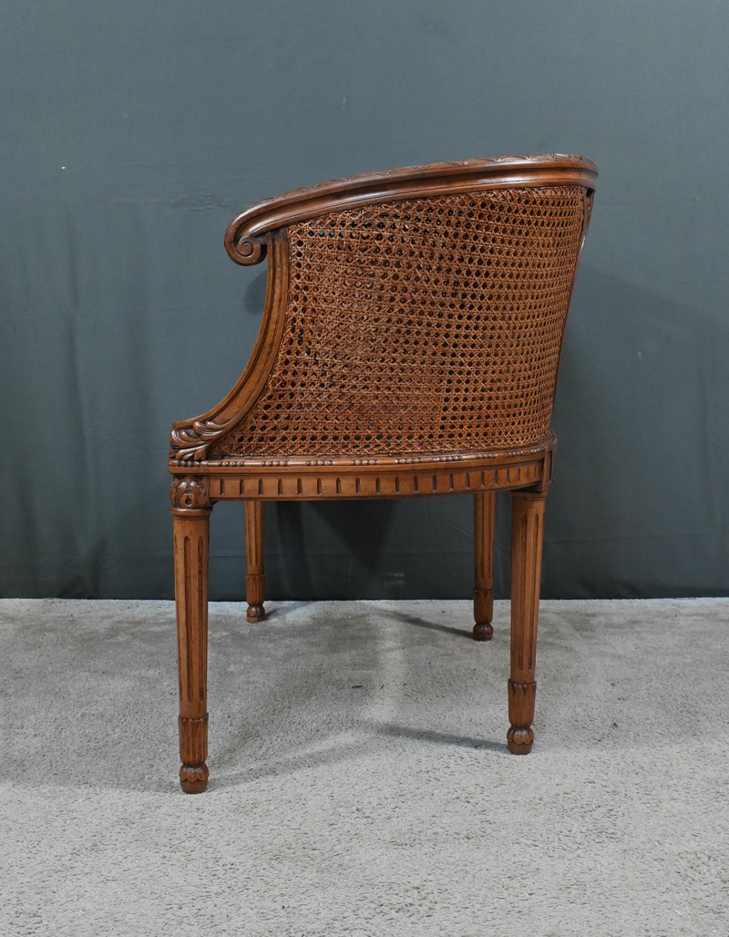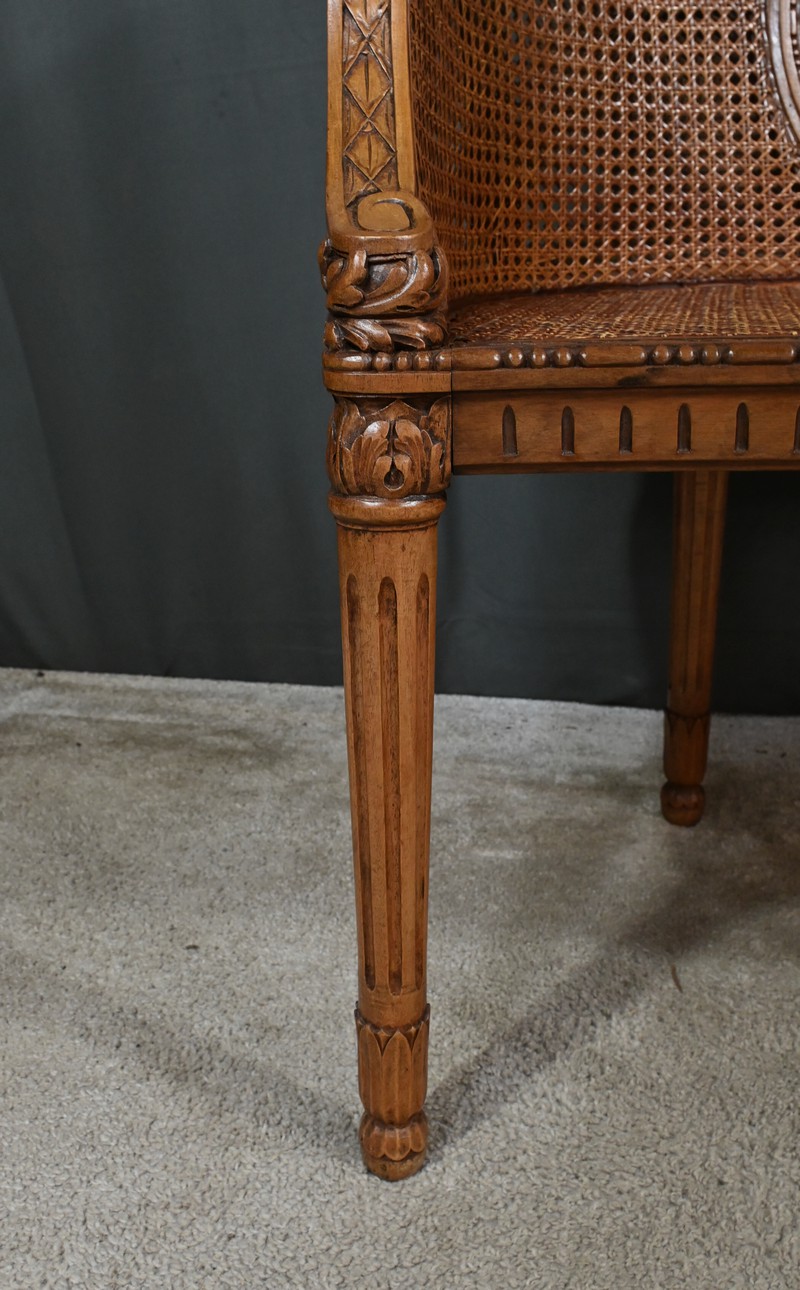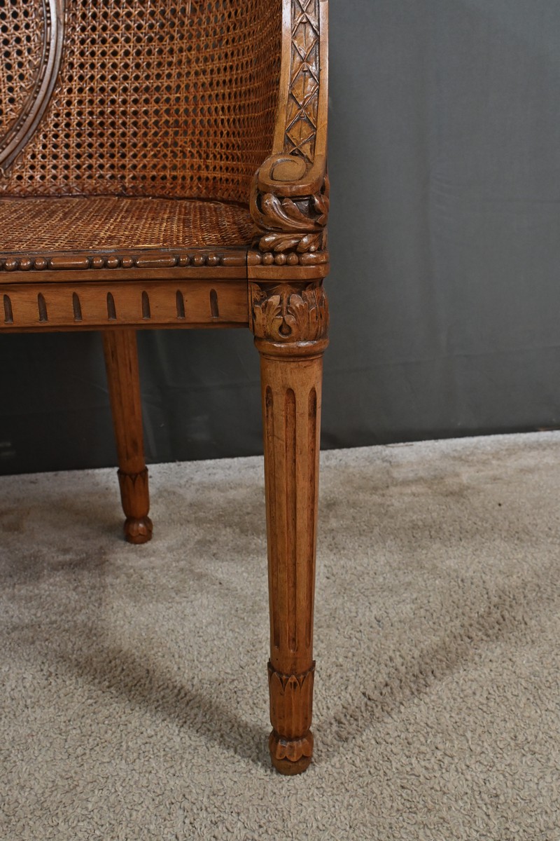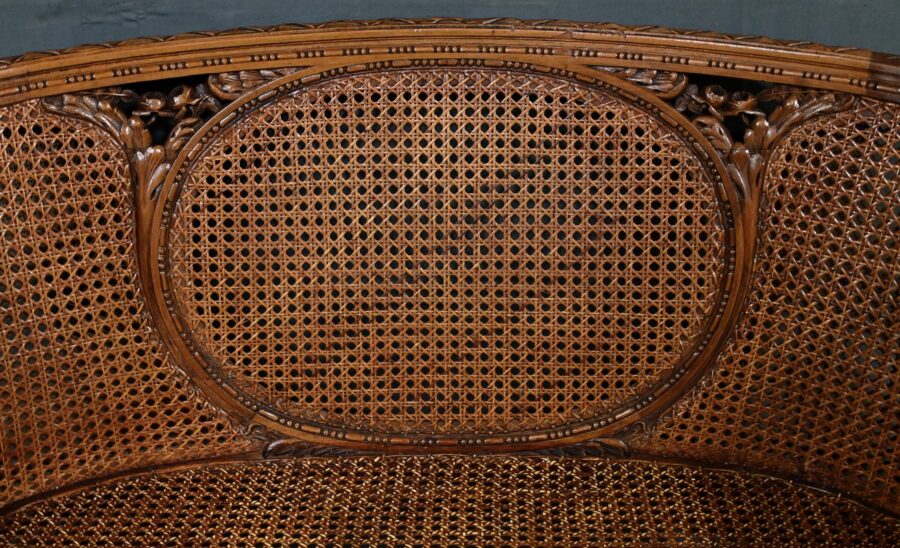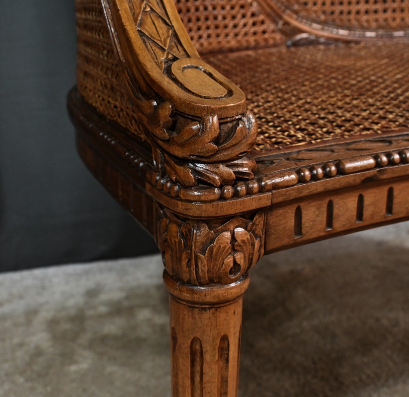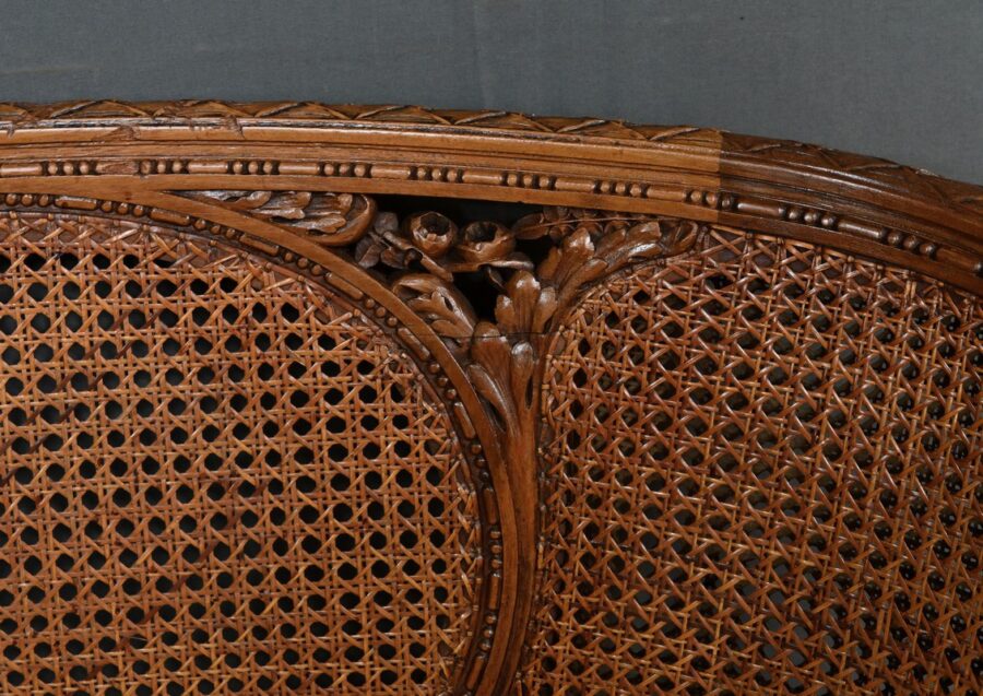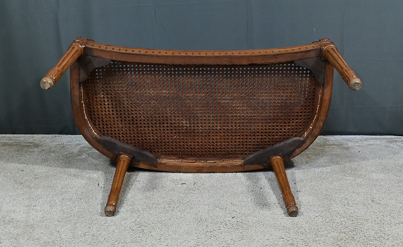 Charmante banquette corbeille en noyer de style Louis XVI datant du XIXe siècle. Ce mobilier est richement sculpté de frises de perles, de losanges, de fleurs et de feuillage. L’assise et le dossier sont cannés. Ce dernier est muni d’un médaillon horizontal accompagné de sculptures ajourées de fleurs. Cette banquette repose sur des pieds fuselés et cannelés.