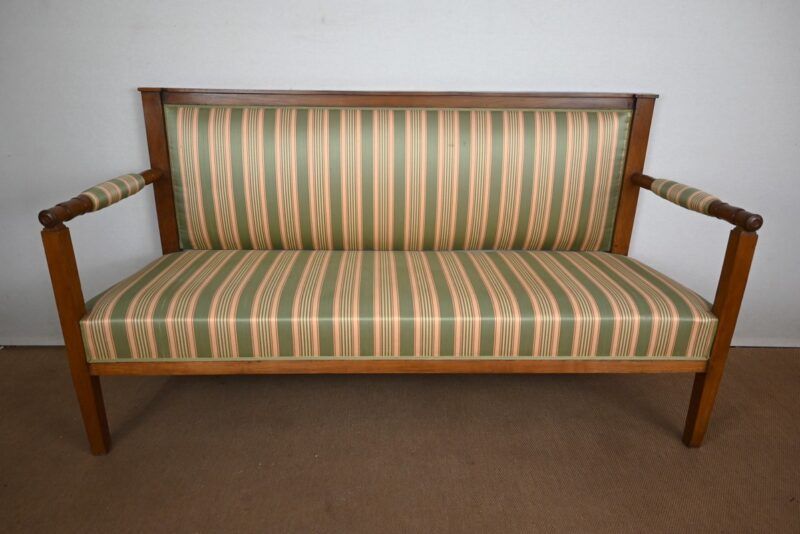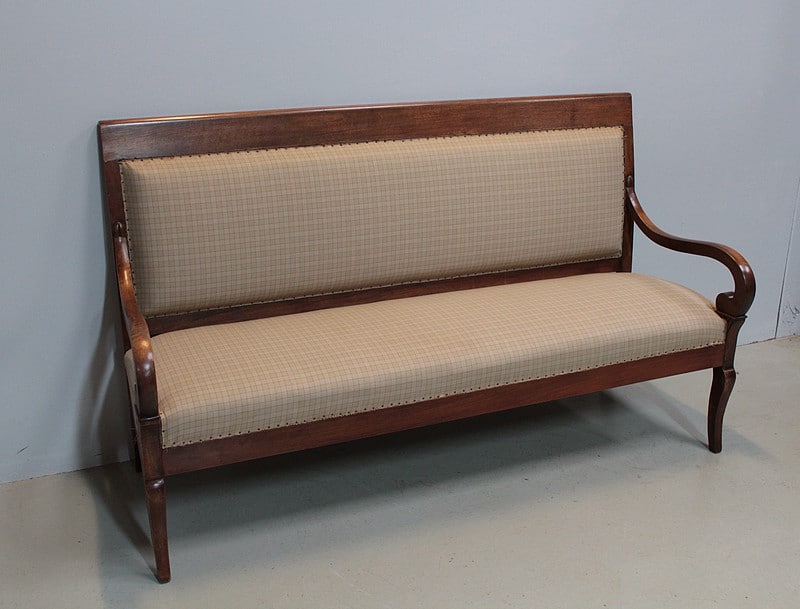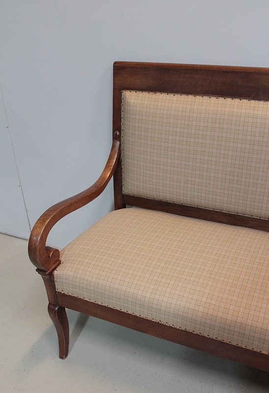 Banquette Restauration en noyer massif. Accotoirs à crosses.