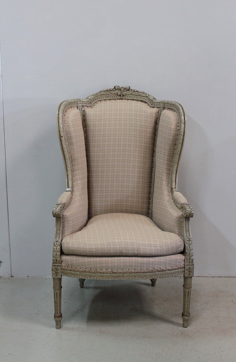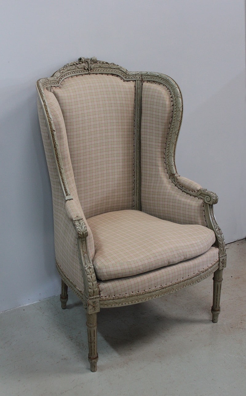 Elle est recouverte d’un tissus à carreaux à faire retapisser selon votre goût.