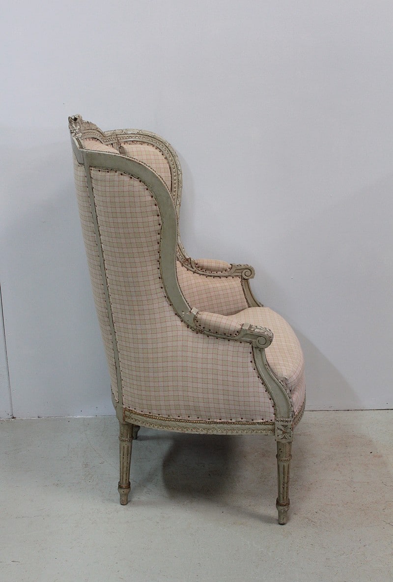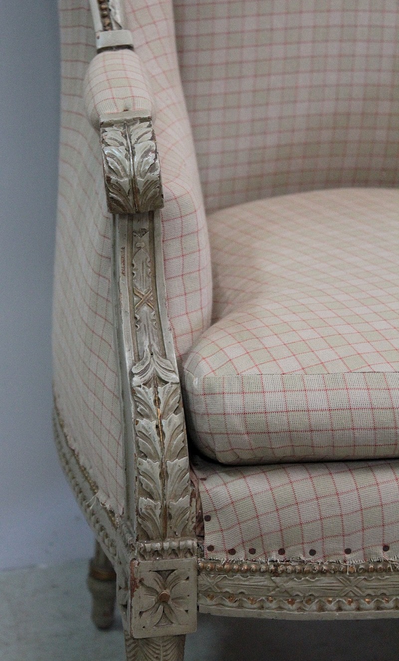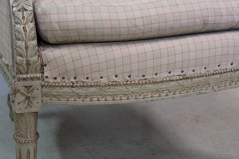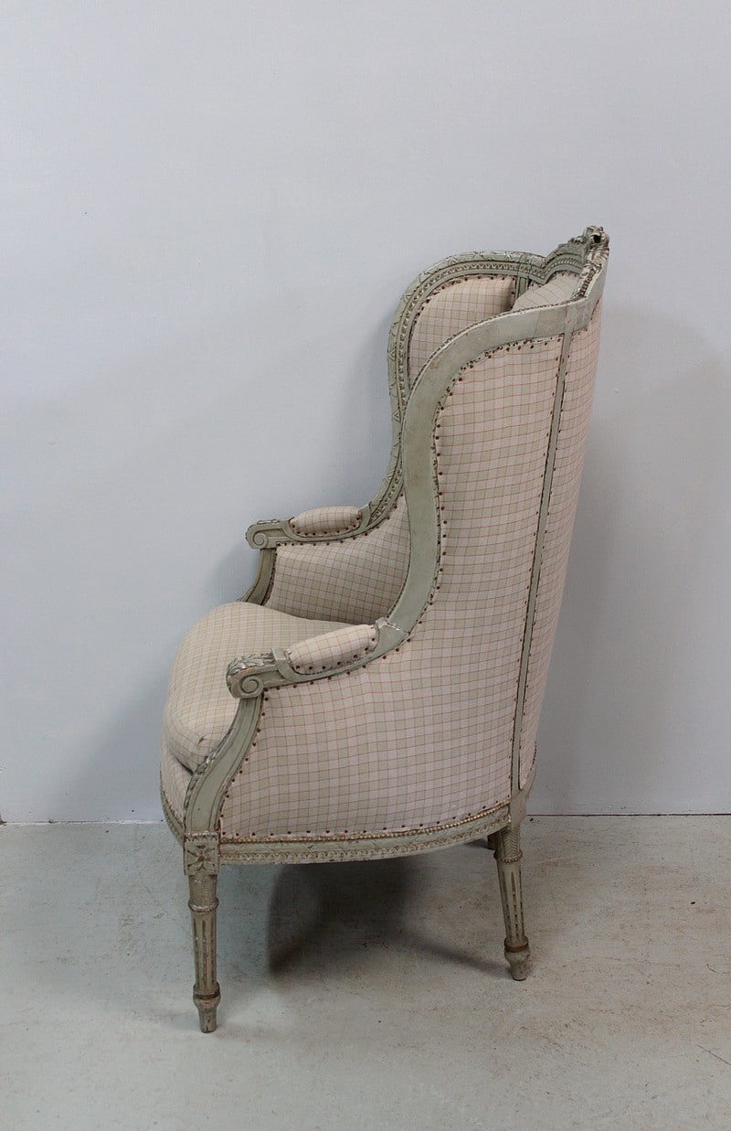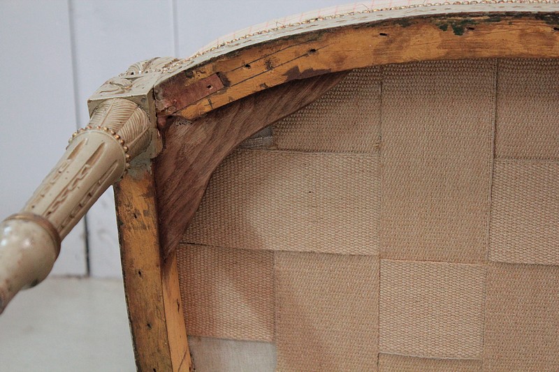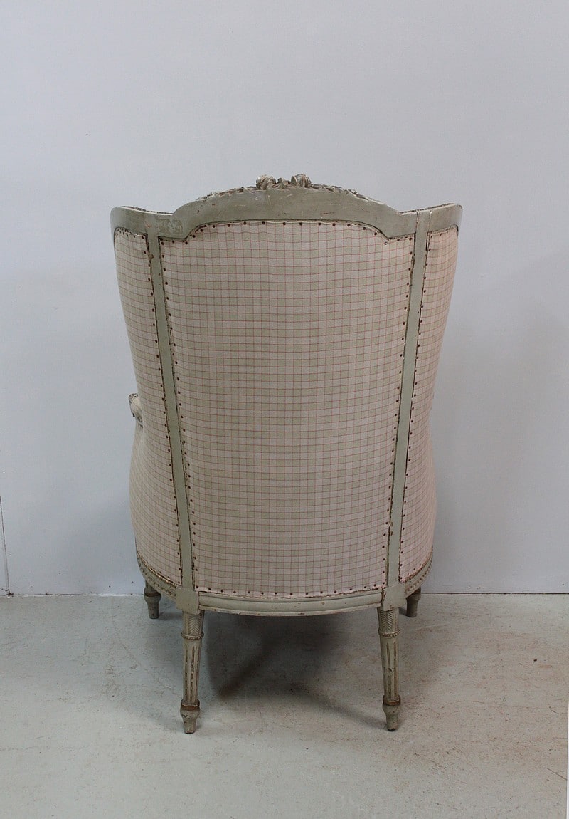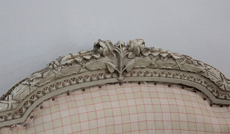 Son ossature sculptée sur toutes ses faces visibles arbore en partie haute du dossier un décor de boutons de roses. Peinture gris-vert d’origine rehaussées de perles dorées.