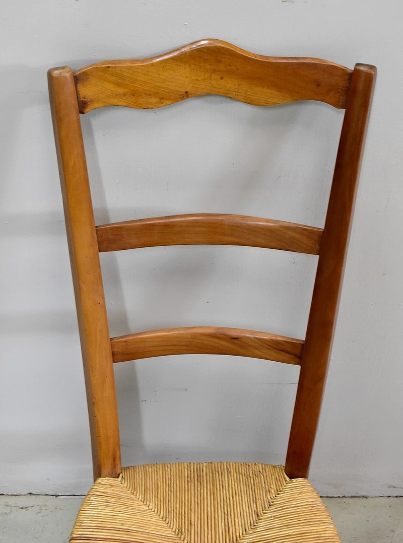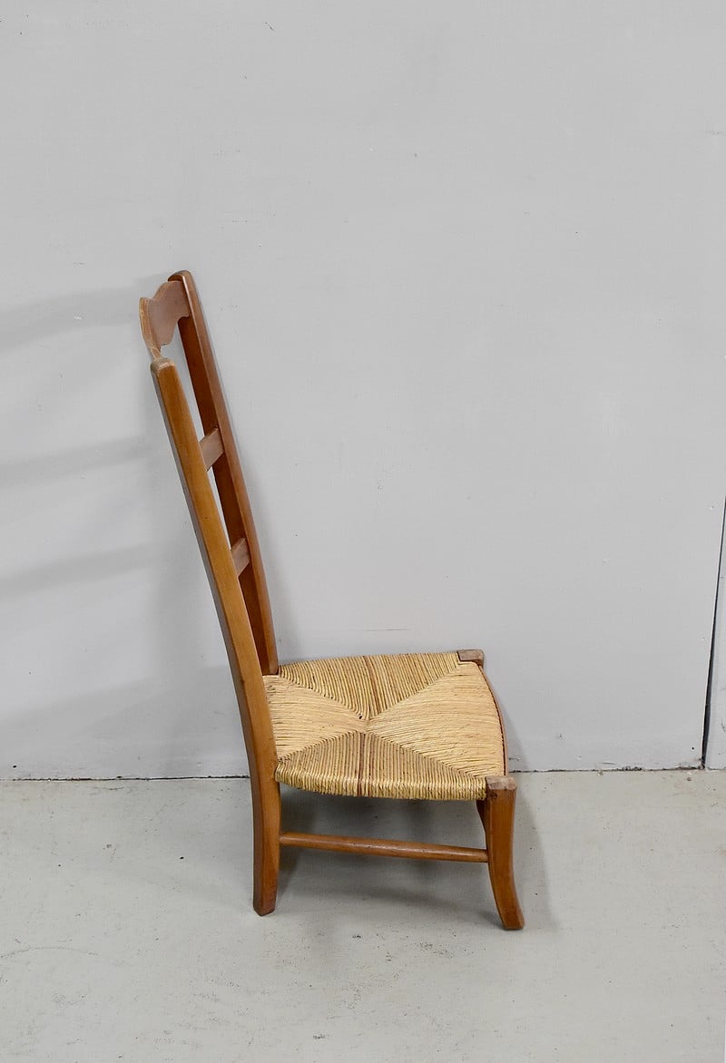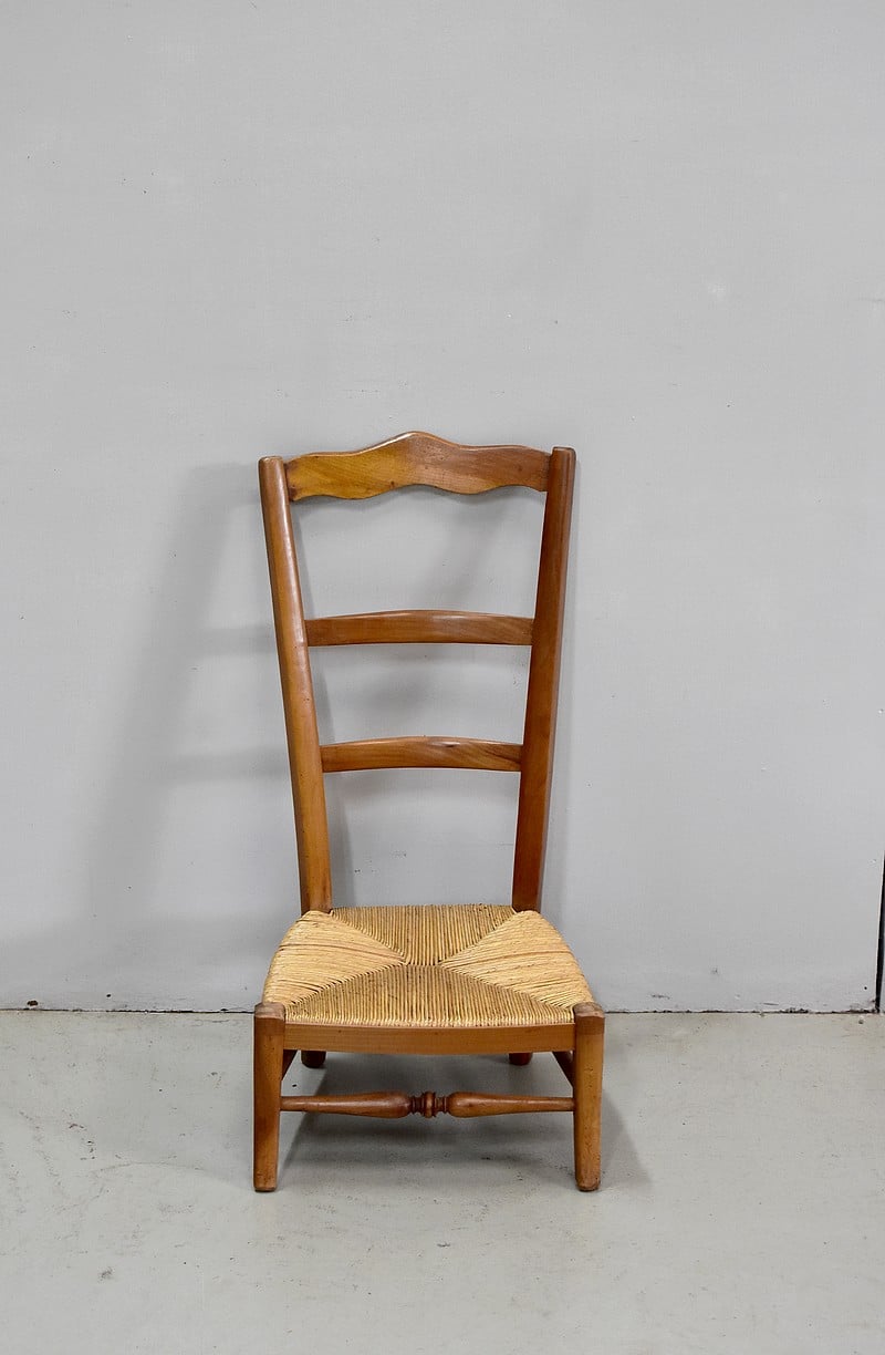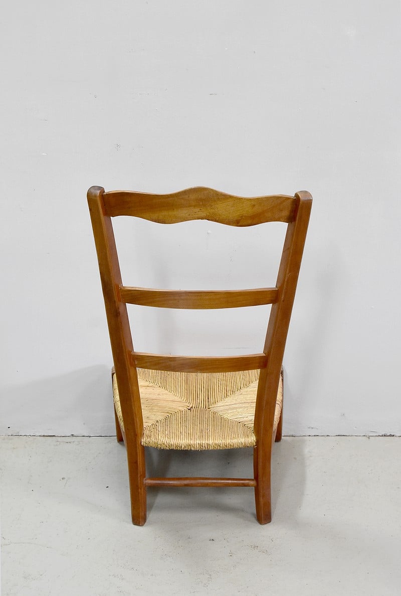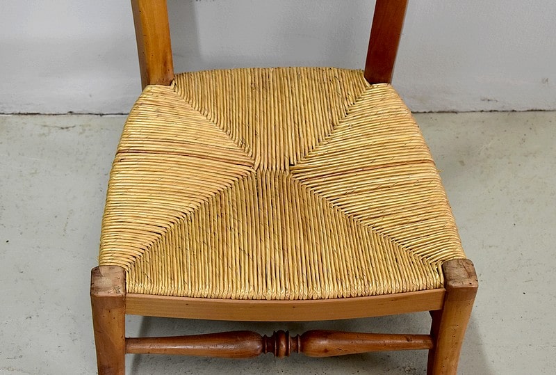 Elle repose sur 2 pieds sabres à l’avant et 2 pieds droits à l’arrière barreautés entre eux et dont le barreau de devant est tourné et sculpté.