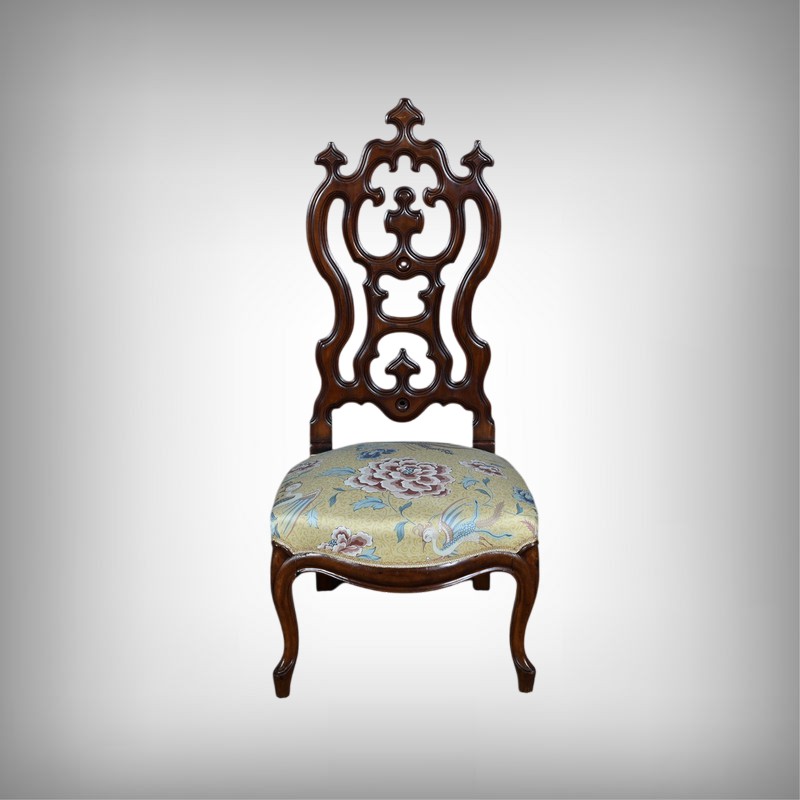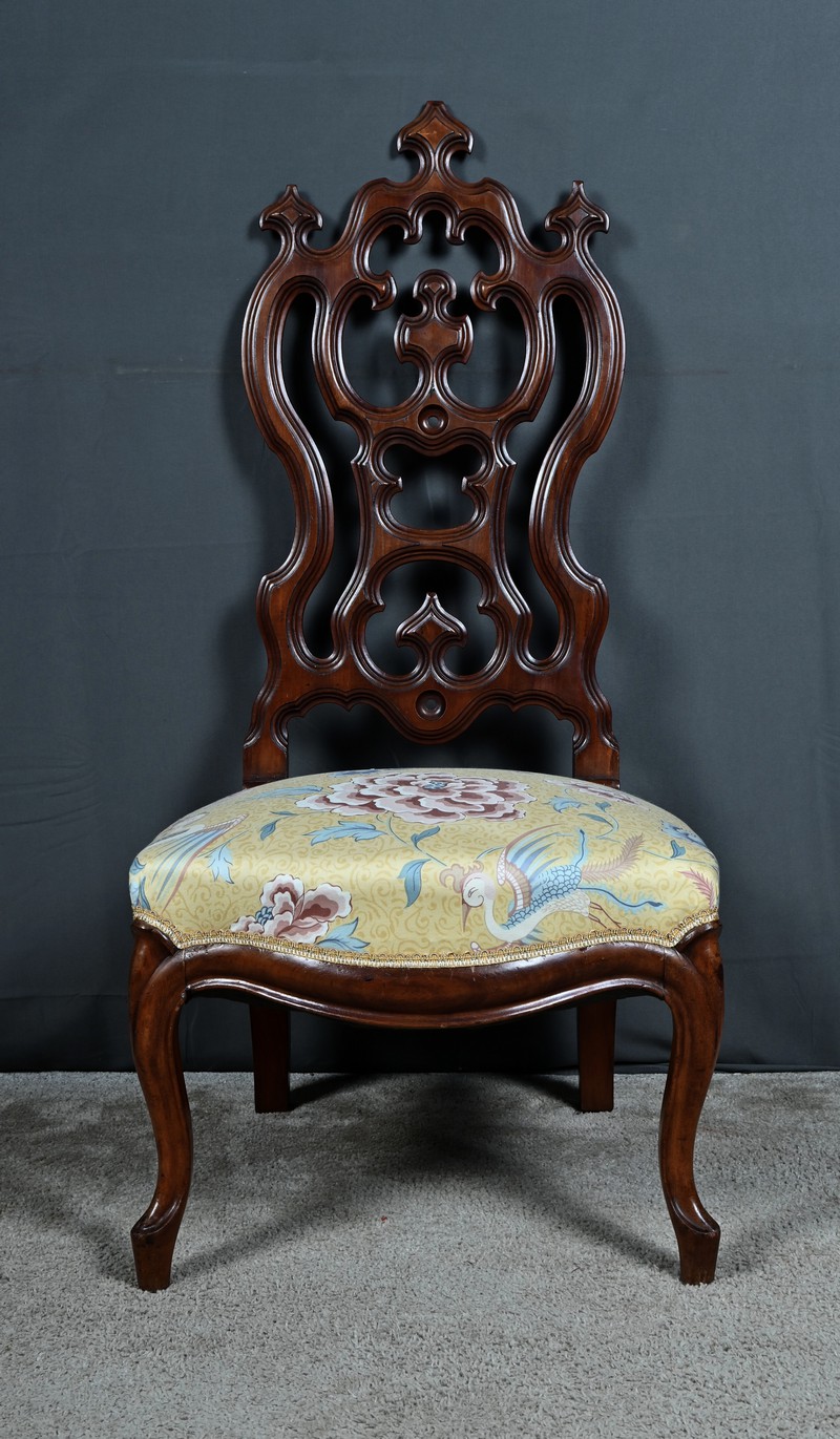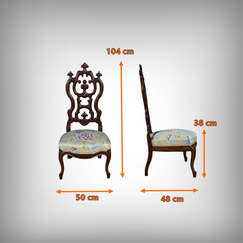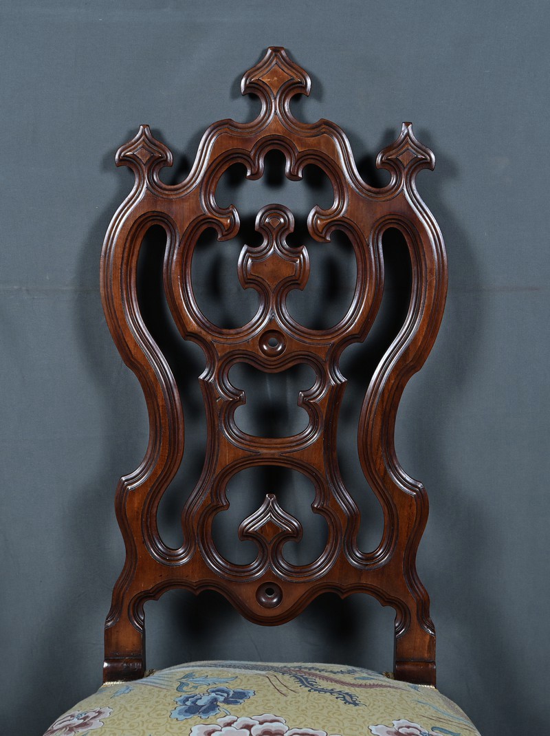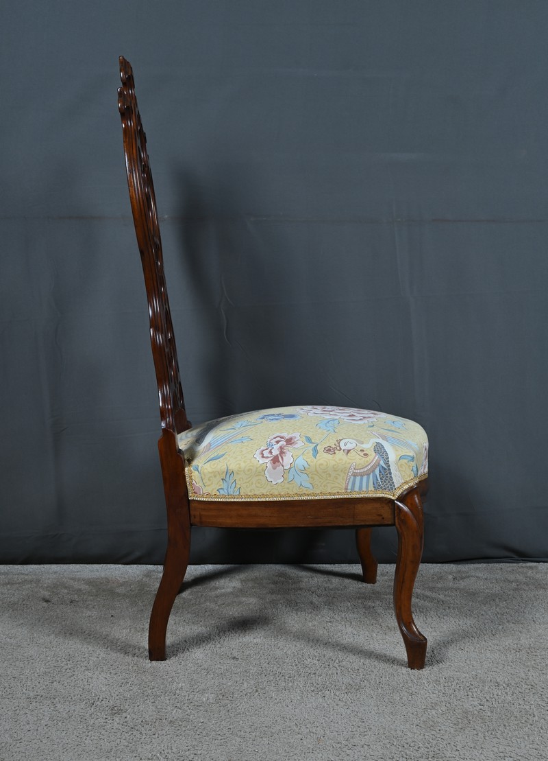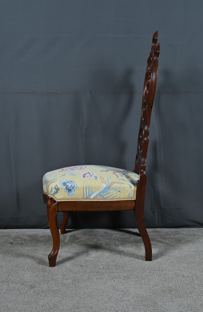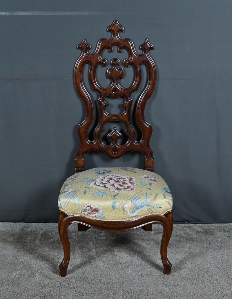 Le dossier ajouré, haut et majestueux, est orné de sculptures finement travaillées. Les motifs floraux et symétriques, typiques de l’époque, témoignent d’un grand savoir-faire artisanal.