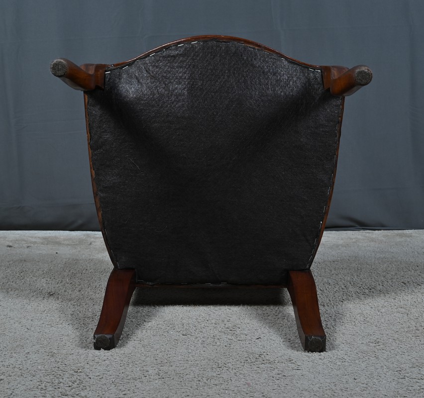 Cette belle chaise de nourrice en acajou est une pièce emblématique de l’époque Napoléon III. Son bois noble lui confère une teinte profonde, sublimée par une finition qui révèle toute la richesse de ses veines naturelles.