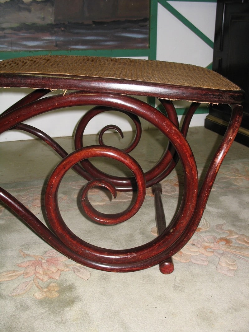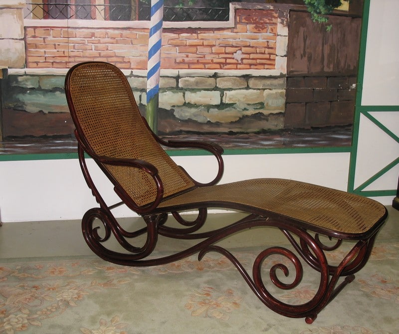 Chaise-longue en hêtre courbé, teinté acajou, et cannage. Le dossier est inclinable à 6 positions. Elle est signée ‘THONET – Wien’.