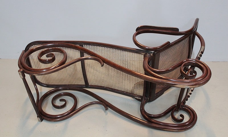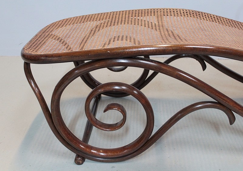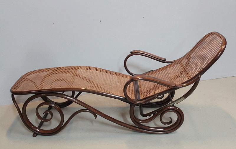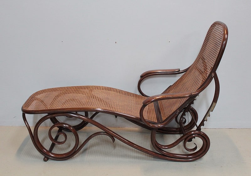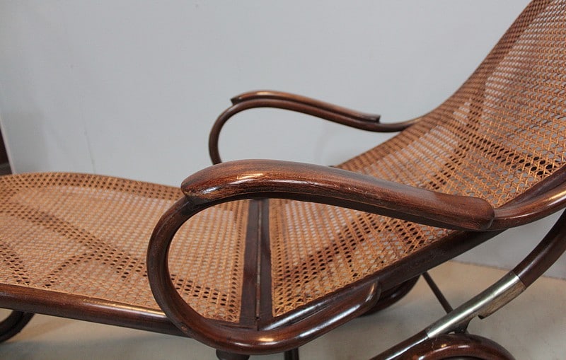Chaise longue en hêtre courbé et teinté avec assise en cannage.