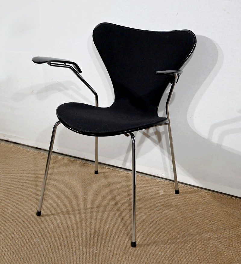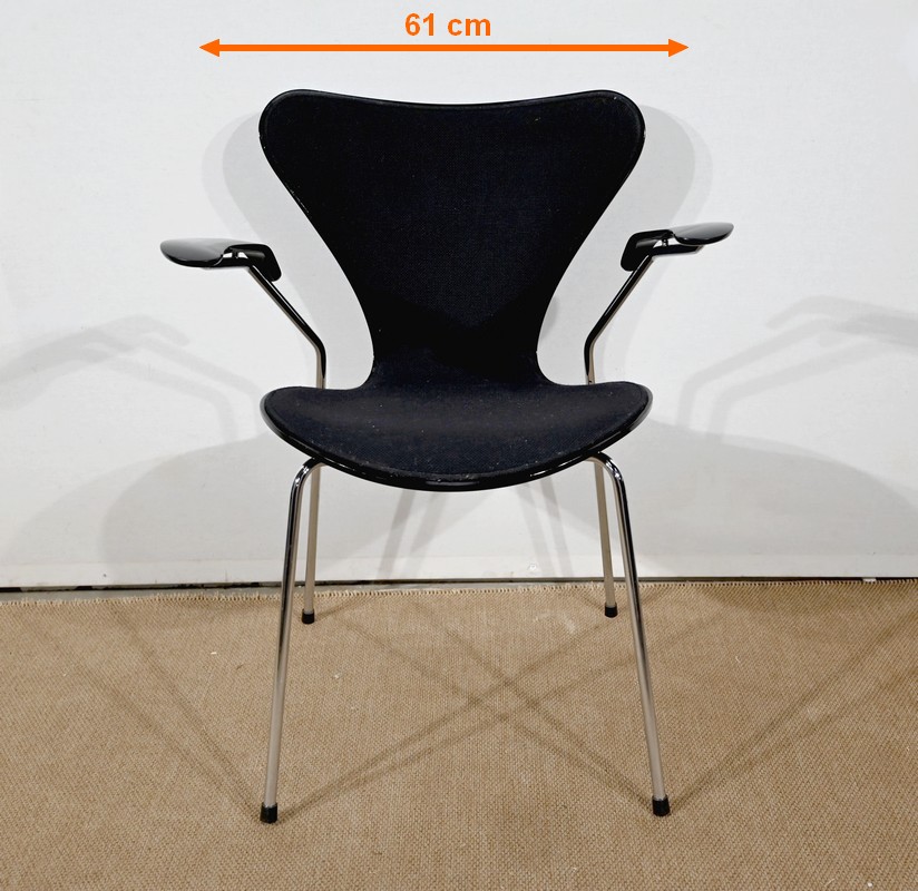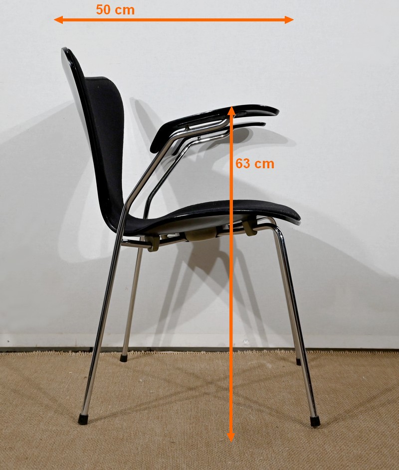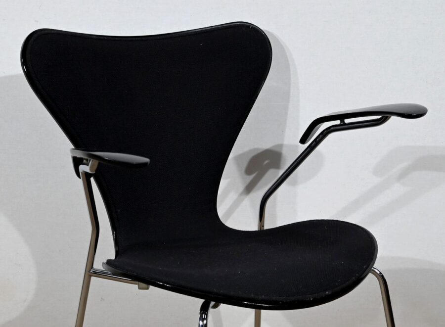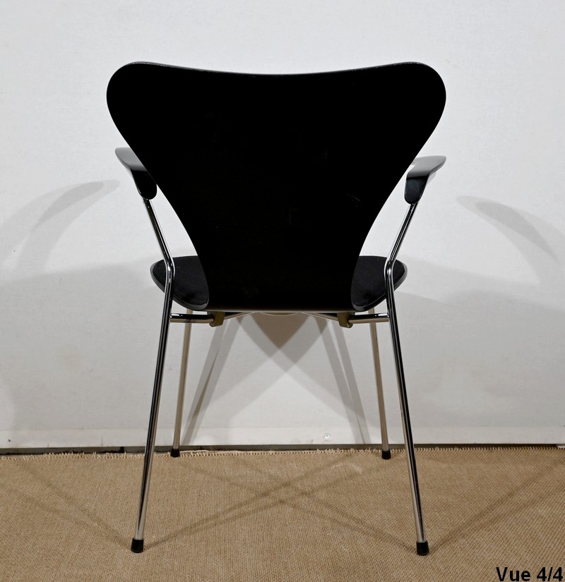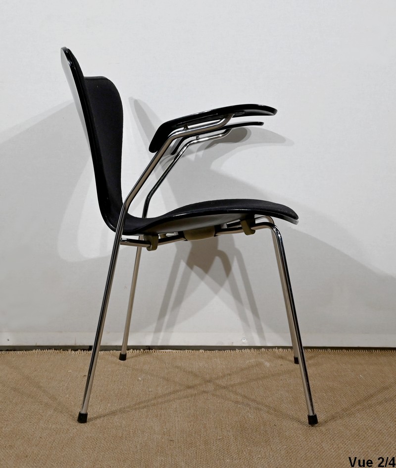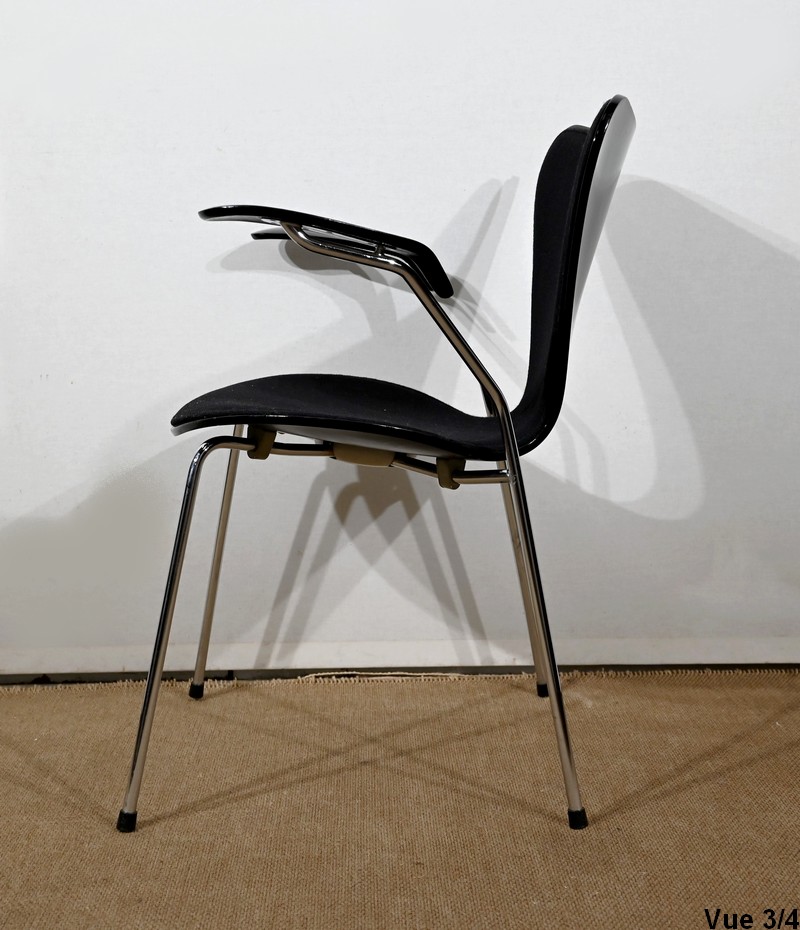 Chaise « Série 7 » modèle 3107 à accotoirs de Arne Jacobsen pour la manufacture danoise Fritz Hansen. Jacobsen est un designer emblématique du courant scandinave du XXe siècle, guidé par la philosophie selon laquelle un simple meuble peut transformer tout un espace.