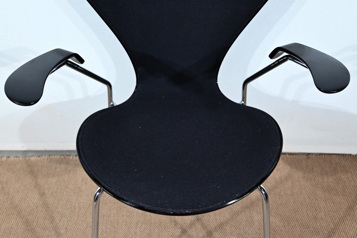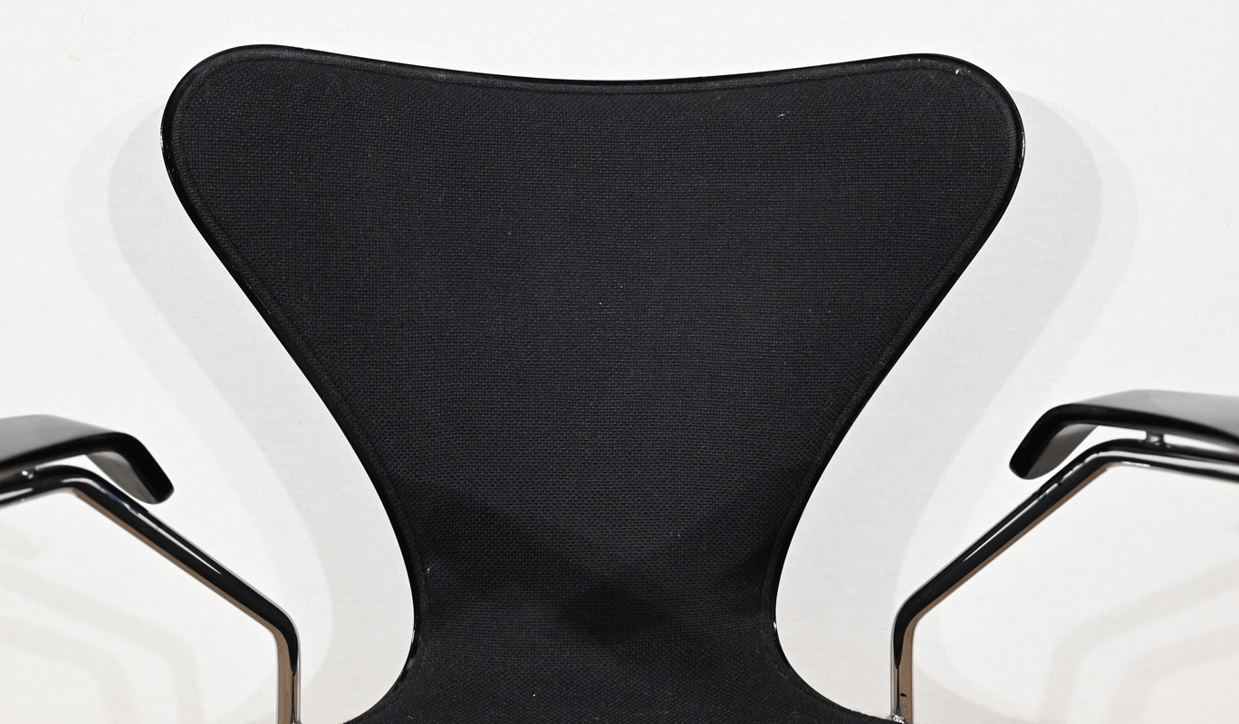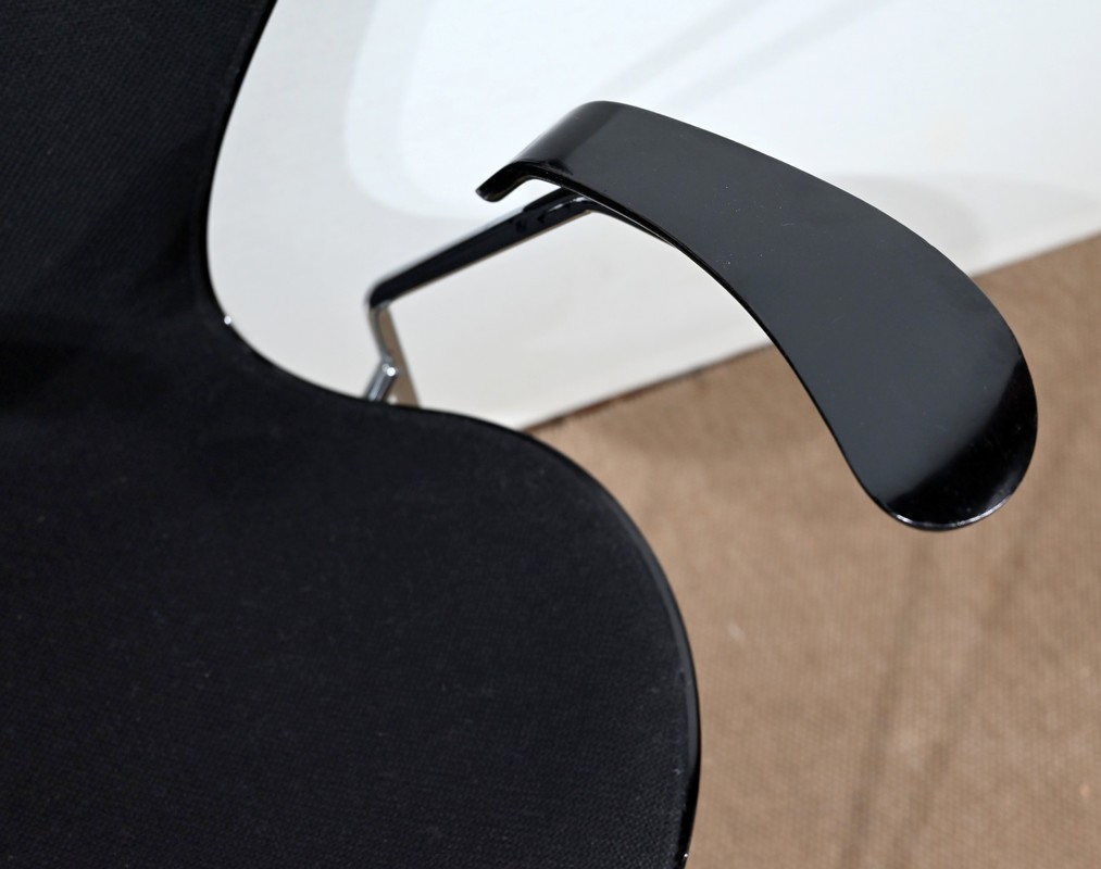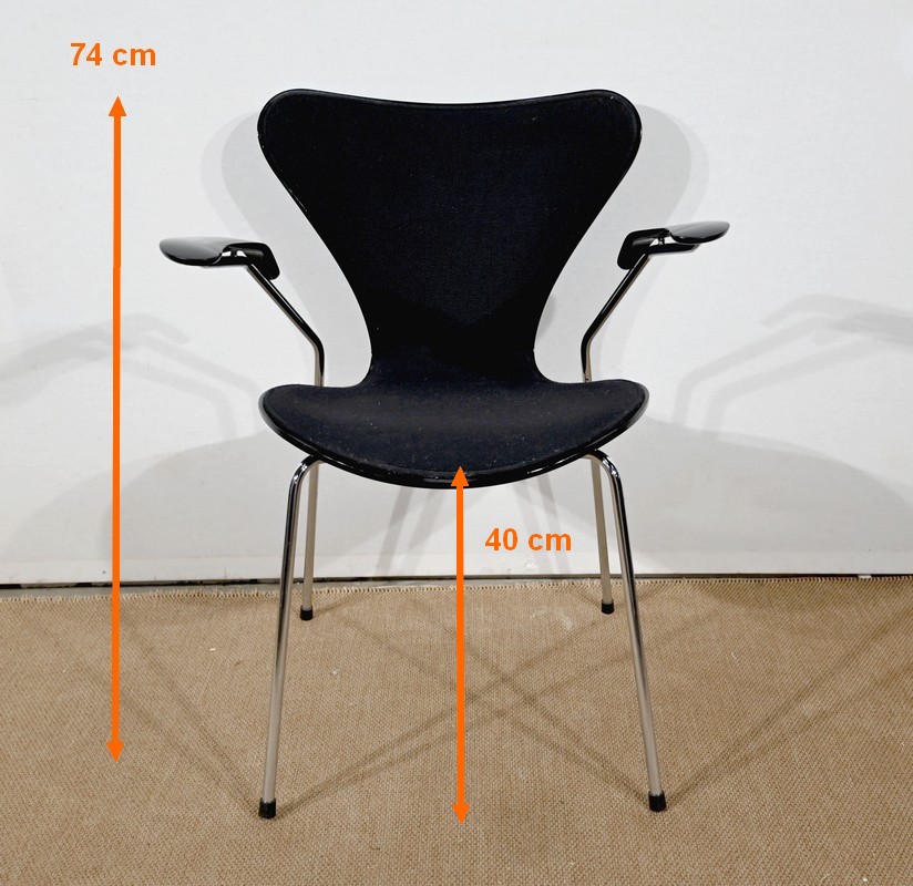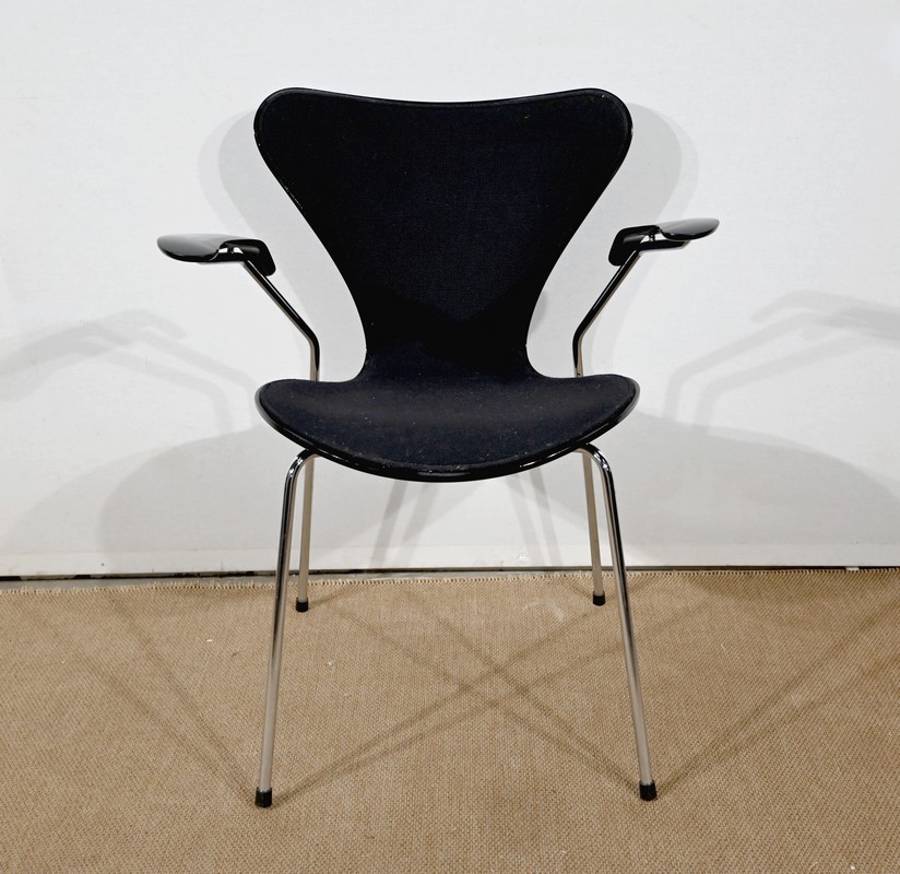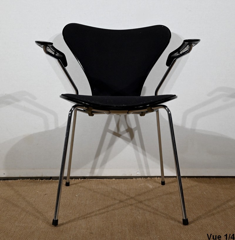 Chaise « Série 7 » modèle 3107 à accotoirs de Arne Jacobsen pour la manufacture danoise Fritz Hansen. Jacobsen est un designer emblématique du courant scandinave du XXe siècle, guidé par la philosophie selon laquelle un simple meuble peut transformer tout un espace.