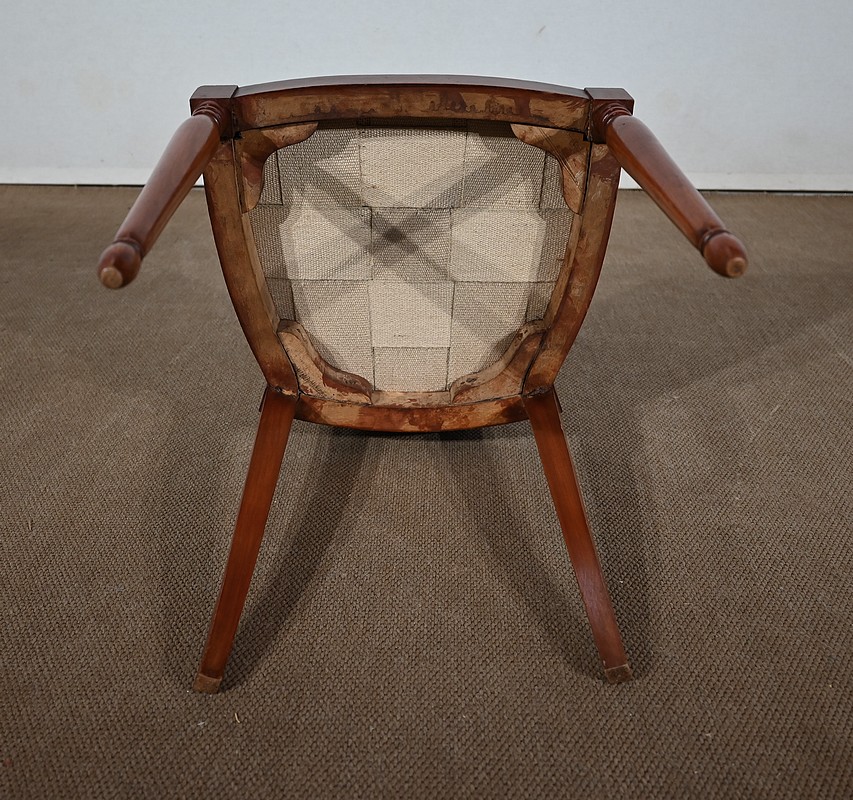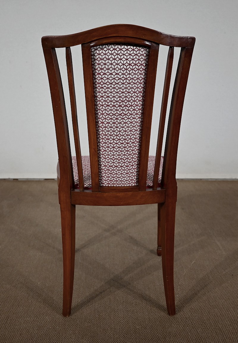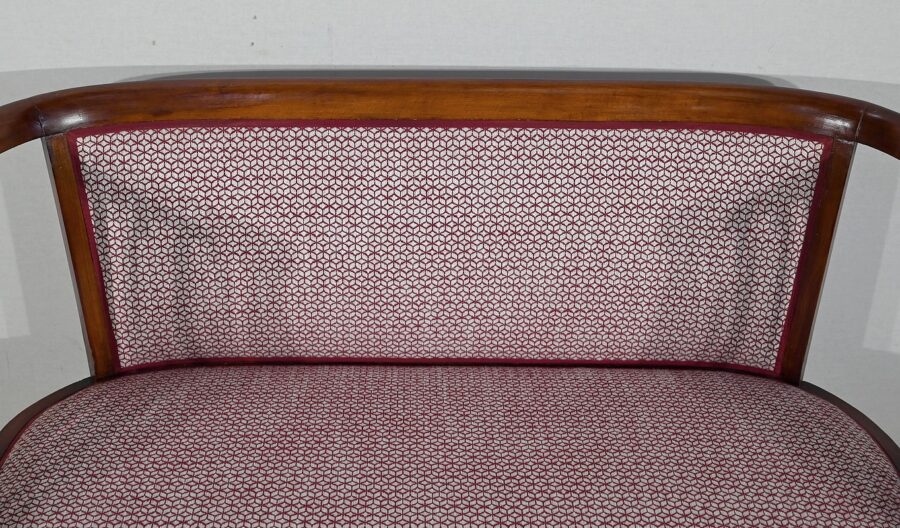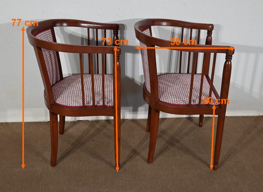 Les dossiers, par leur forme, ainsi que les assises, sont confortables. Chacun des cinq sièges de cet ensemble a bénéficié d’une restauration complète. La tapisserie refaite, avec sangles et crin, est munie d’un tissu aux motifs géométriques blancs et bordeaux, et d’un galon plat.