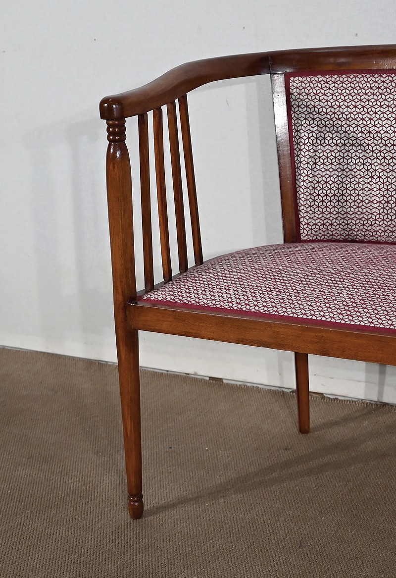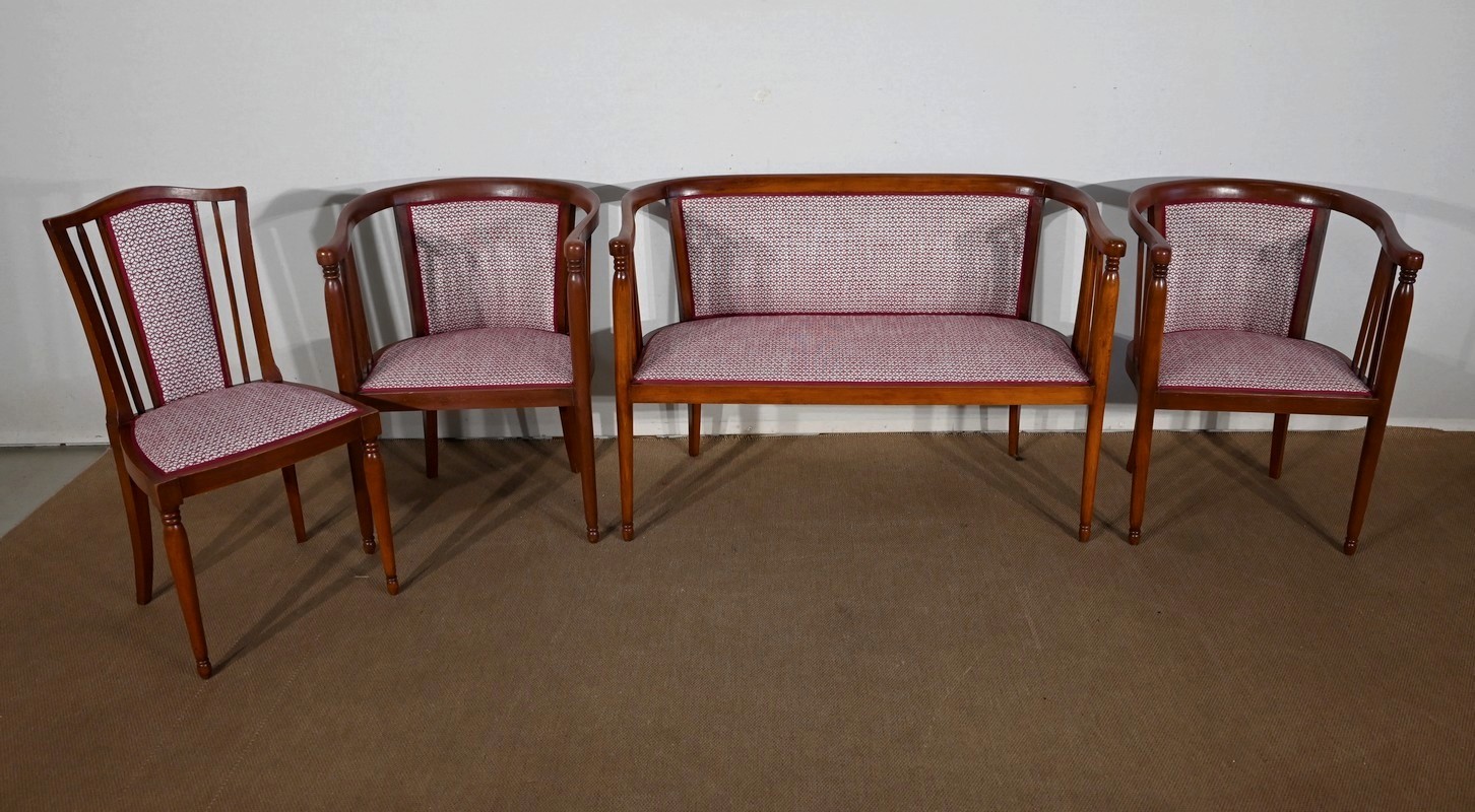 Bel ensemble de salon Art déco restauré et retapissé, constitué d’une banquette deux places, de deux fauteuils et d’une chaise. Le tout en hêtre massif.