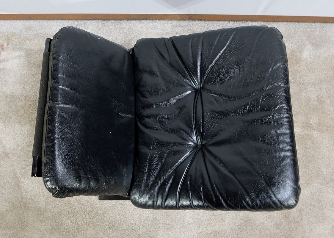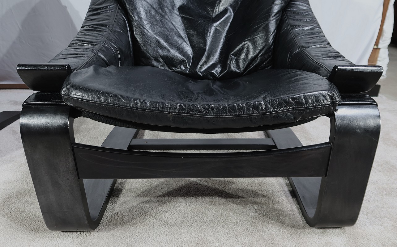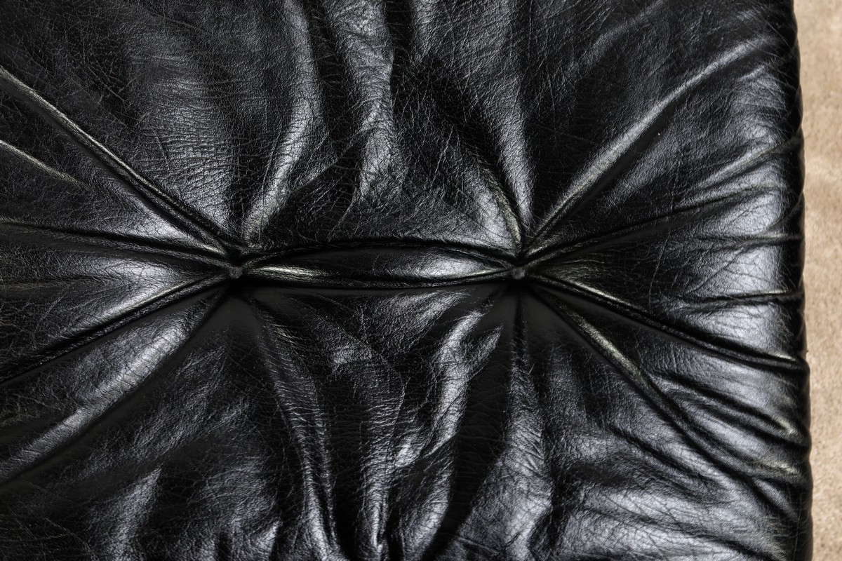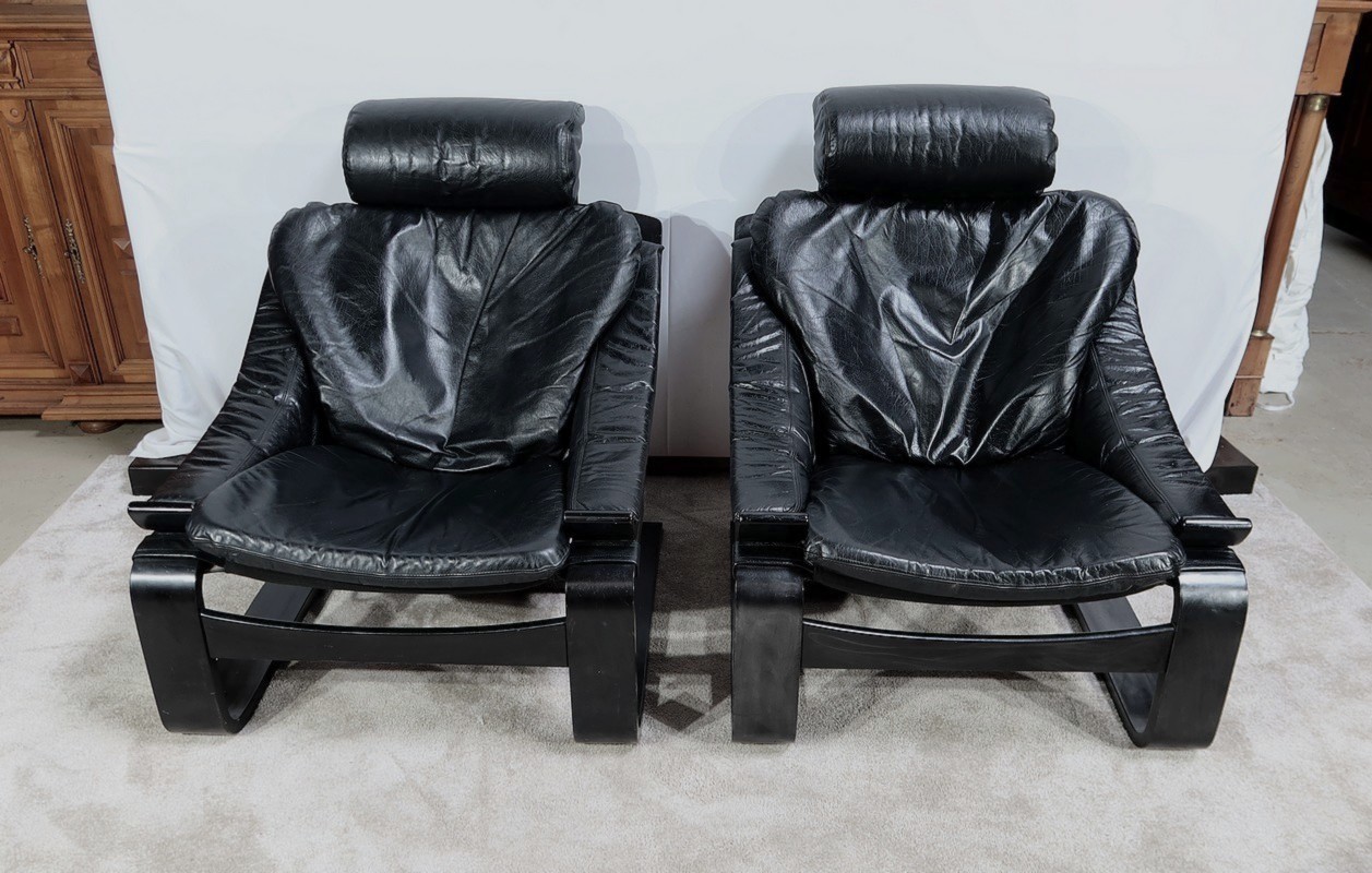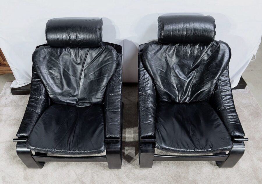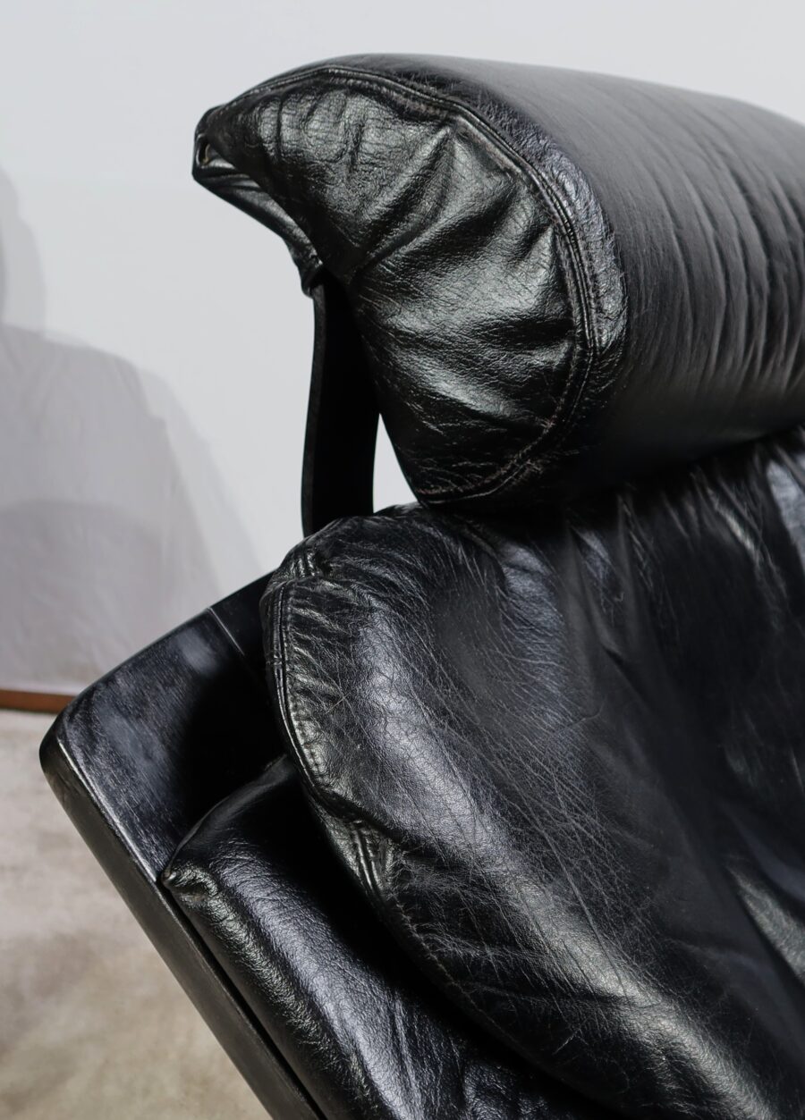 Superbe ensemble de salon en cuir véritable noir, composé de deux fauteuils et d’un repose-pied, dessinés par le designer Ake Fribytter (1922-1998) et fabriqués par la marque suédoise Nelo dans les années 1970. Ils ont été édités en France par Roche Bobois.