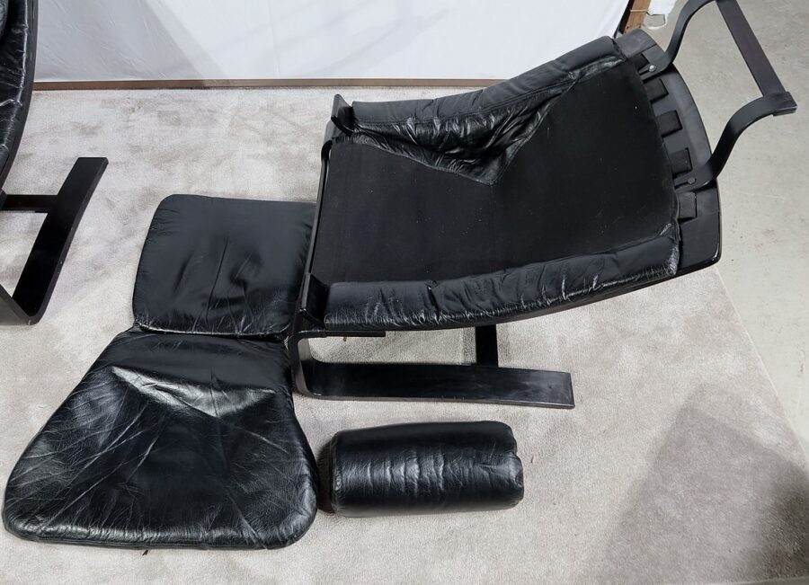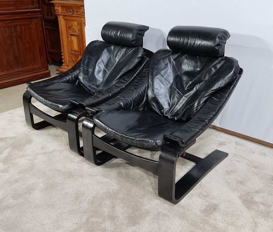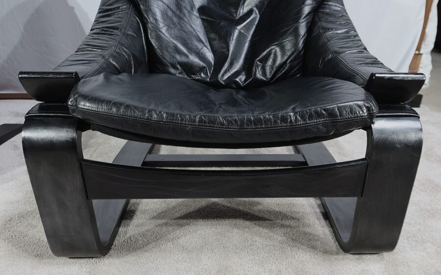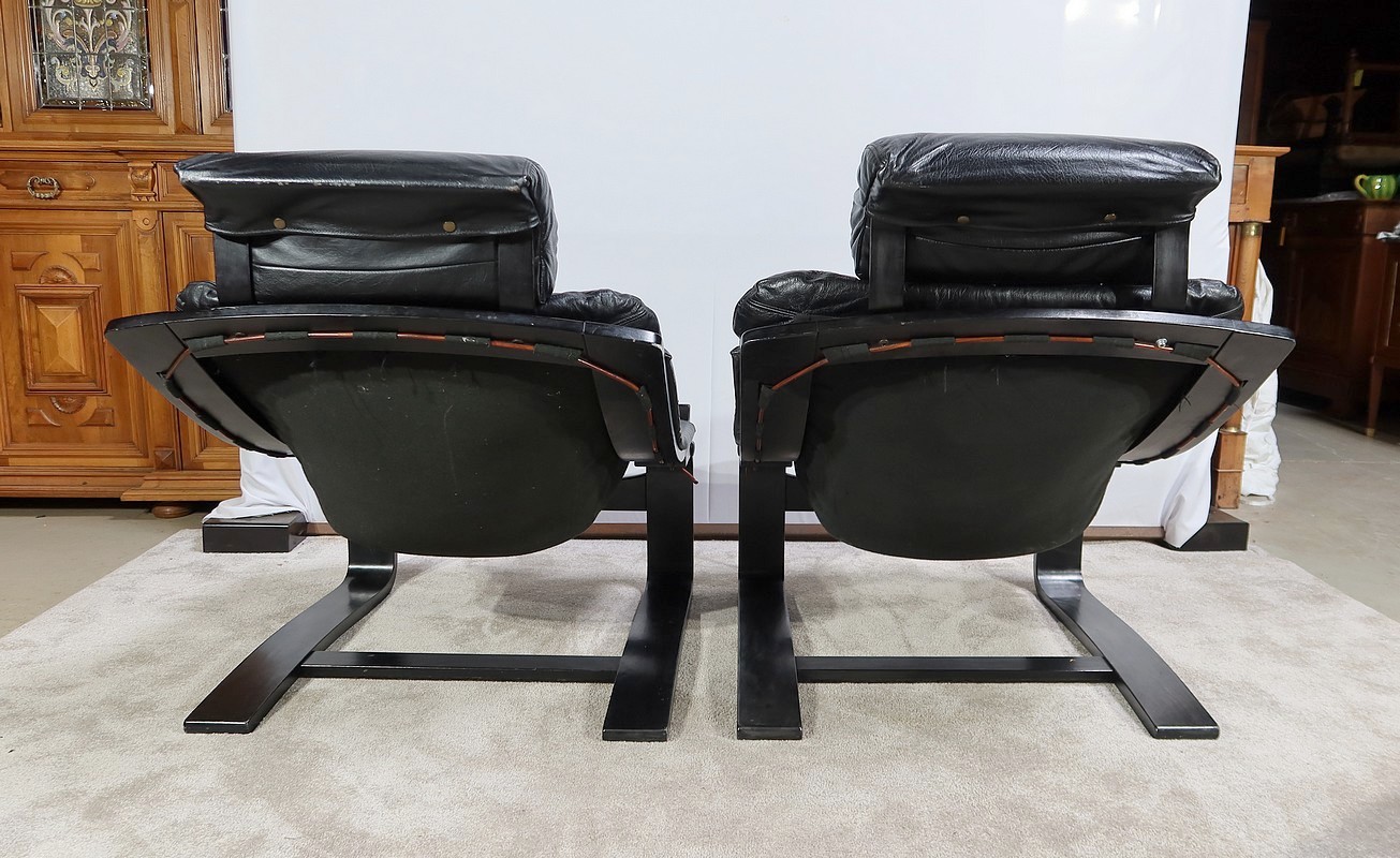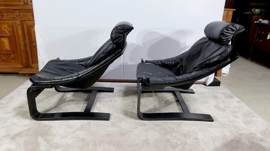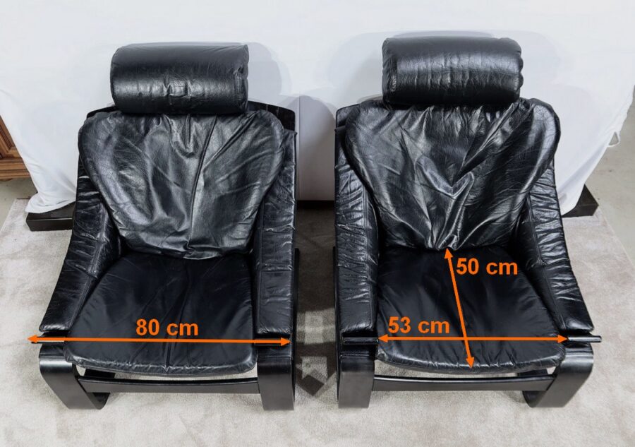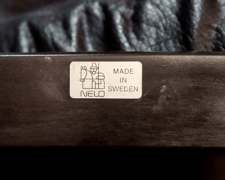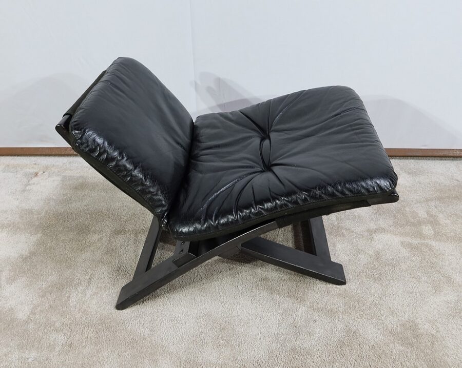 Superbe ensemble de salon en cuir véritable noir, composé de deux fauteuils et d’un repose-pied, dessinés par le designer Ake Fribytter (1922-1998) et fabriqués par la marque suédoise Nelo dans les années 1970. Ils ont été édités en France par Roche Bobois.