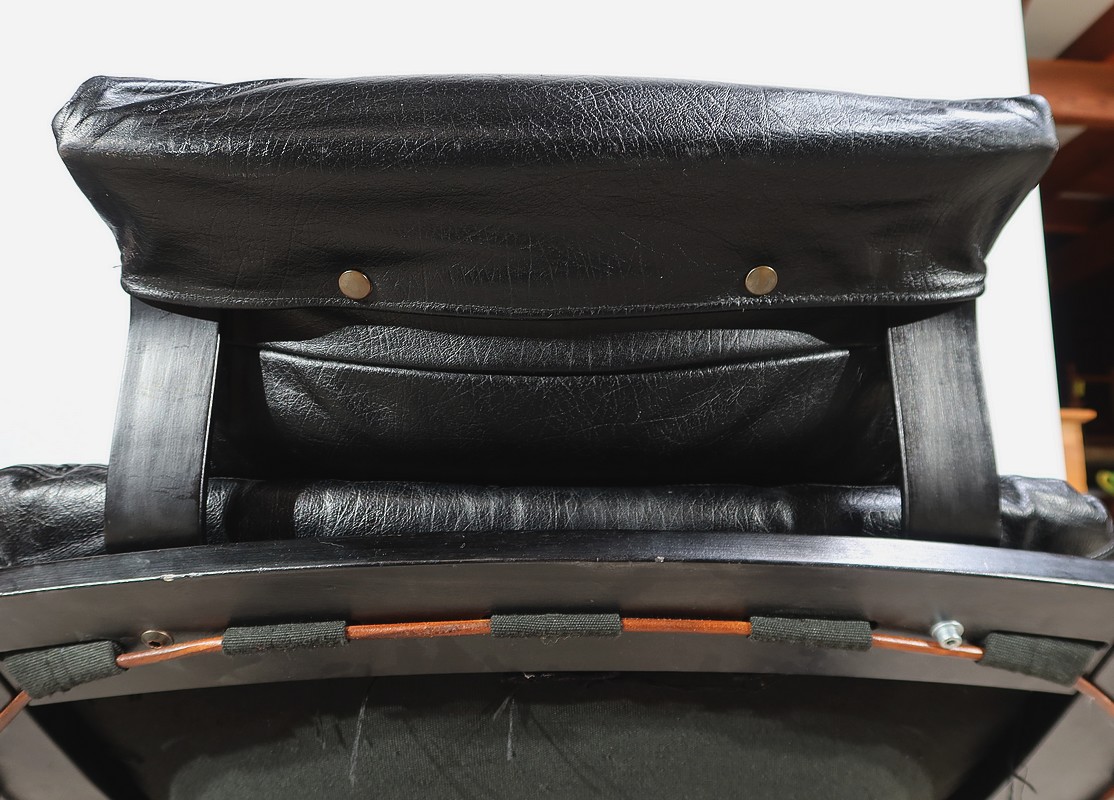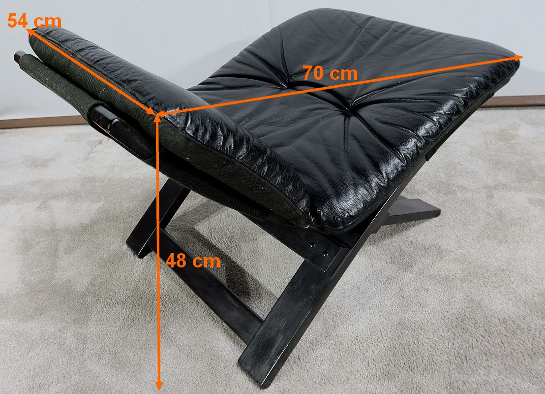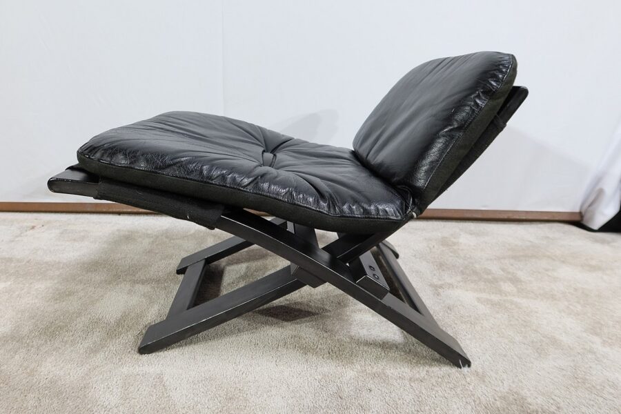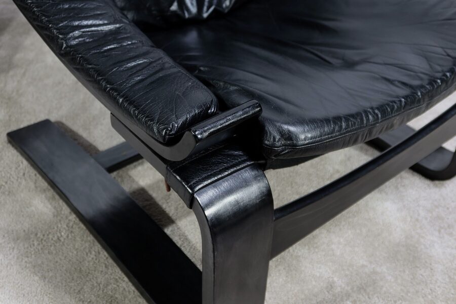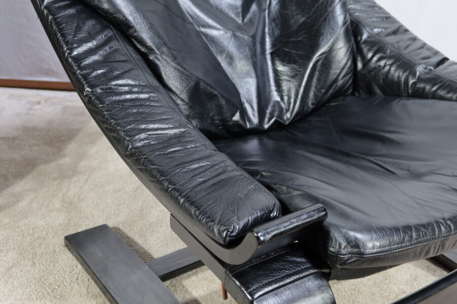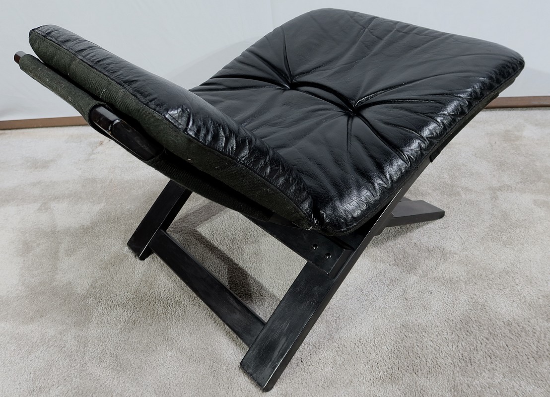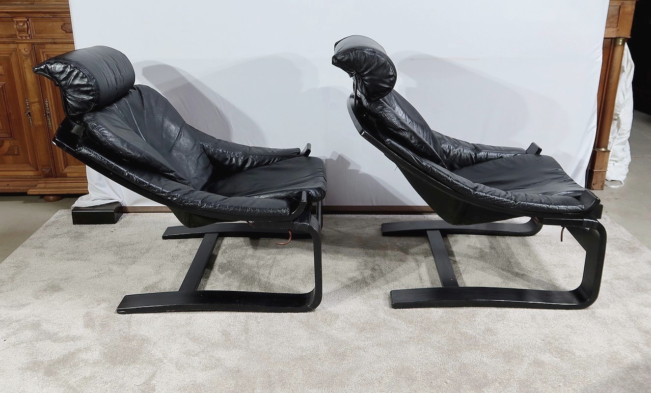 Superbe ensemble de salon en cuir véritable noir, composé de deux fauteuils et d’un repose-pied, dessinés par le designer Ake Fribytter (1922-1998) et fabriqués par la marque suédoise Nelo dans les années 1970. Ils ont été édités en France par Roche Bobois.