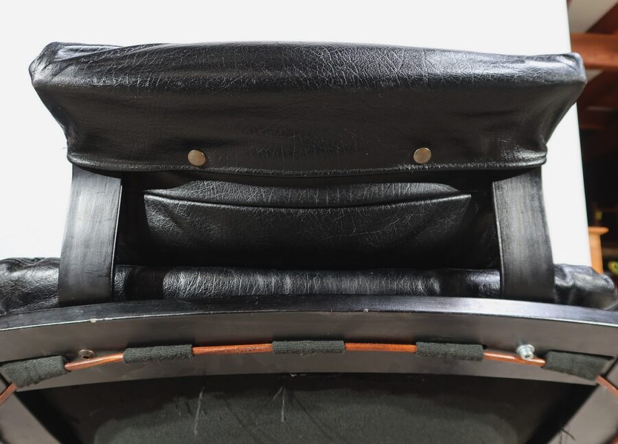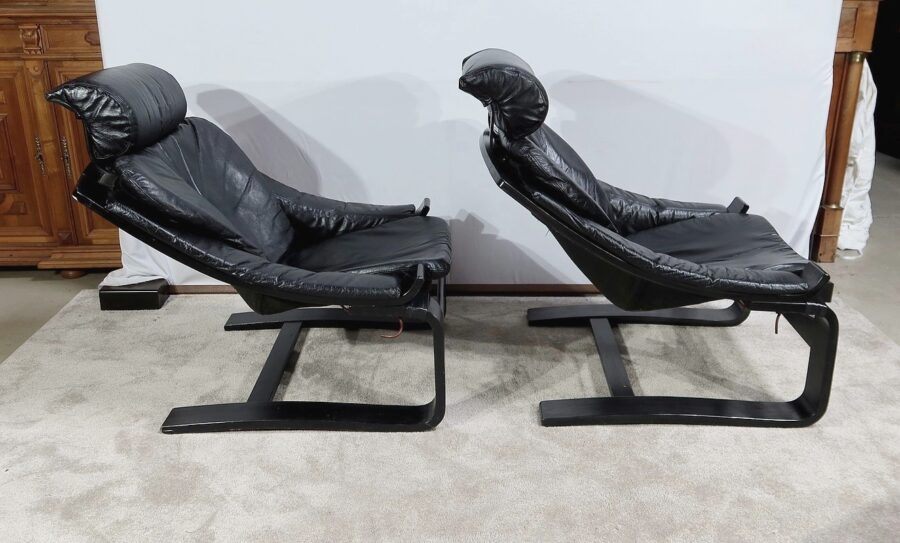 Conçues en 1974, les chaises longues Kraken séduisent par leur cuir, souple et brillant en parfait état, et leur confort. En effet, leur assise en cuir est suspendue sur une toile renforcée tenue sur une structure en bois courbé laquée de noir. Les reposes têtes, coussins et dossiers sont totalement amovibles.