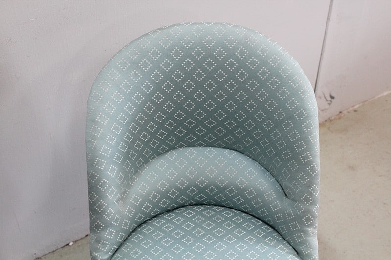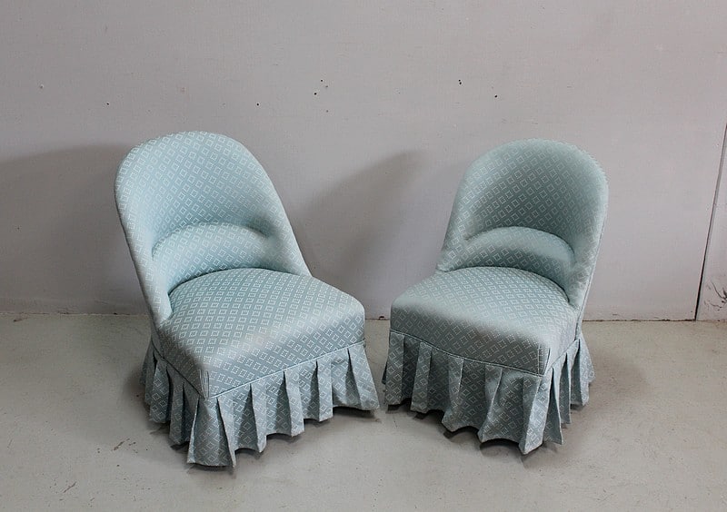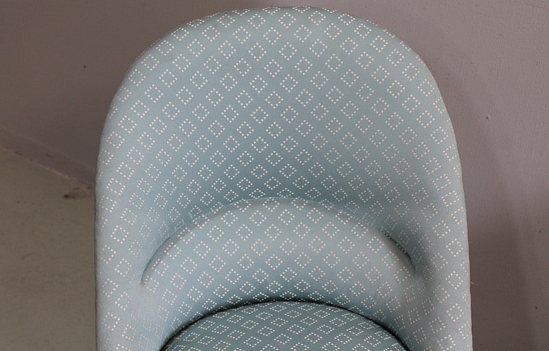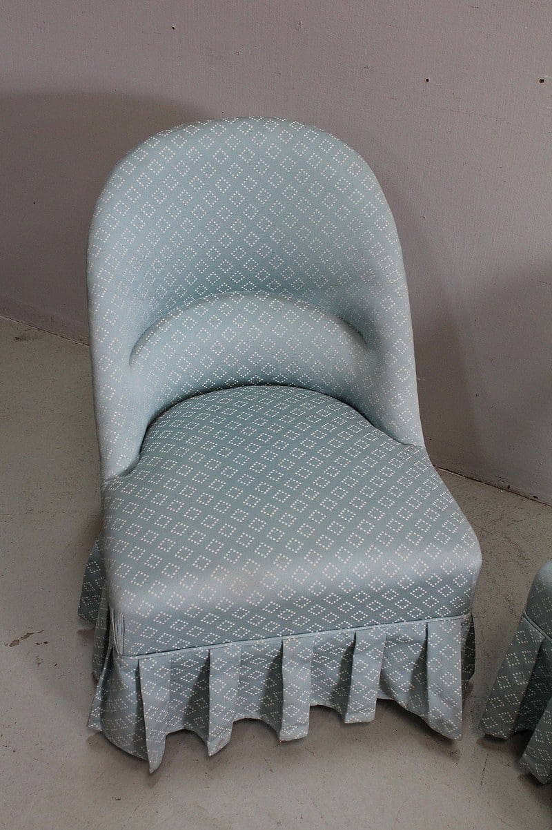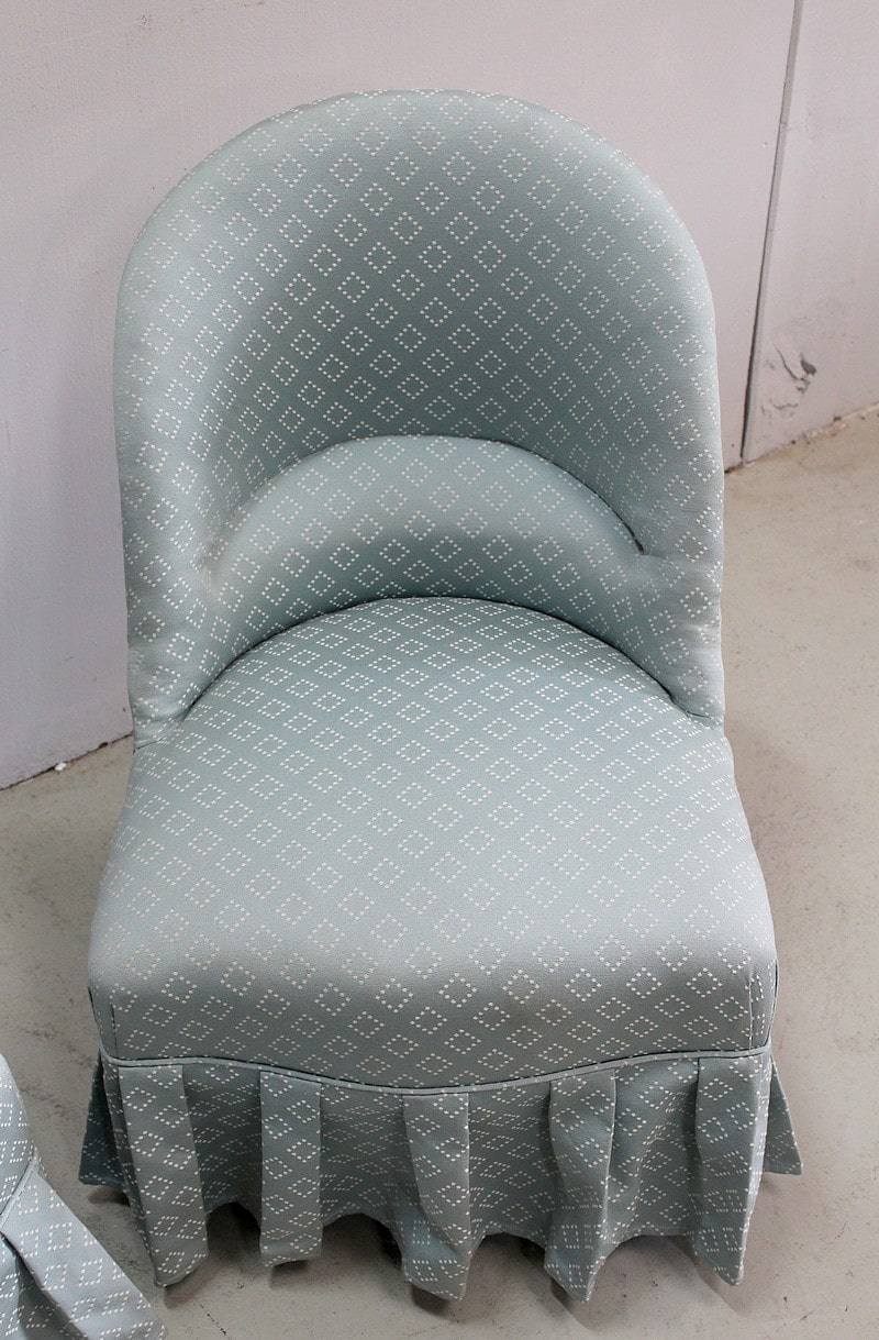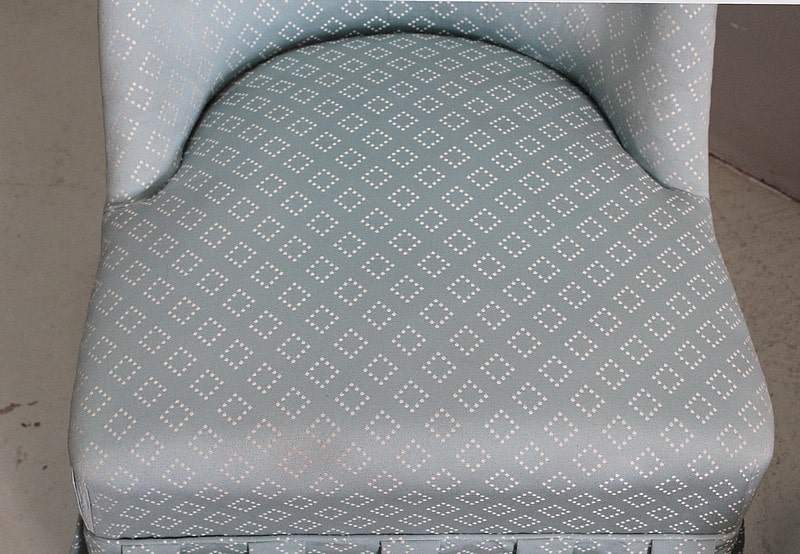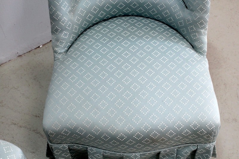 Elles sont recouvertes d’un tissu bleu ciel à losanges blancs en pointillés et les pieds en Acajou sont cachés par des volants faisant tout le tour des fauteuils.
