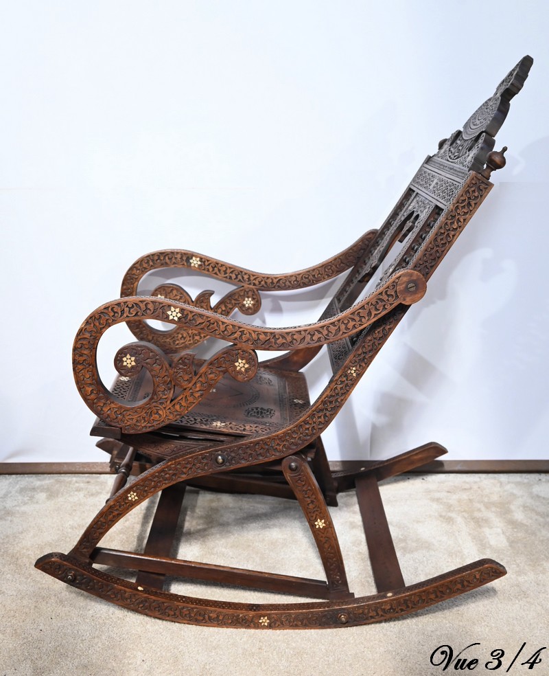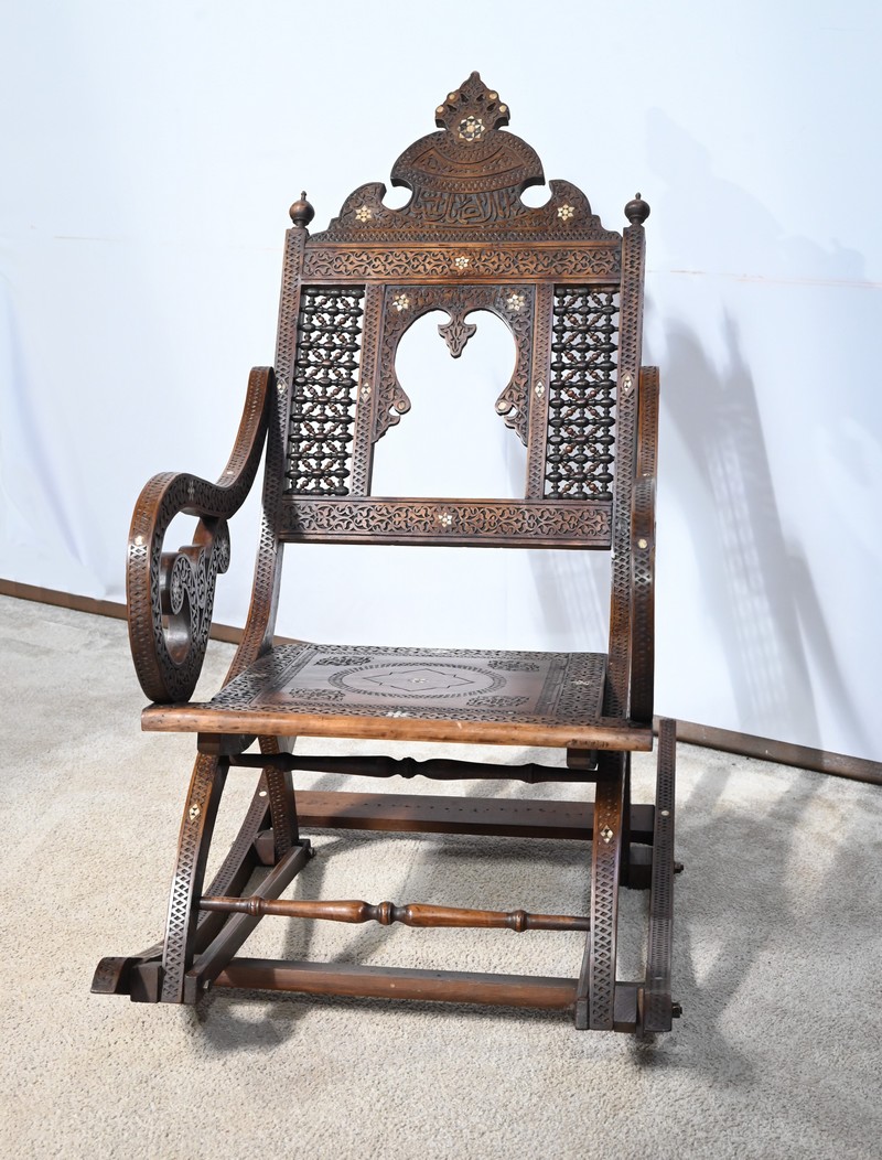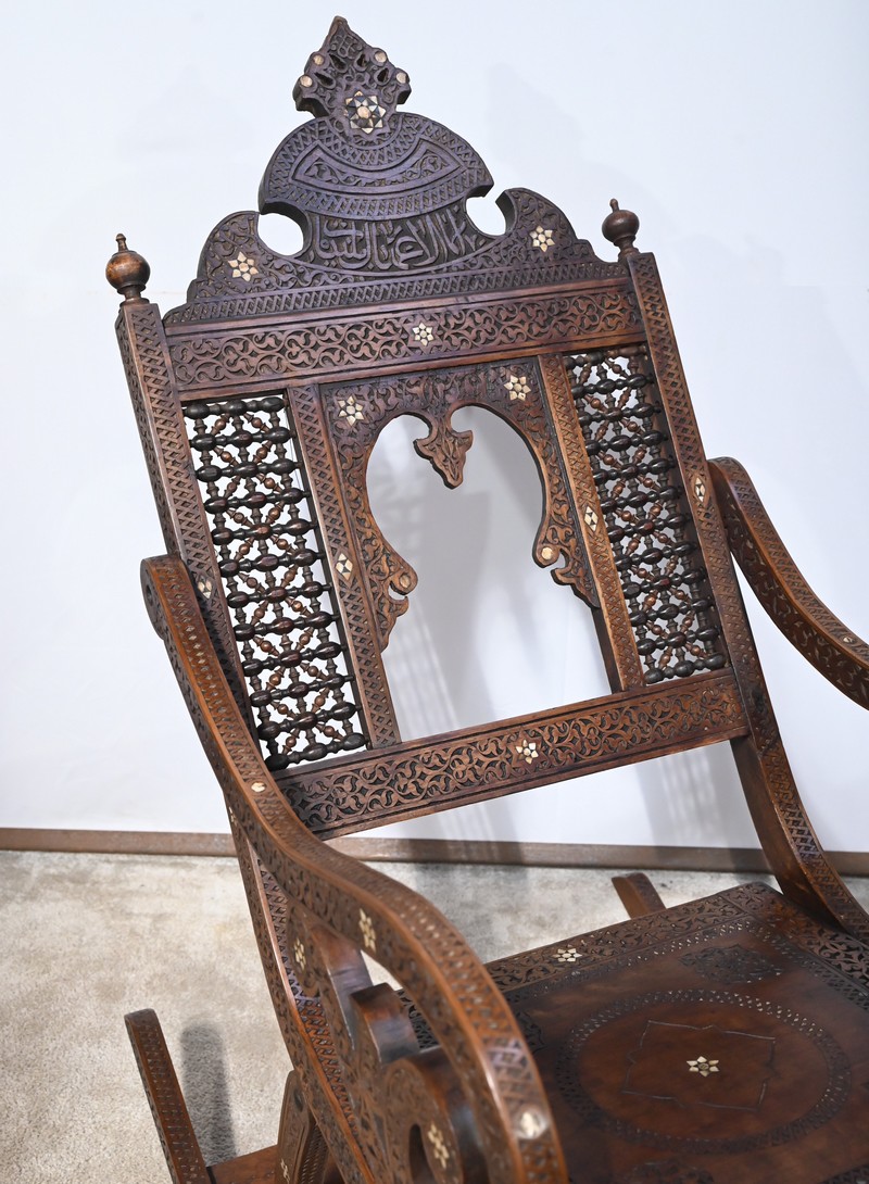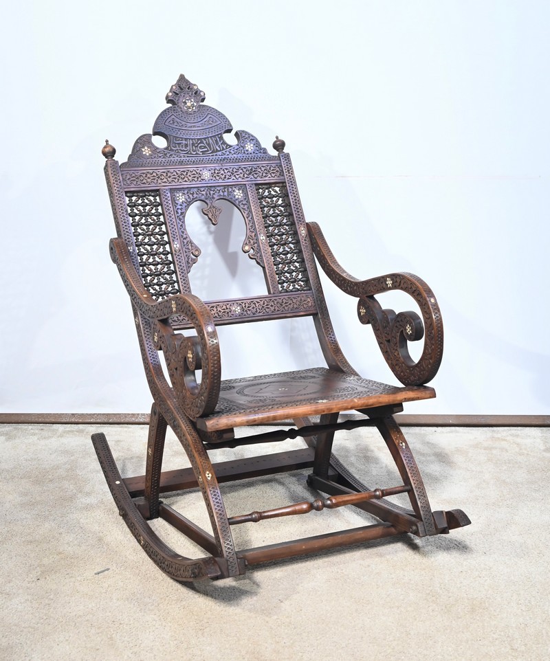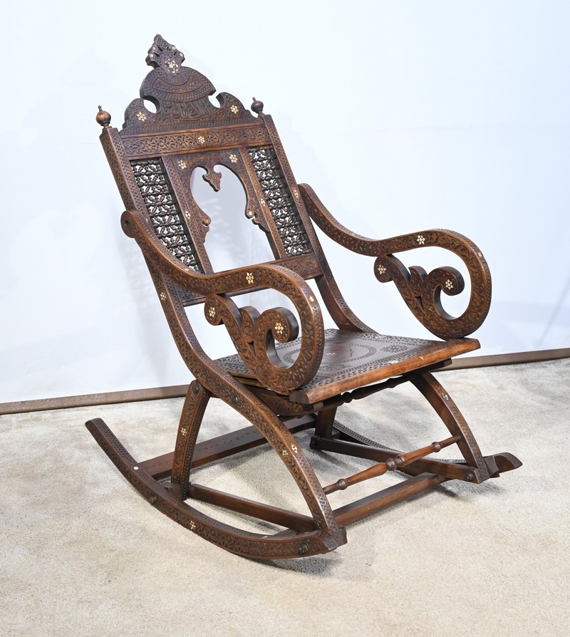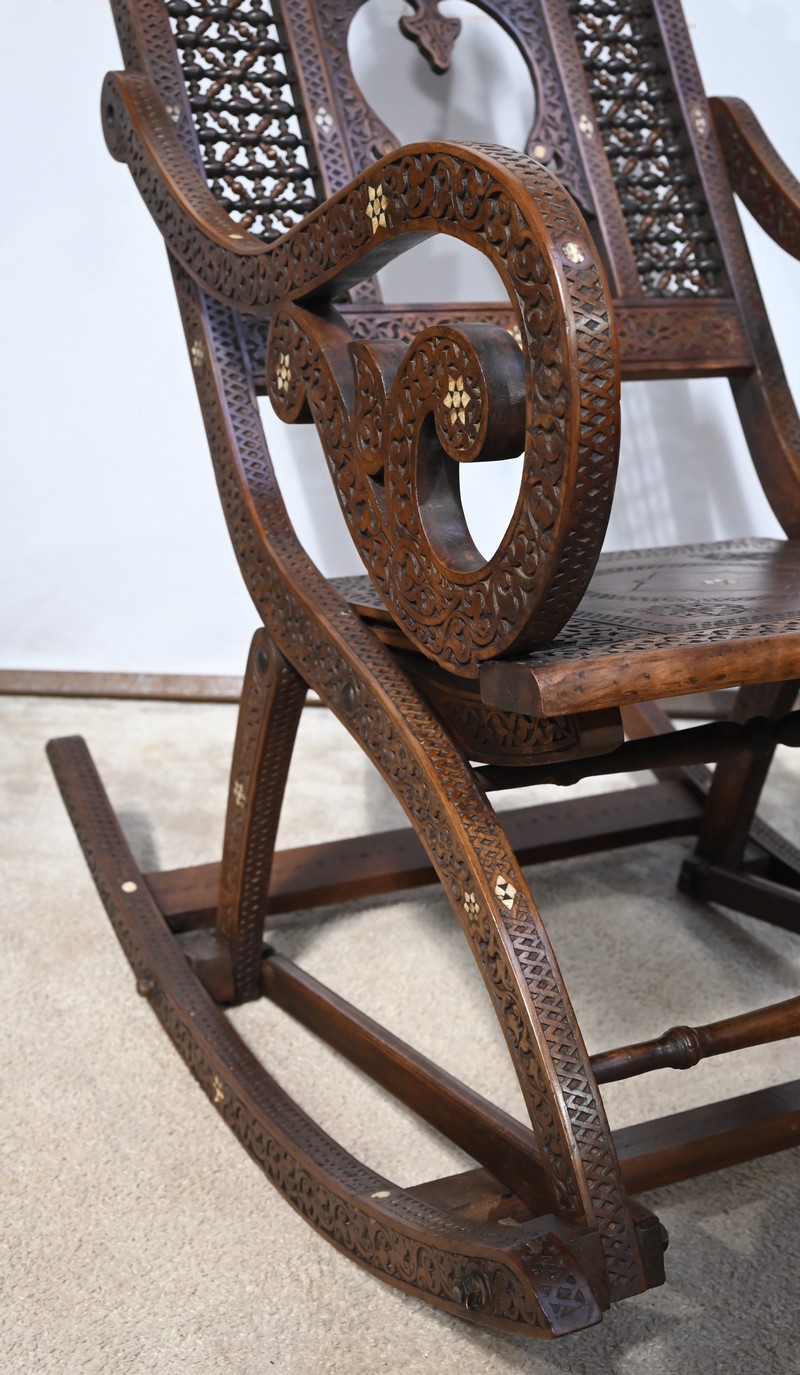 Fauteuil à bascule de type Rocking Chair en marqueterie syrienne de noyer.