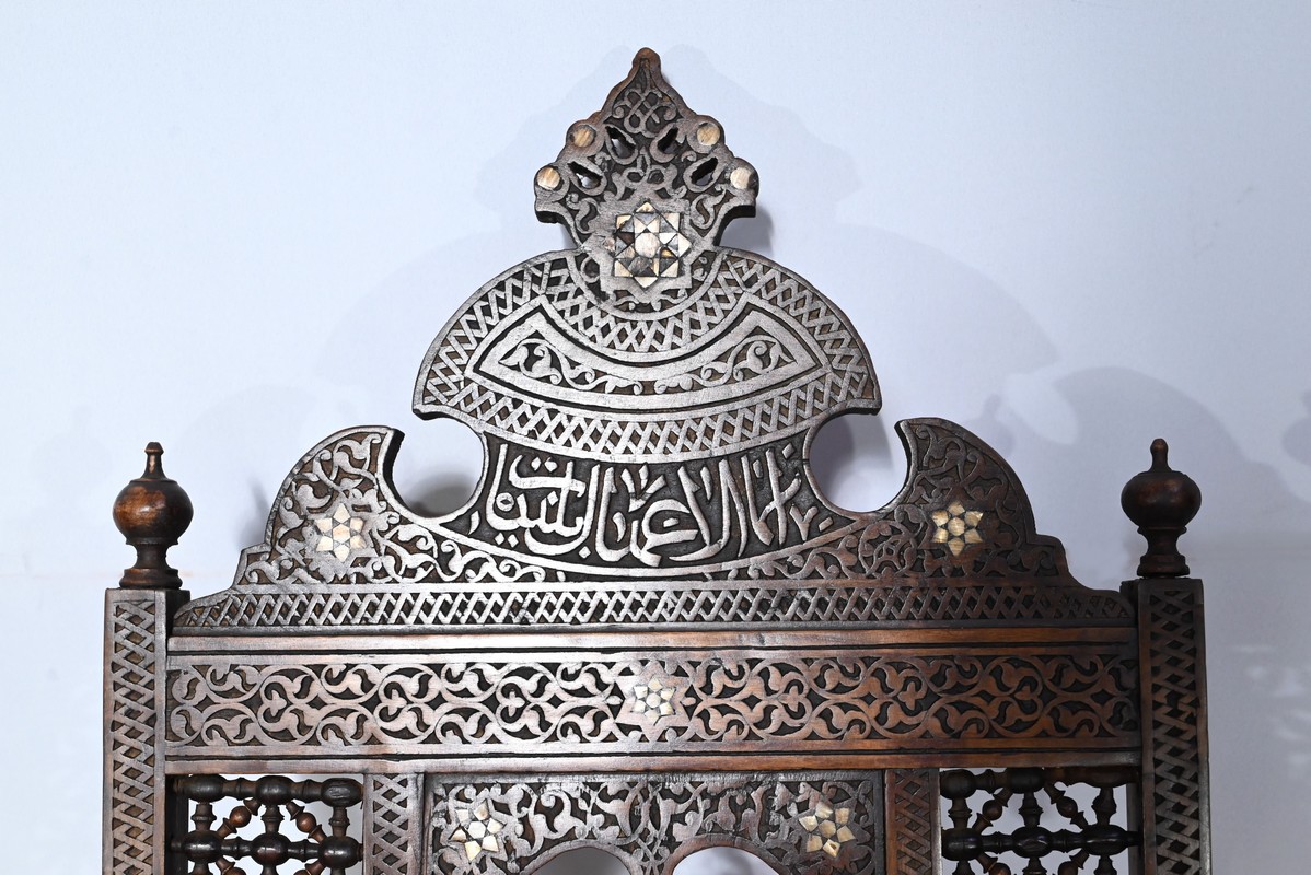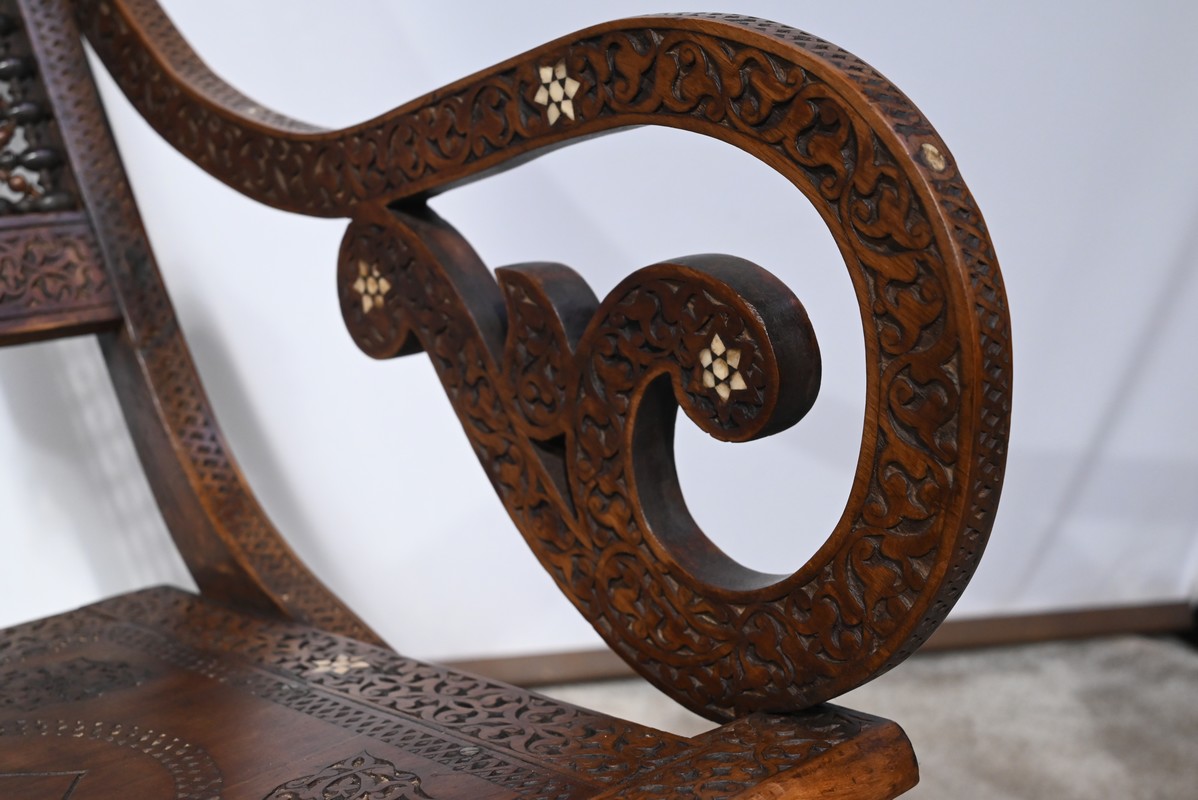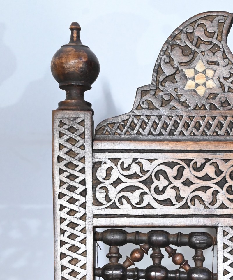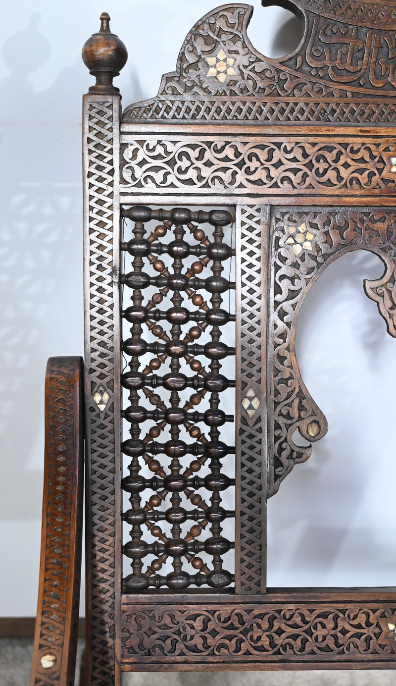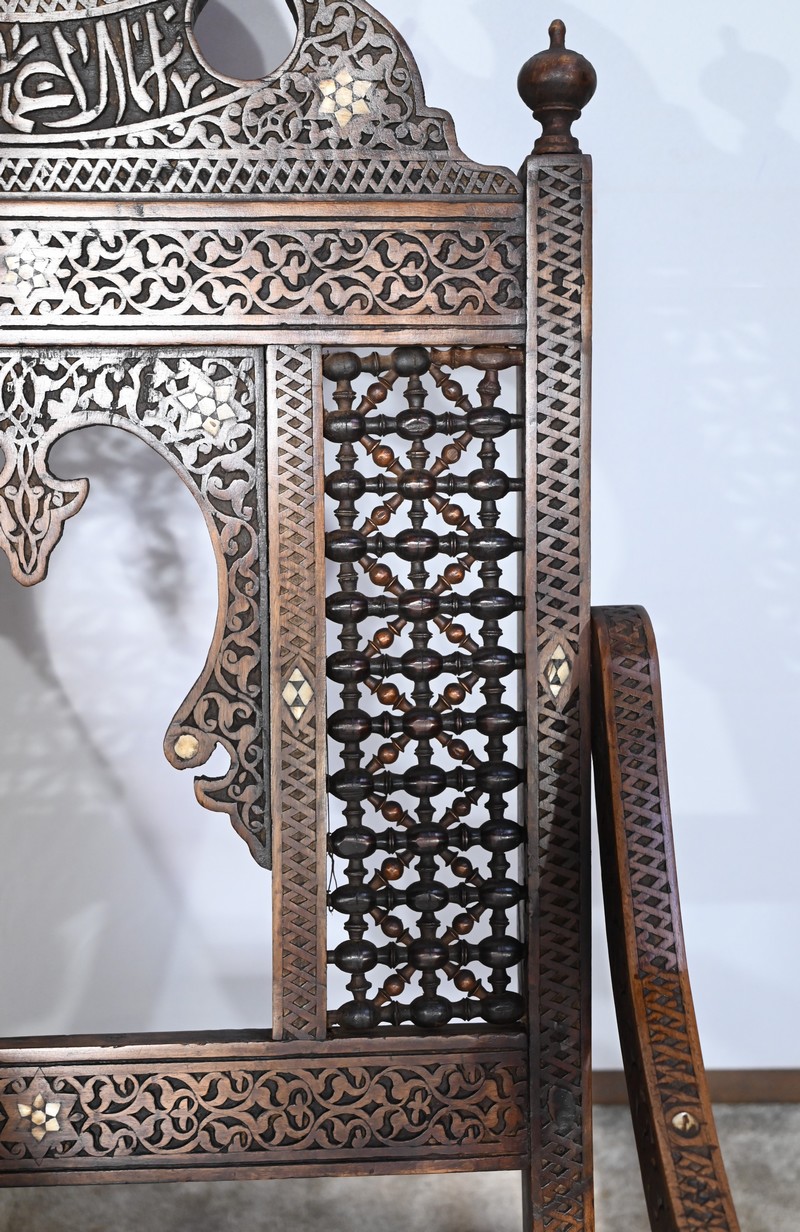 Ce fauteuil est intégralement sculpté de motifs islamiques et incrusté de nacre à motif d’étoile.