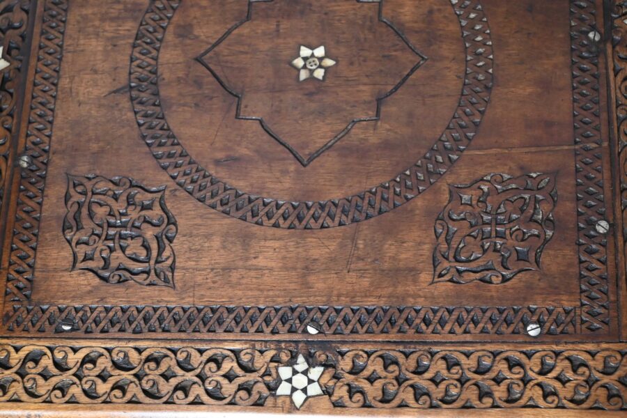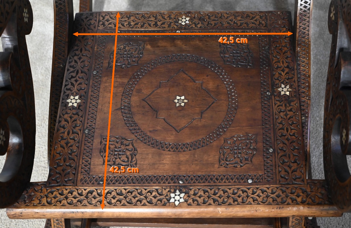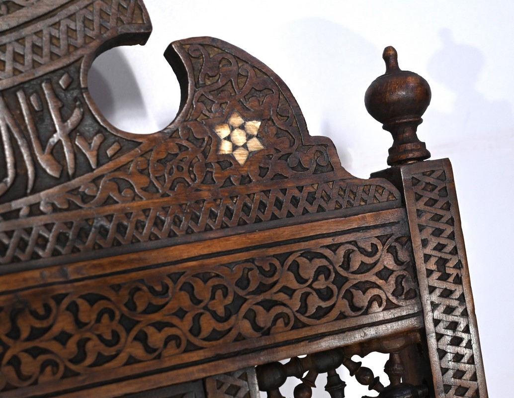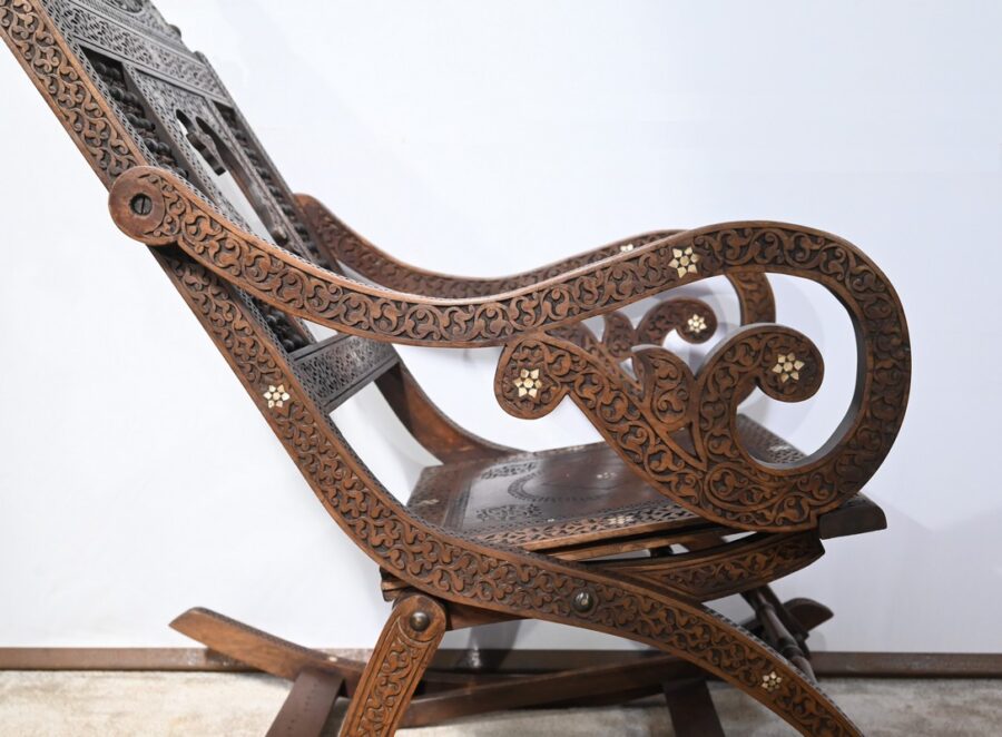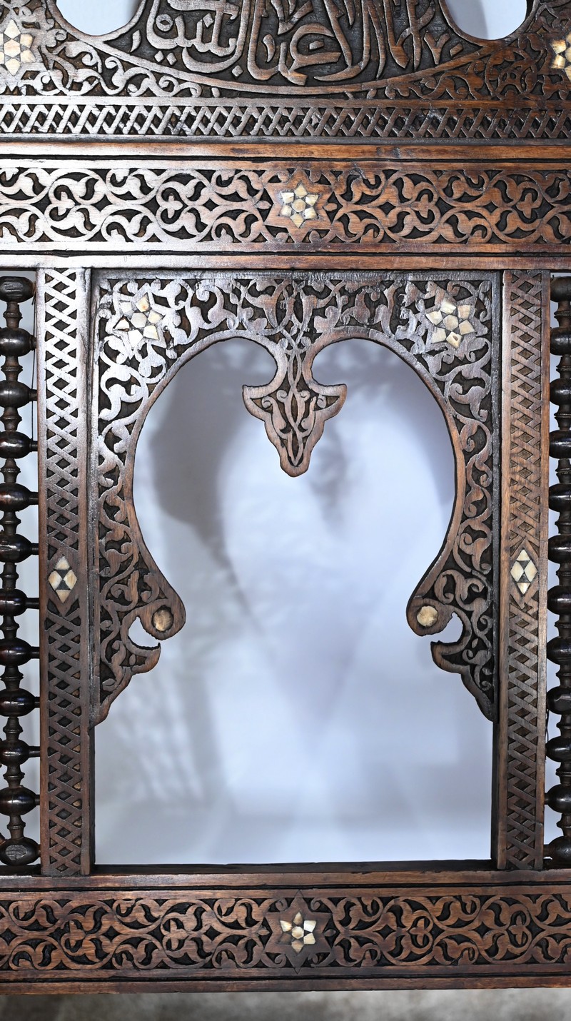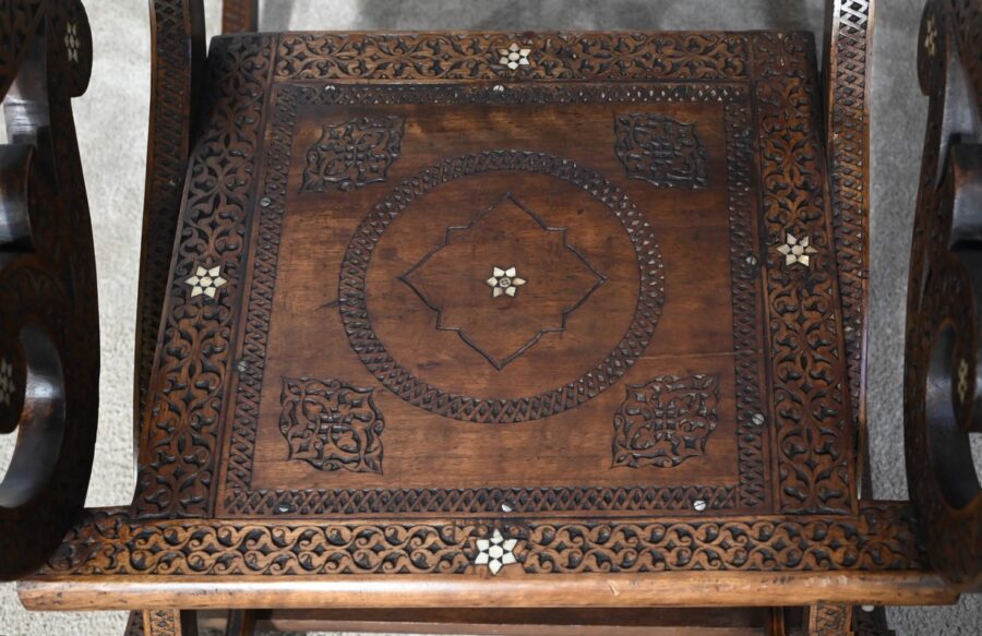 Ce fauteuil est intégralement sculpté de motifs islamiques et incrusté de nacre à motif d’étoile.