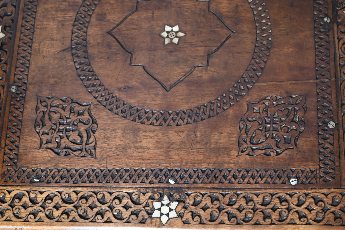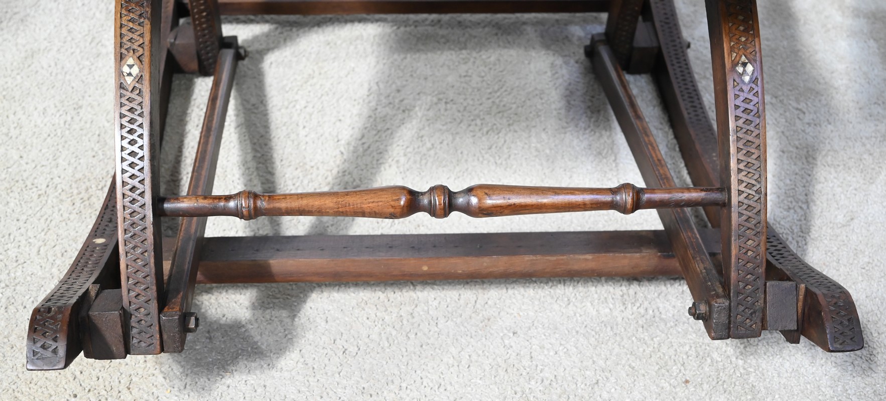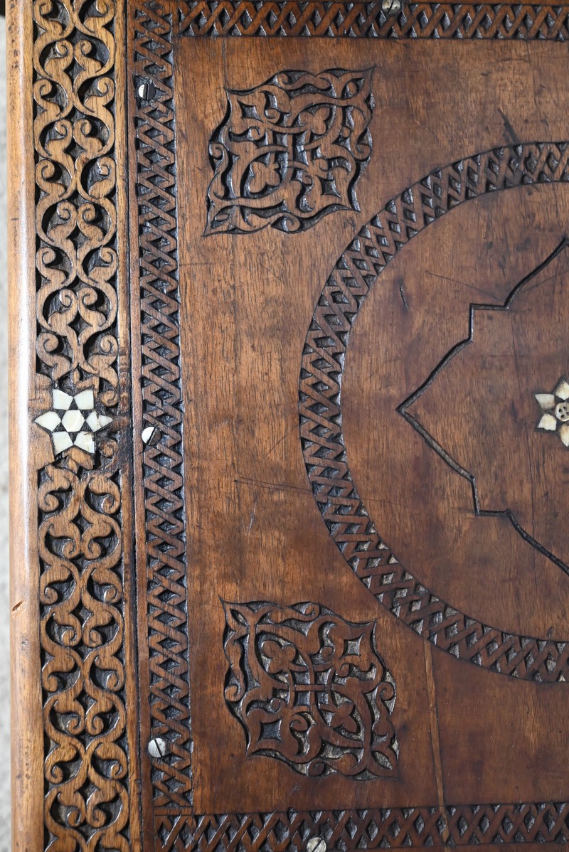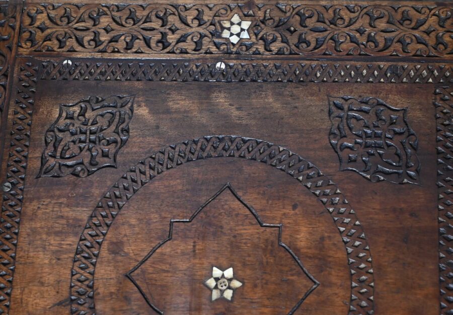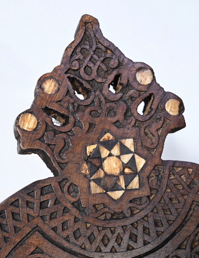 Ce fauteuil est intégralement sculpté de motifs islamiques et incrusté de nacre à motif d’étoile.