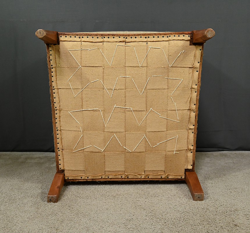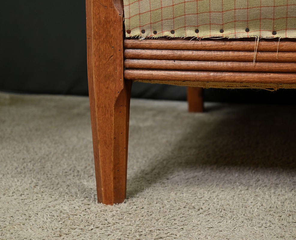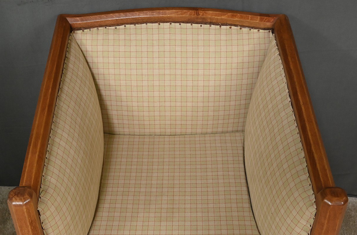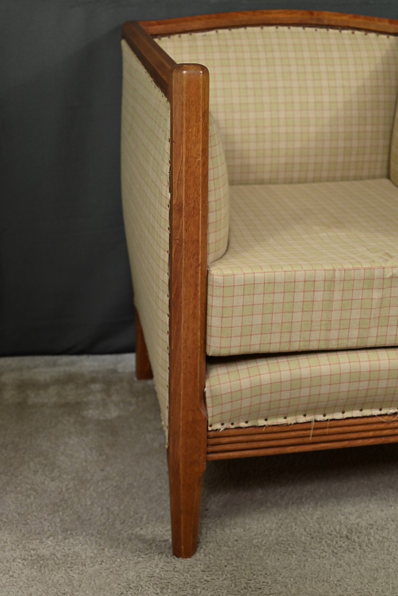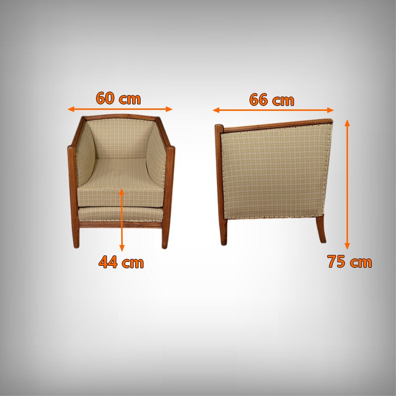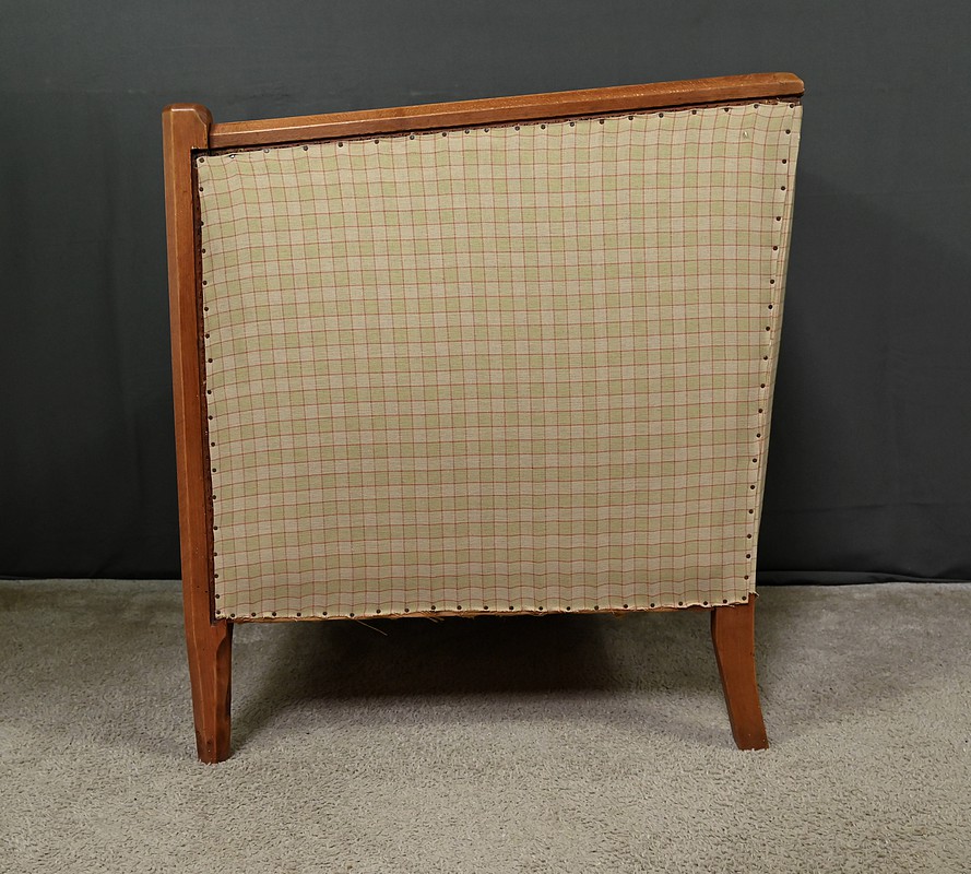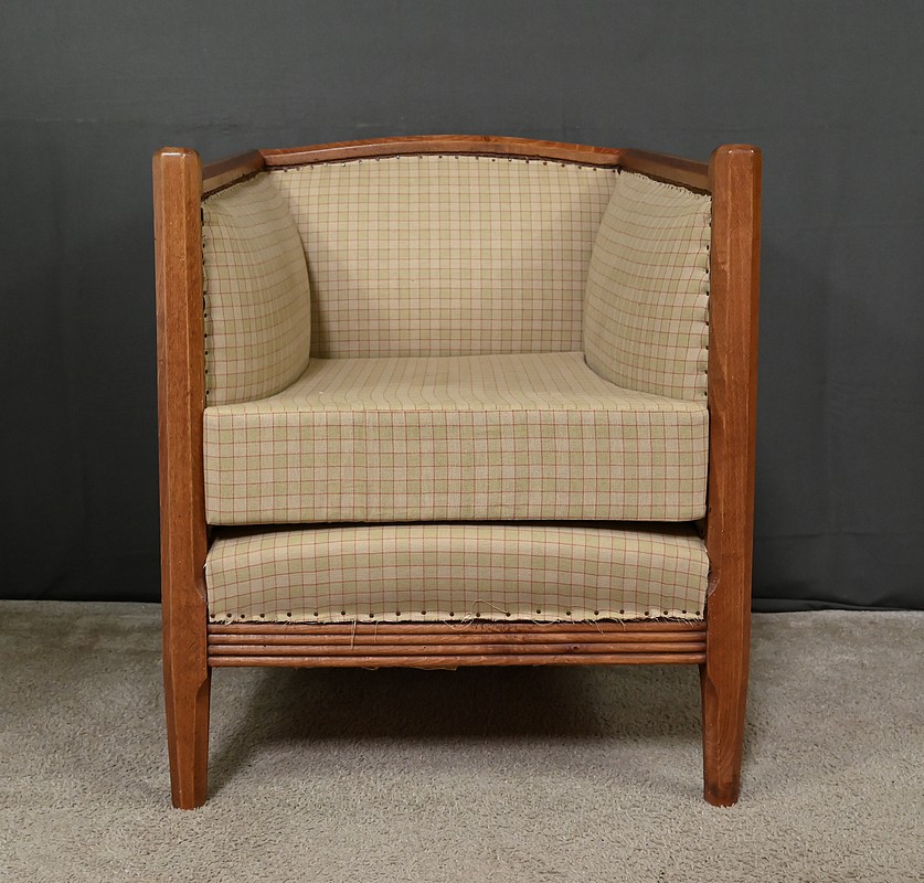 Ce fauteuil incarne l’élégance sobre et géométrique propre au style Art Déco des années 1930. Sa structure en hêtre teinté, aux lignes droites et anguleuses, témoigne d’un travail du bois précis et raffiné, typique de l’artisanat de l’époque. Le dossier légèrement incliné et les accoudoirs rectilignes offrent un confort discret, tout en affirmant une silhouette résolument moderne pour son temps. L’assise refaite et le dossier sont habillés d’un tissu à motif écossais dans des tons beige et brun clair qu’il conviendra de recouvrir du tissu de votre choix. Ce fauteuil, à la fois pièce de collection et objet de caractère, trouvera sa place dans un intérieur où l’histoire du design dialogue avec le contemporain.