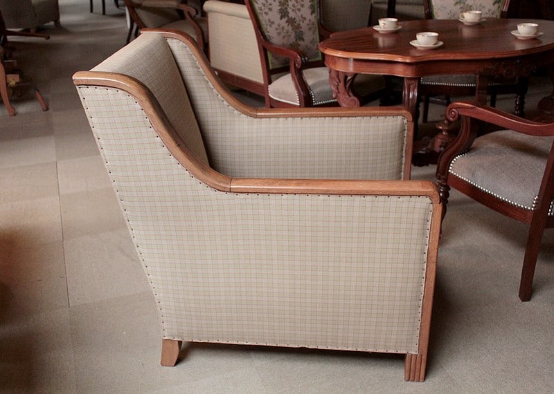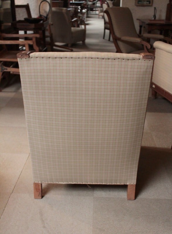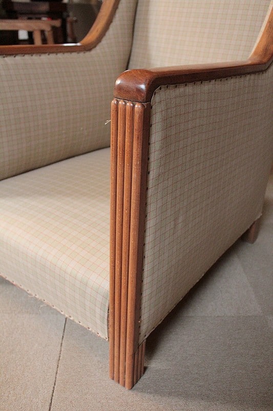 Fauteuil Art Déco en hêtre teinté des années 1930/1940. La tapisserie a été entièrement refaite à l’ancienne, avec crins et ressorts. Il reste le tissu final à poser.