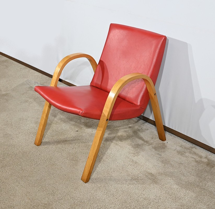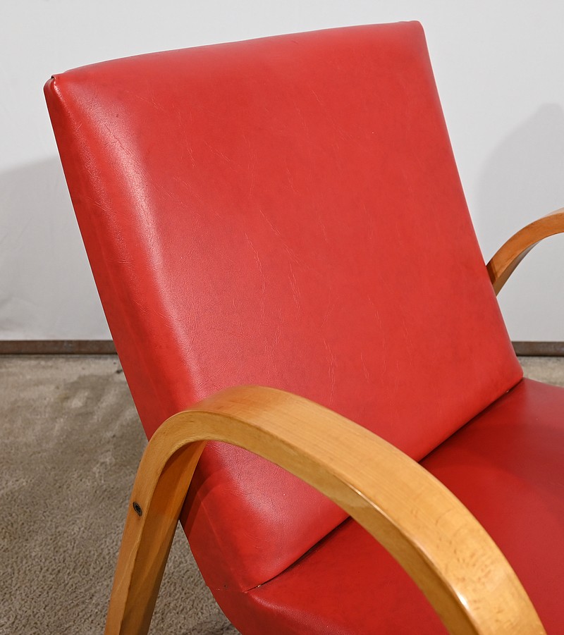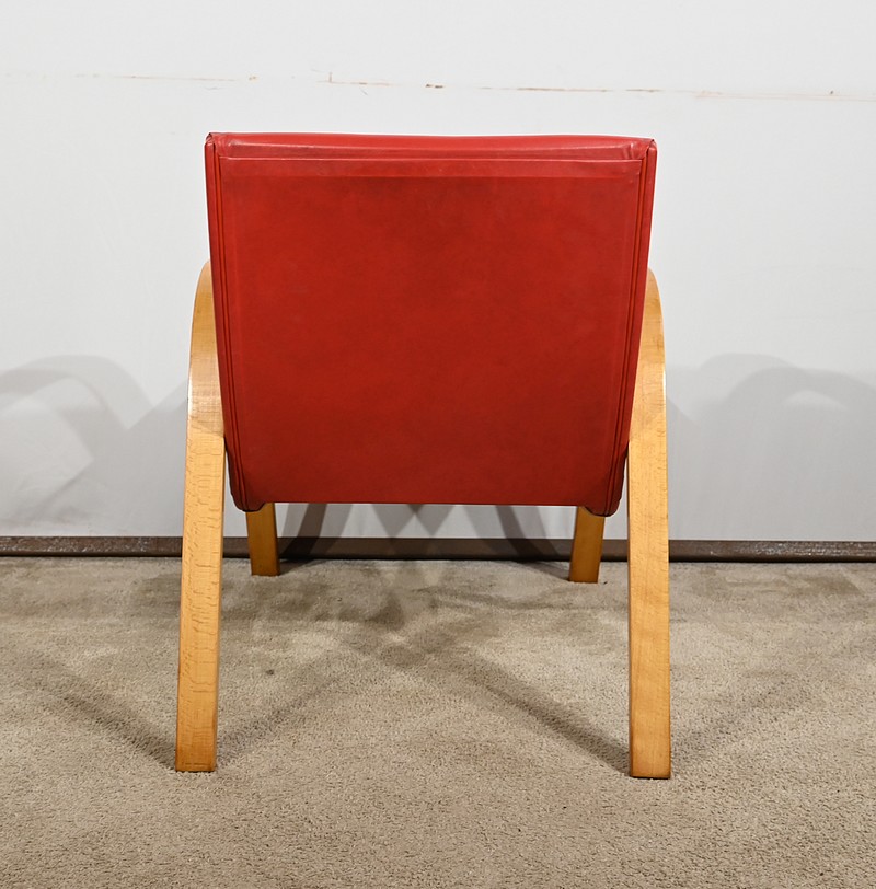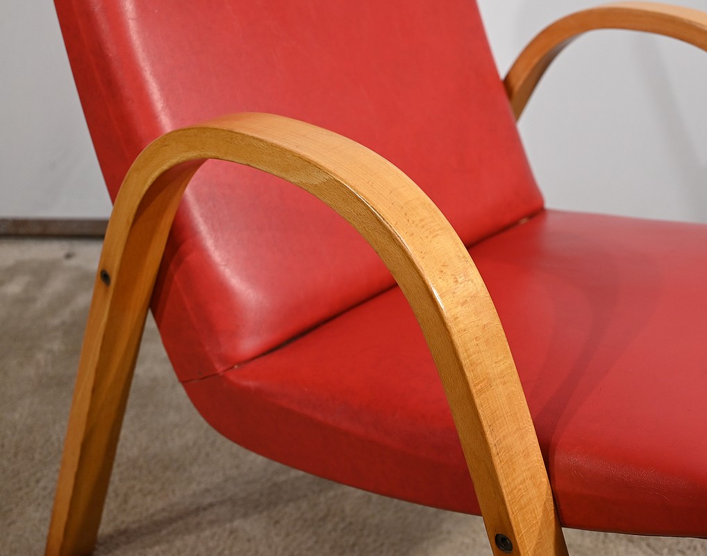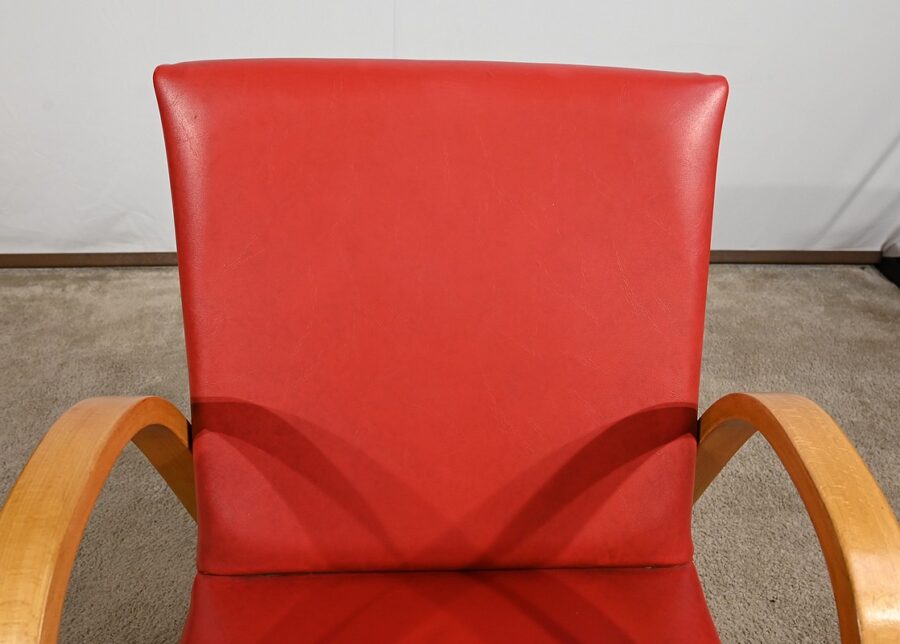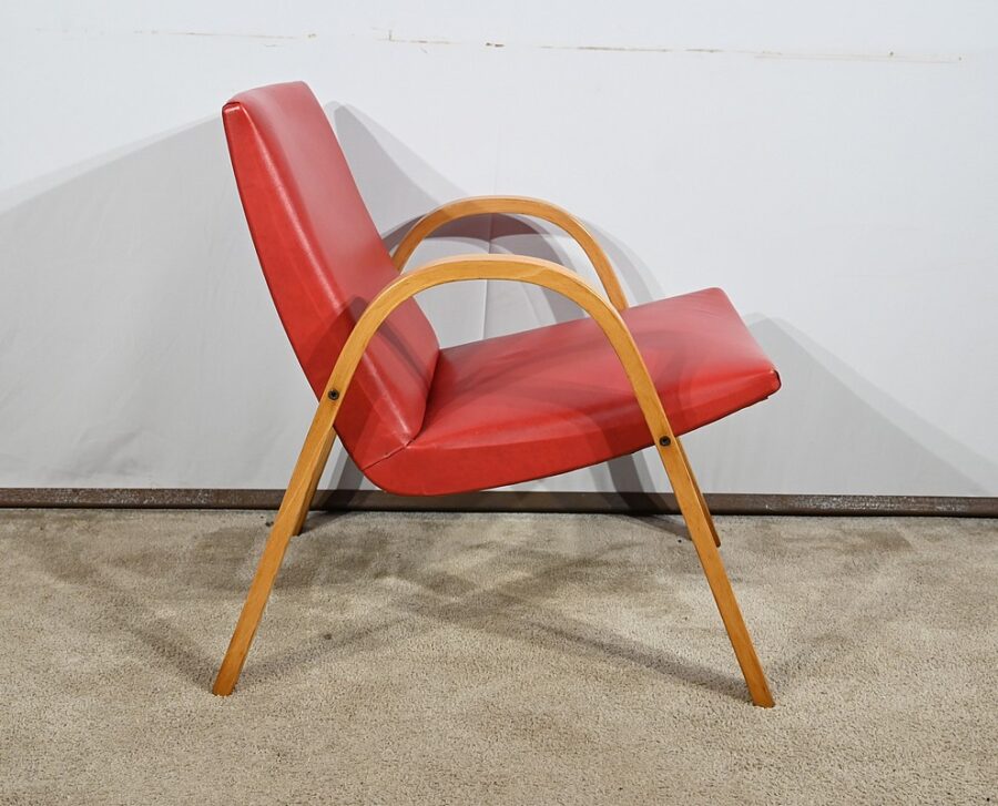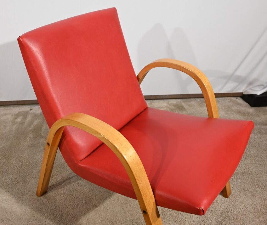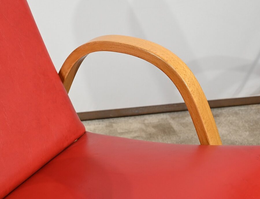 Fauteuil Bow Wood de Hugues Steiner des années 50. Ce siège de qualité est constitué d’une structure en hêtre courbé. Son piètement est travaillé d’une seule pièce en bois massif cintré qui vient former les accoudoirs. L’assise est garnie d’un simili cuir rouge en excellent état.