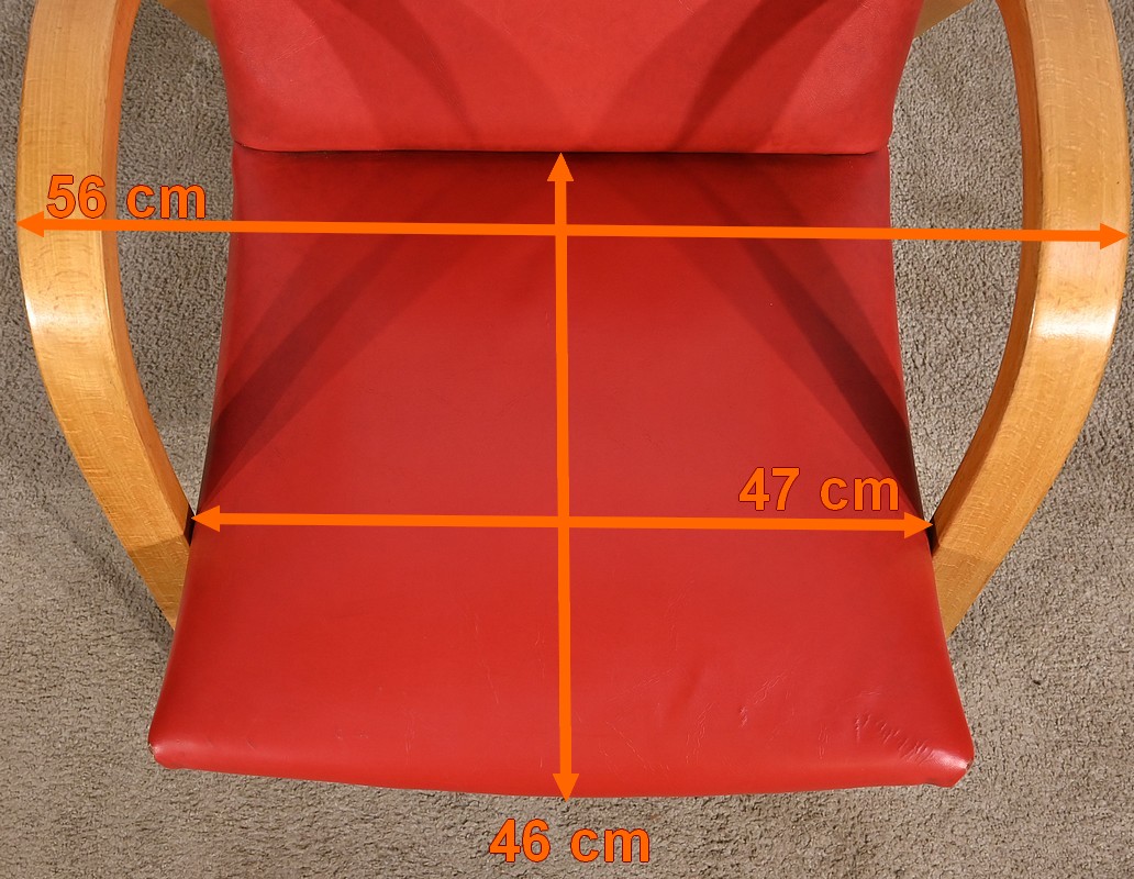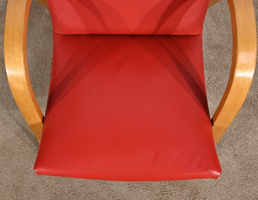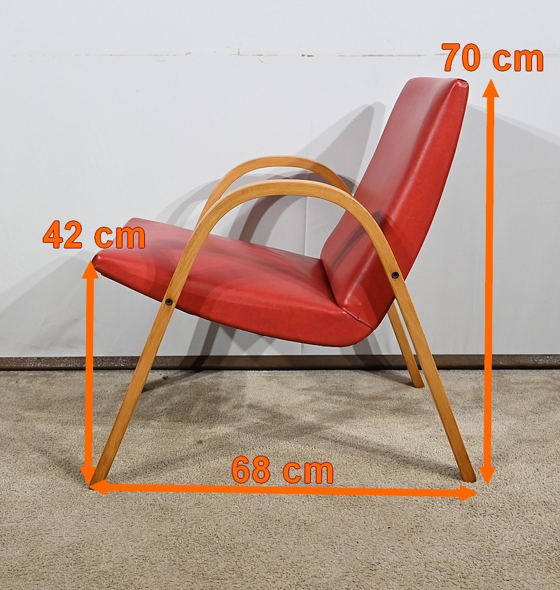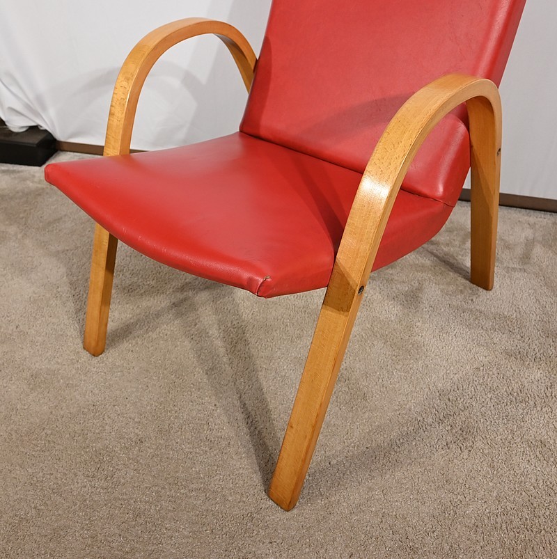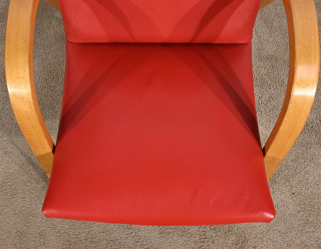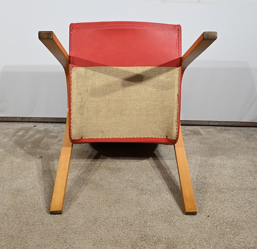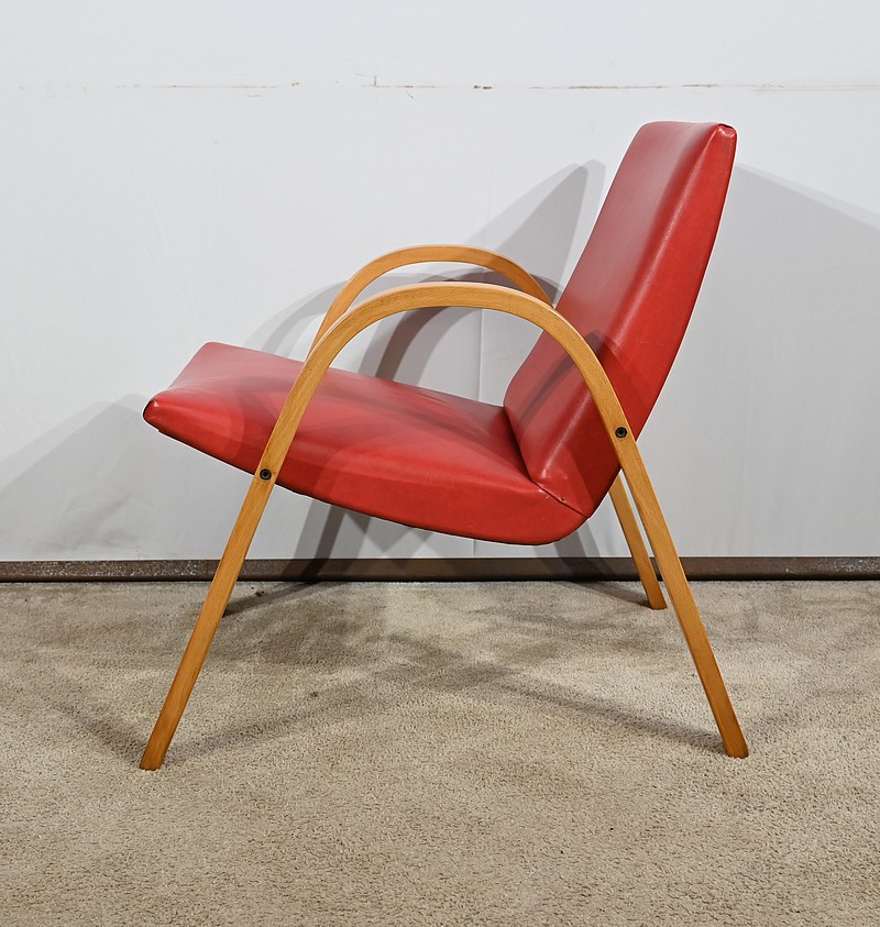 Fauteuil Bow Wood de Hugues Steiner des années 50. Ce siège de qualité est constitué d’une structure en hêtre courbé. Son piètement est travaillé d’une seule pièce en bois massif cintré qui vient former les accoudoirs. L’assise est garnie d’un simili cuir rouge en excellent état.